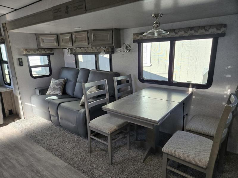 With a master suite up front and a set of lounge chairs in the back, this Arctic Fox North Fork travel trailer gives you comfortable accommodations so that you can enjoy resting after long days of activities. You can enter the front or back of this trailer because of the two entry doors that have been included, and with a pantry, linen closet and wardrobe slide, you'll have enough space to store all of your various belongings.