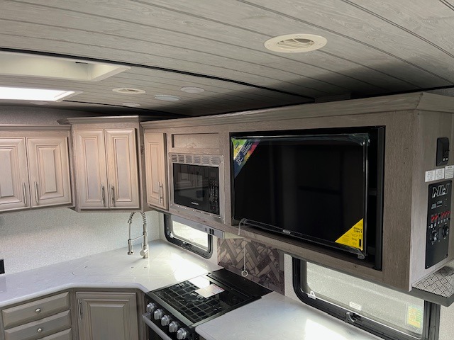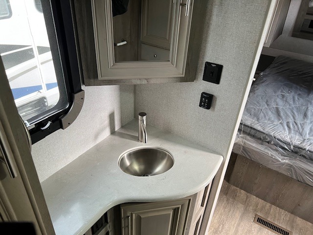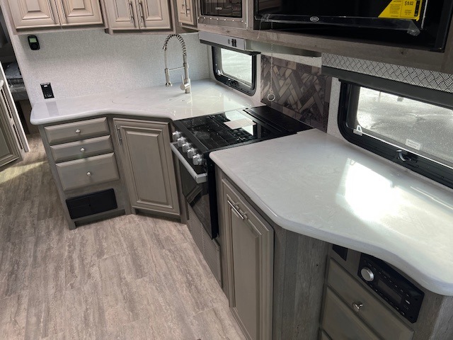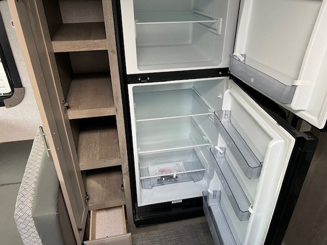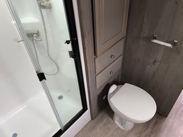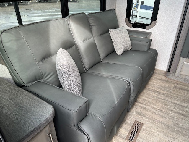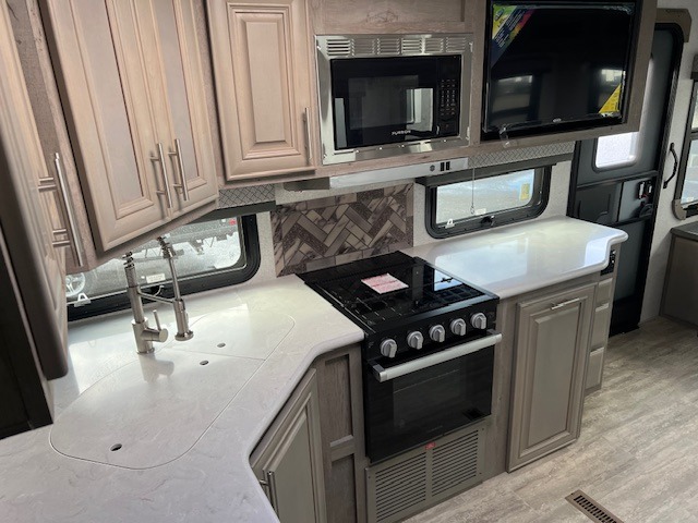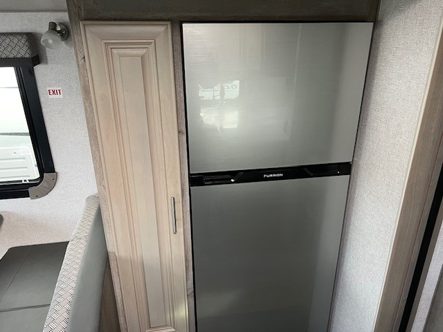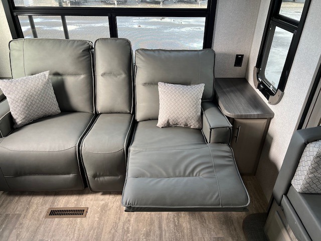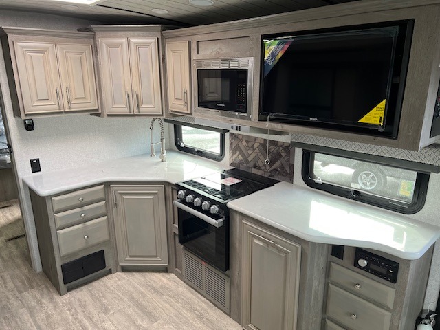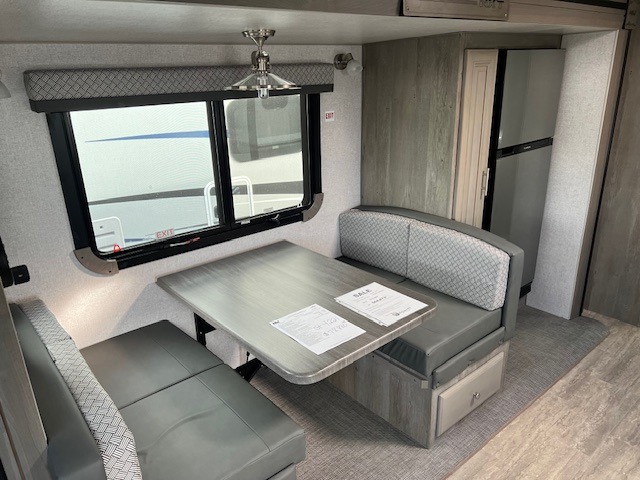 It will be so easy to enjoy camping trips in this spacious travel trailer for three to four. You will have the front master bedroom all to yourselves with one of the dual entry doors, a queen bed, wardrobe slide out, and quick access into the walk-through bath. A booth dinette can serve as dining space and sleeping space since it converts to a 40" x 74" sleeping space for one adult or two little ones. The fully-equipped kitchen includes a three burner range, residential-style microwave with an air fryer, plus a pantry and 10 cu. ft. 12V refrigerator for food storage. After dinner is clean up, you can relax on the rear theater seating and watch a movie on the 32" 12V TV, or head outdoors to relax under the 18' LED awning!