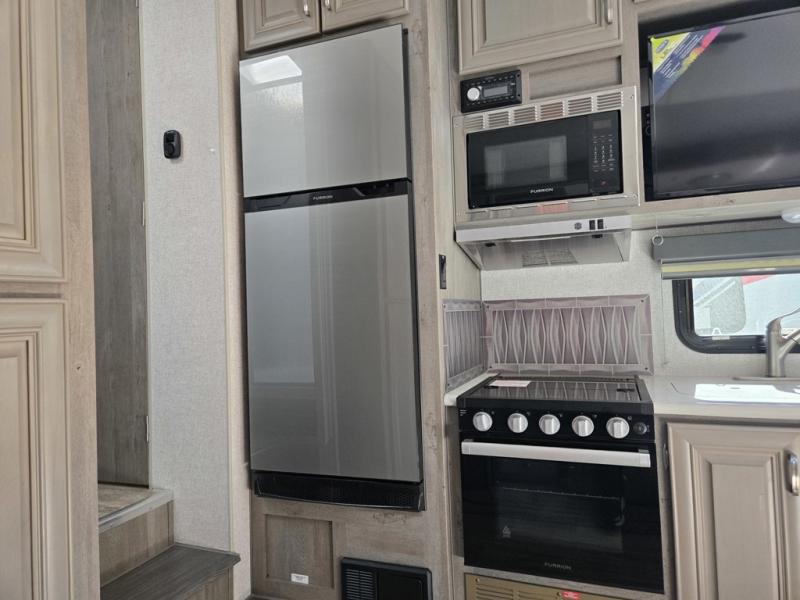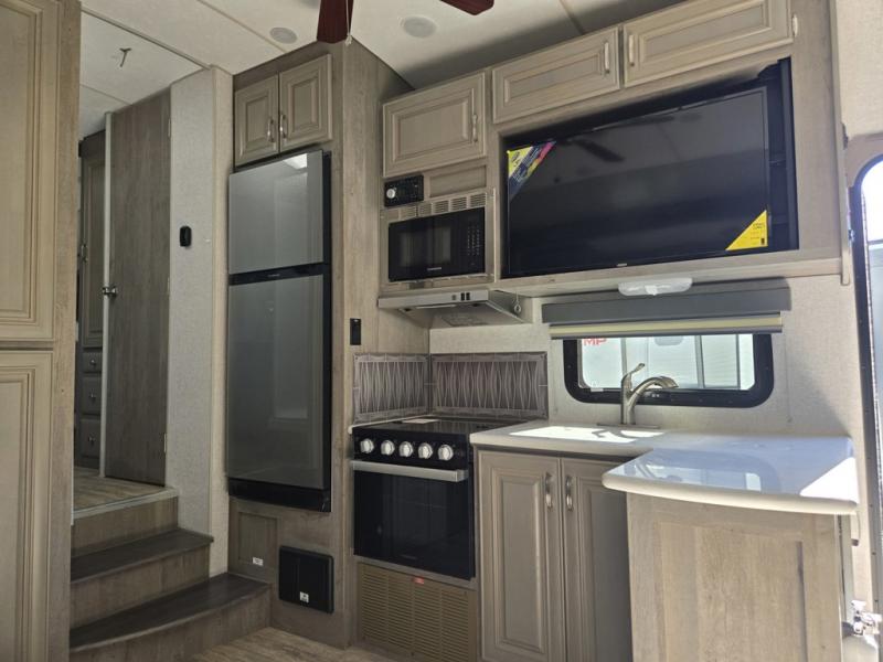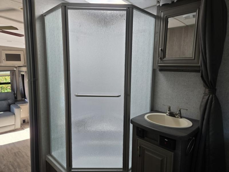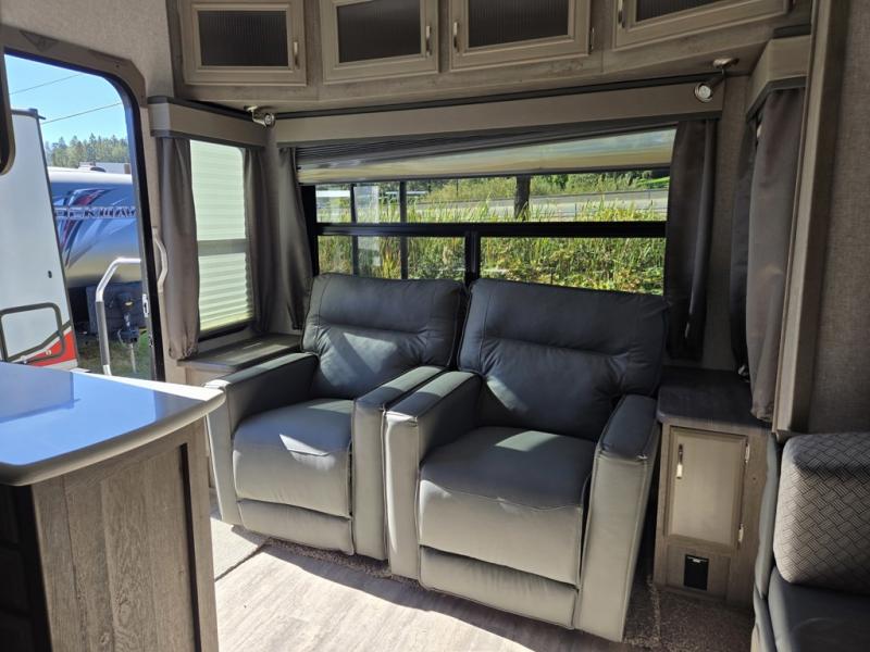 Extended stays and weekend camping trips are made complete with this fifth wheel in tow! A three burner range and residential-style microwave/air fryer will let you make lunch once you've set up camp, and there is a booth dinette slide where you can dine together. Your guests can sleep here since the dinette converts to a 40" x 72" sleeping area, or they can take the rear jackknife sofa. The jackknife sofa can also be switch out for optional lounge recliners if you don't need the extra sleeping space! The full bath features a private toilet so two people can use this room at once, and the queen bed in the front master bedroom is sure to bring a great night's rest!
