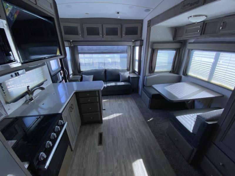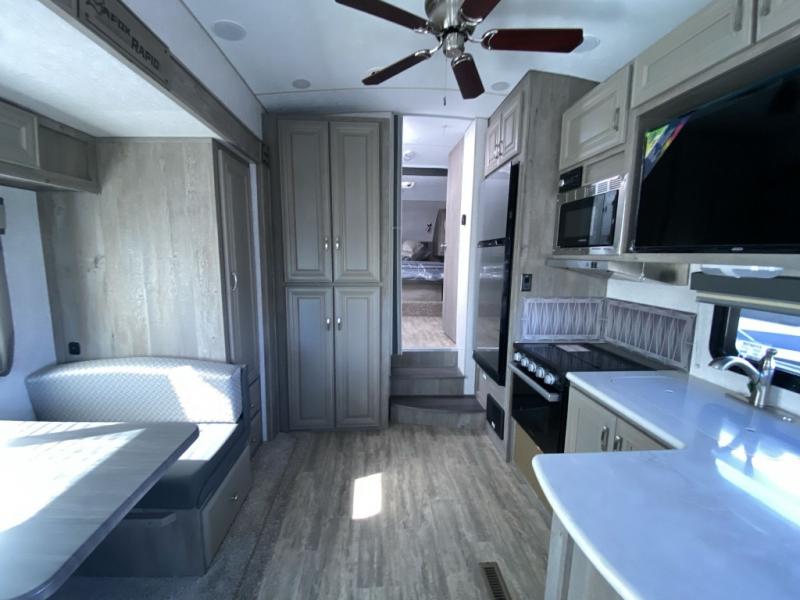 Extended stays and weekend camping trips are made complete with this fifth wheel in tow! A three burner range and residential-style microwave/air fryer will let you make lunch once you've set up camp, and there is a booth dinette slide where you can dine together. Your guests can sleep here since the dinette converts to a 40" x 72" sleeping area, or they can take the rear jackknife sofa. The full bath features a private toilet so two people can use this room at once, and the queen bed in the front master bedroom is sure to bring a great night's rest!