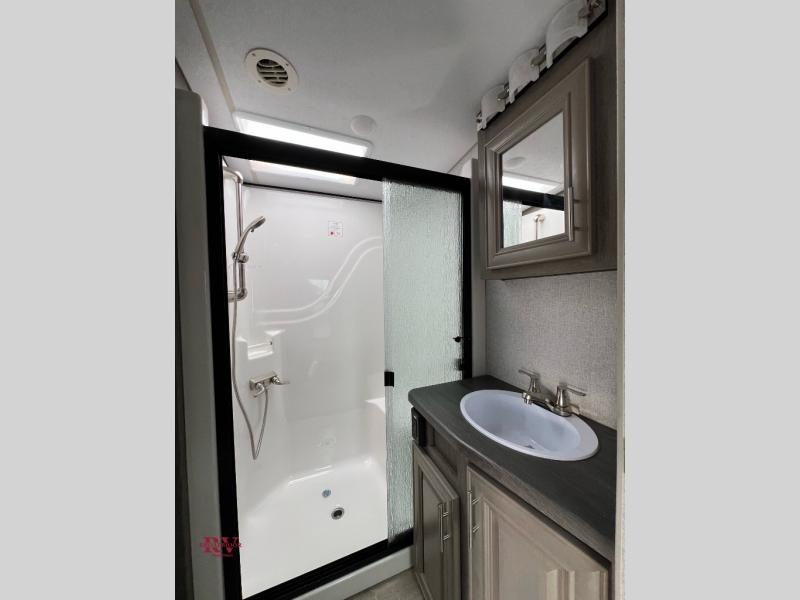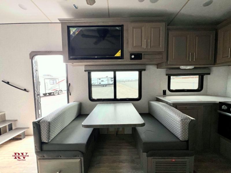 Pack your bags and head to your local state park for fun trips in this rear kitchen travel trailer. There is a three burner range and residential style microwave with an air fryer to whip up your best meals, and you're sure to appreciate the generous counter space. The mudroom bench provides a place to pull your hiking boots off, and the pantry lets you keep snacks stocked. This space also includes a booth dinette that converts to a 40" x 76" sleeping area for guests plus theater seating within a slide for more comfort and space. A spacious full bath will let you freshen up after a day outdoors, and a front private bedroom will make you feel right at home. There is a queen bed here, along with dual bedside wardrobes and a wardrobe slide for more space when getting dressed in the morning!