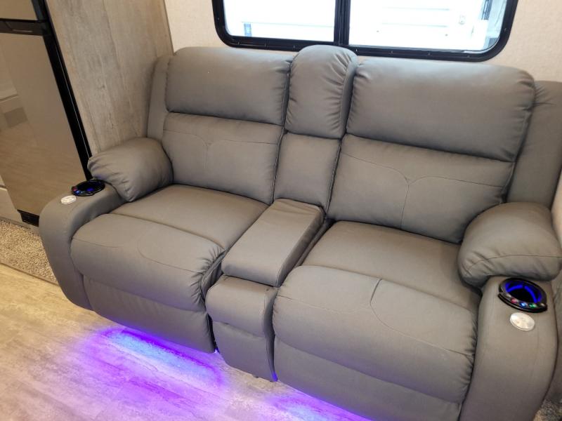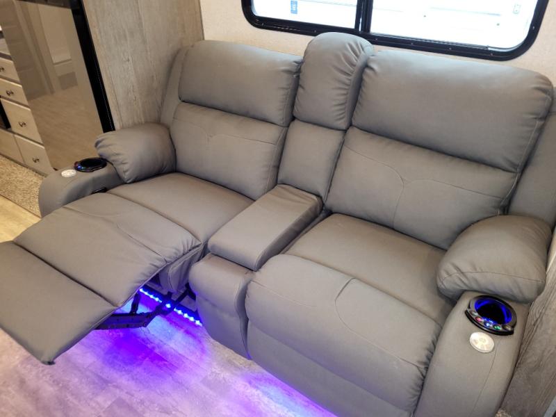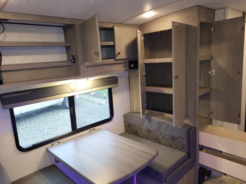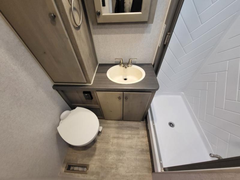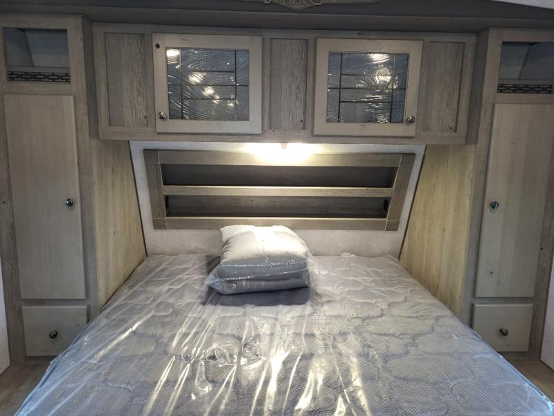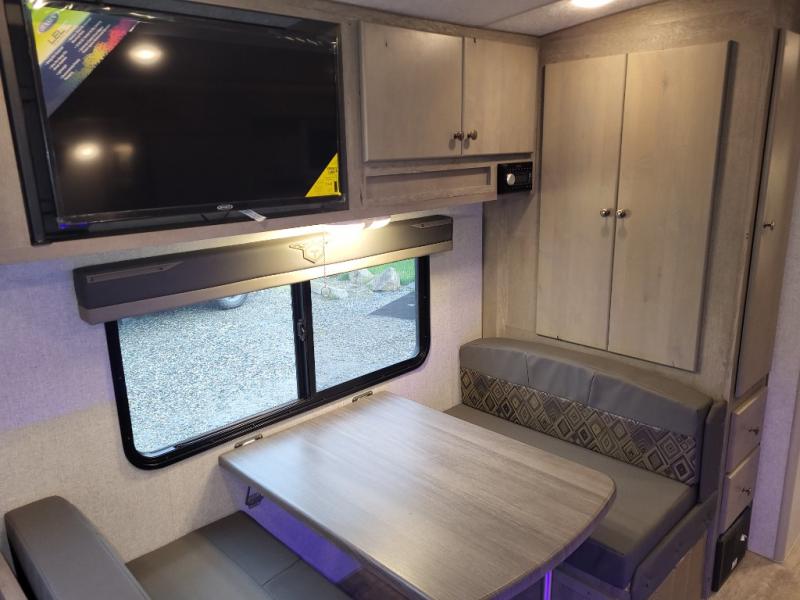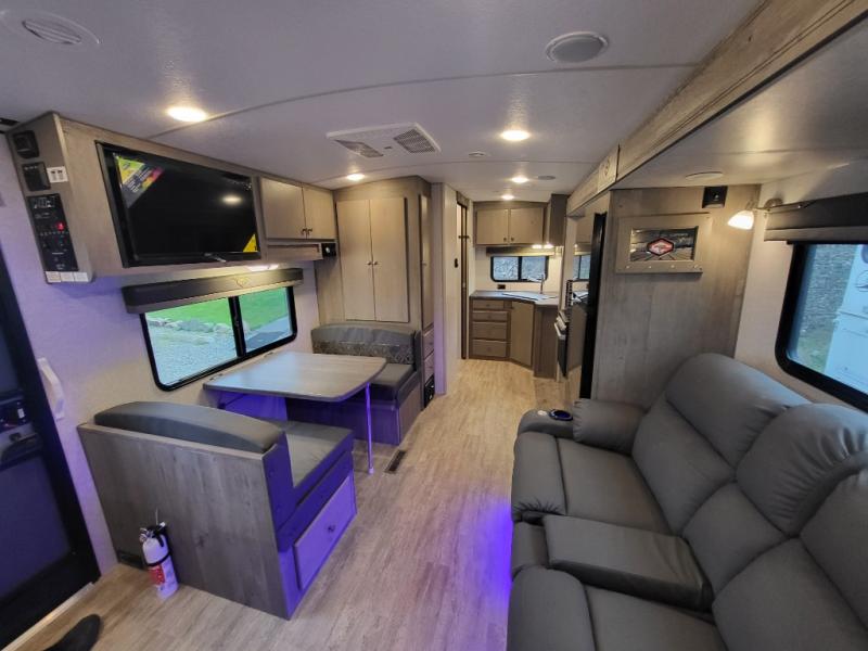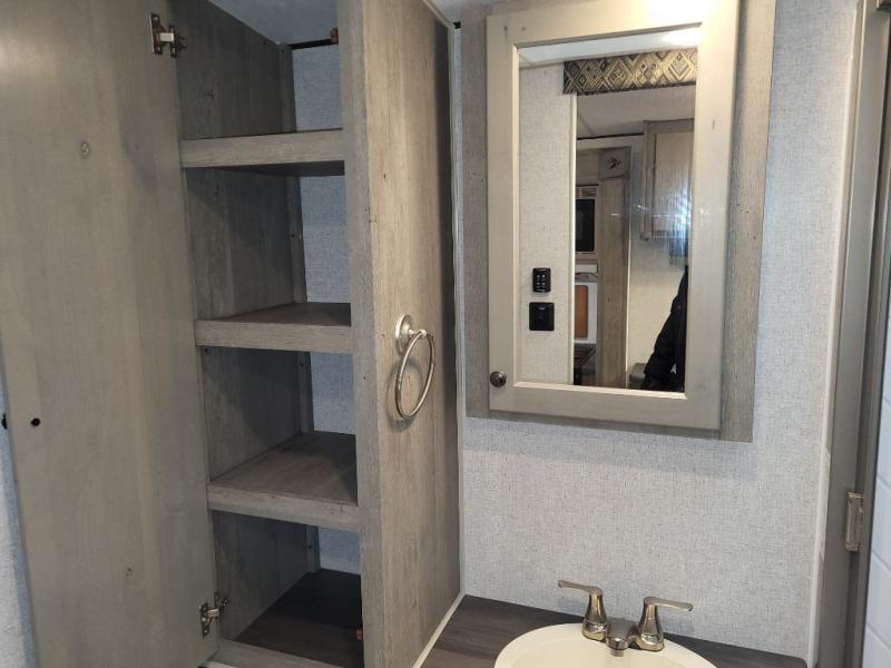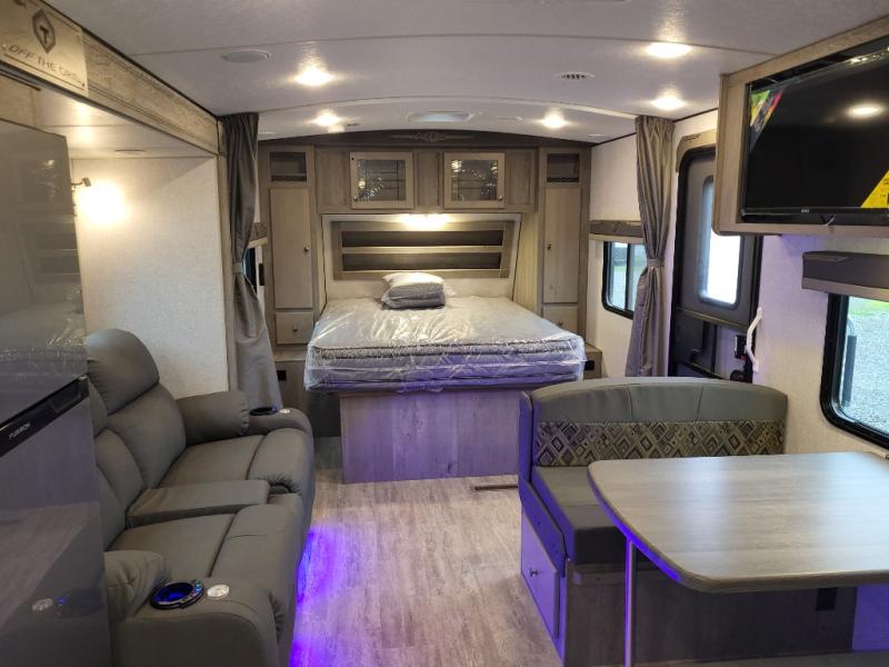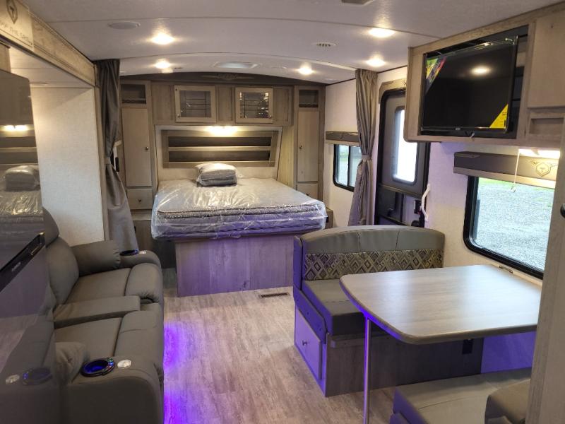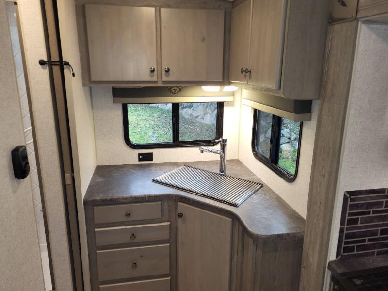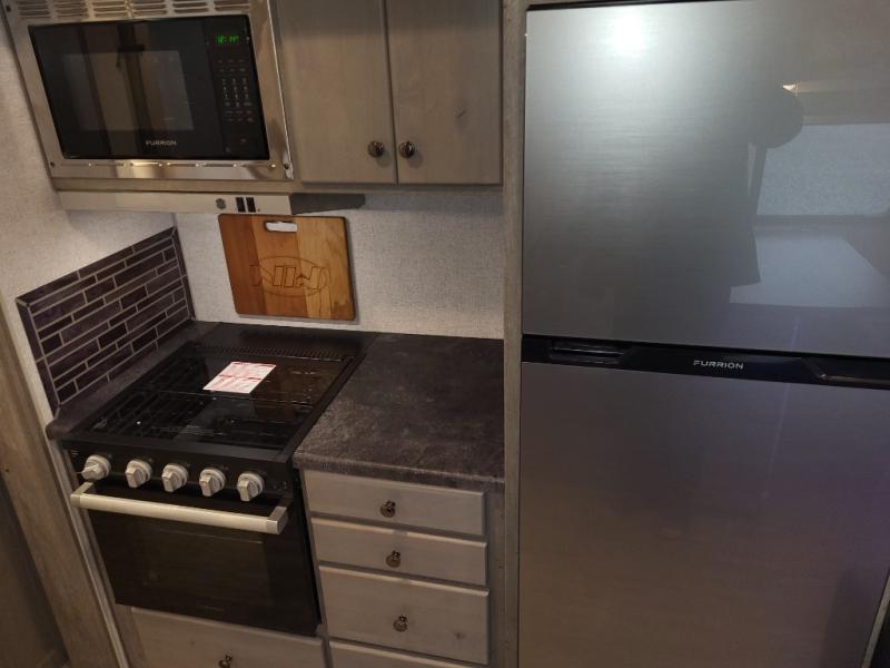 Escape to the campground in this travel trailer for three to four. The front queen bed includes dual wardrobes to keep your clothes tidy and overhead cabinets for your belongings. You can relax on the theater seating within the large slide out, and the booth dinette can convert to a 40" x 75" sleeping area for guests. The rear of this unit is shared with the full bath and the kitchen counter with a stainless steel sink. You can prepare meals on the three burner range and keep food fresh in the 10 cu. ft. 12V refrigerator.