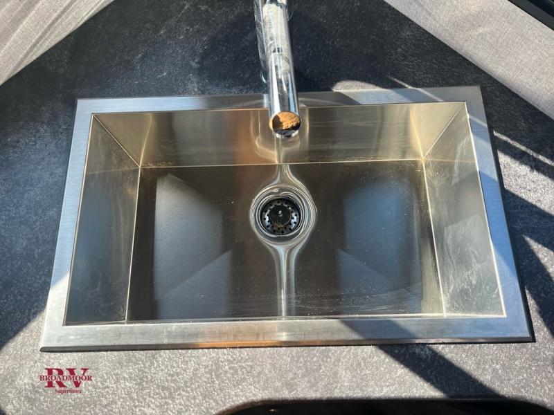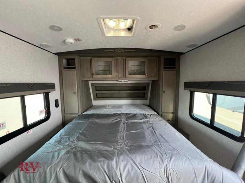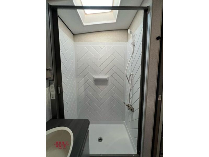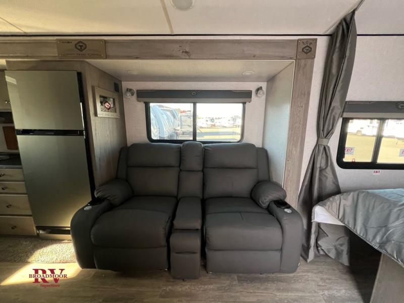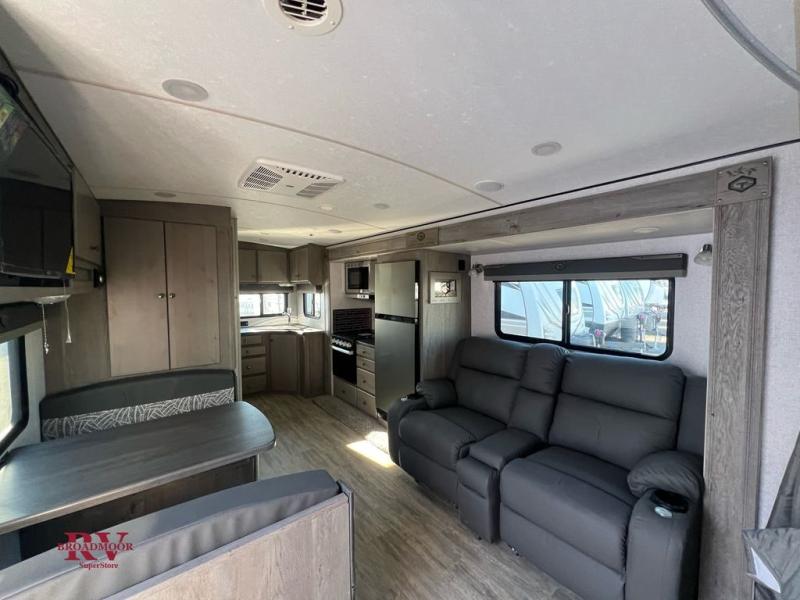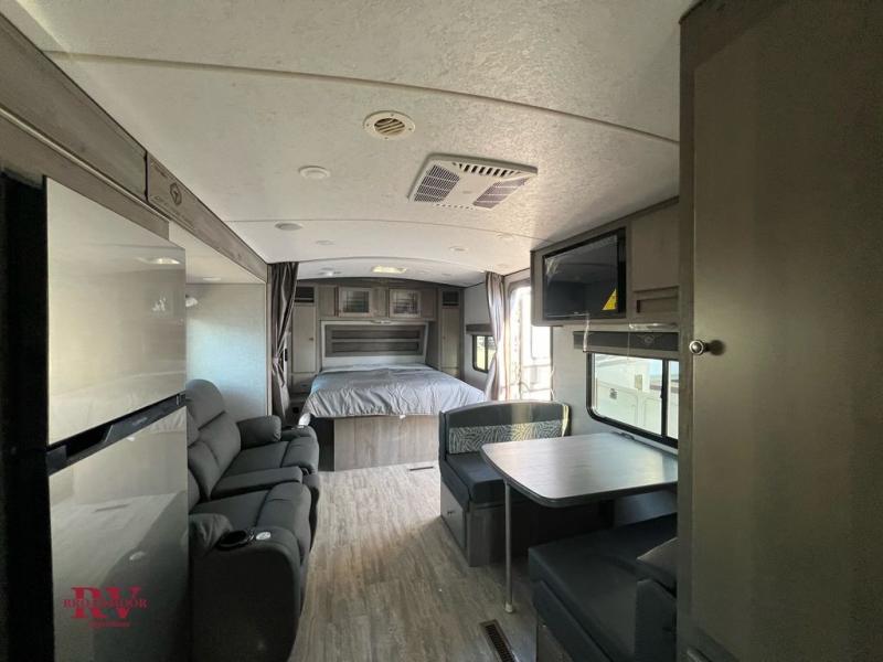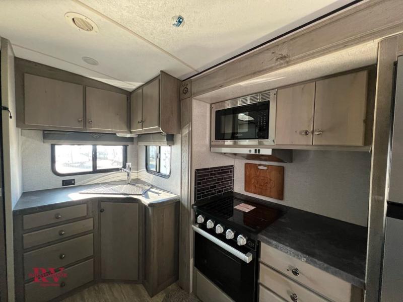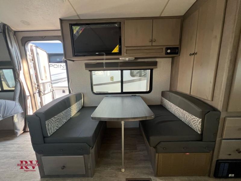 Escape to the campground in this travel trailer for three to four. The front queen bed includes dual wardrobes to keep your clothes tidy and overhead cabinets for your belongings. You can relax on the theater seating within the large slide out, and the booth dinette can convert to a 40" x 75" sleeping area for guests. The rear of this unit is shared with the full bath and the kitchen counter with a stainless steel sink. You can prepare meals on the three burner range and keep food fresh in the 10 cu. ft. 12V refrigerator.