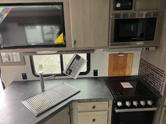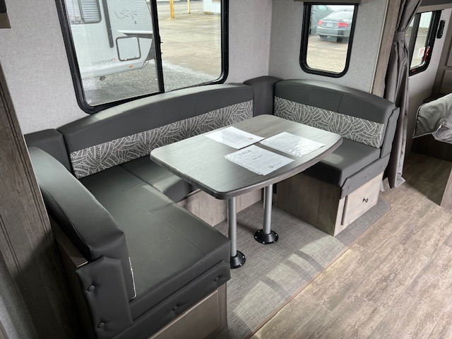 This is the perfect couple's trailer with space for an overnight guest or two on the U-shaped dinette slide. The kitchen also offers two pantries for dry goods and overhead storage for dishes and such as well as a 10 cu. ft. 12V refrigerator to store your cold items. Outside you will enjoy features like the 12V LED awning to protect you from the sun while you watch the kids play and the outdoor shower for them to rinse off before going inside.