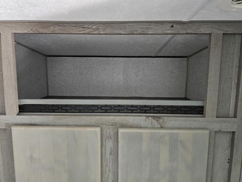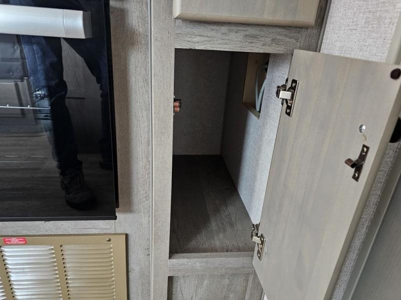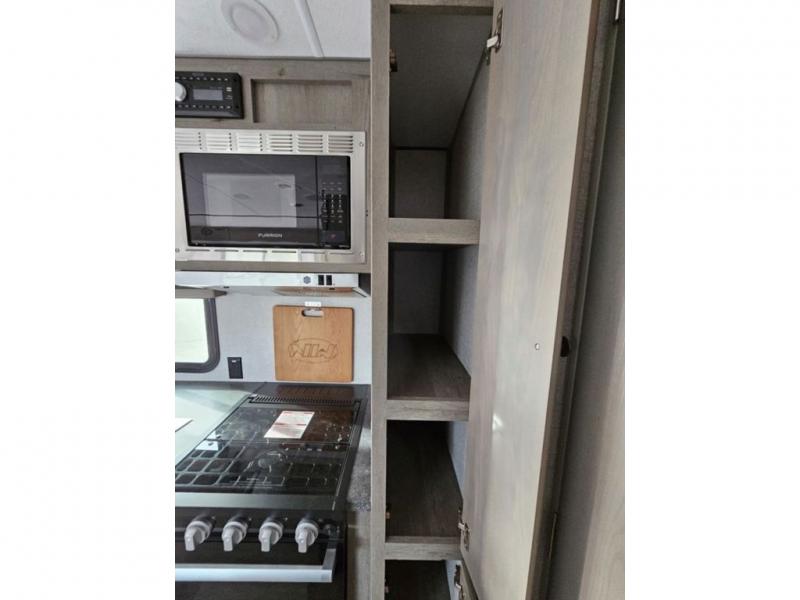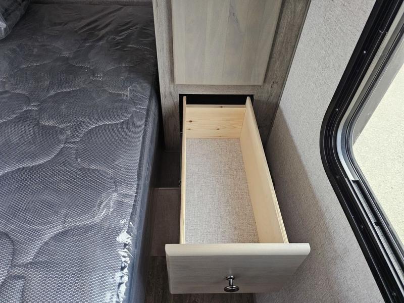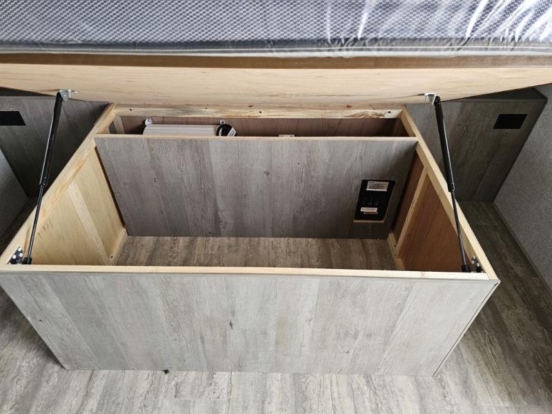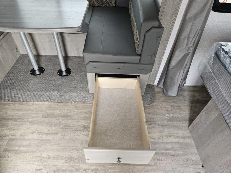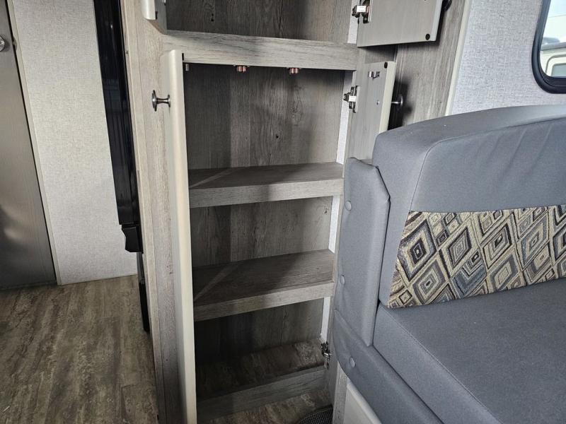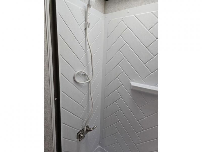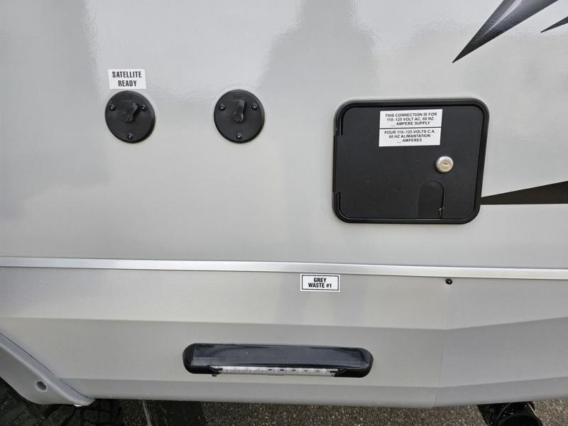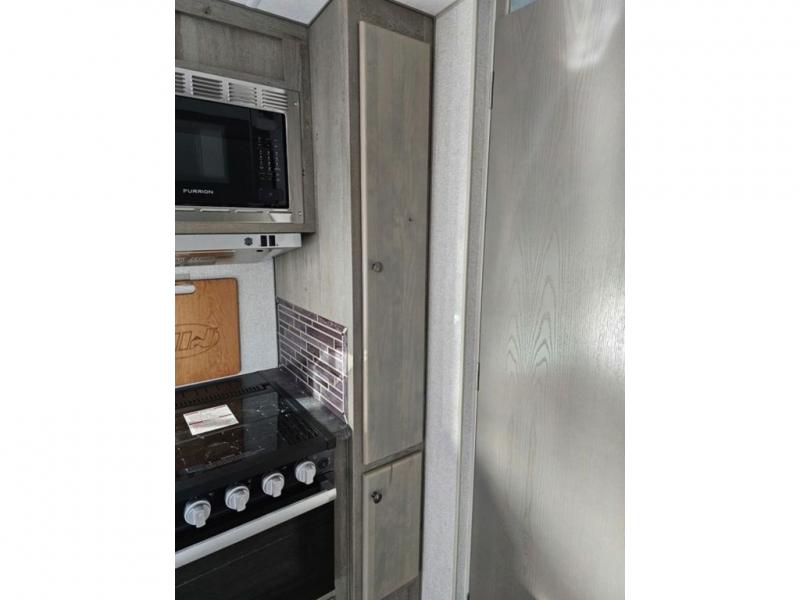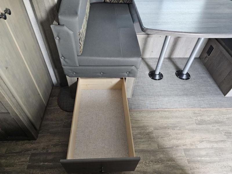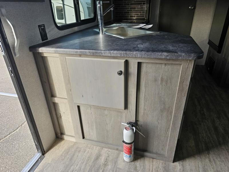 This is the perfect couple's trailer with space for an overnight guest or two on the U-shaped dinette slide. The kitchen also offers two pantries for dry goods and overhead storage for dishes and such as well as a 10 cu. ft. 12V refrigerator to store your cold items. Outside you will enjoy features like the 12V LED awning to protect you from the sun while you watch the kids play and the outdoor shower for them to rinse off before going inside.