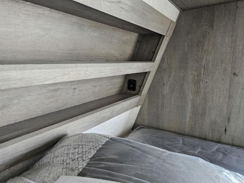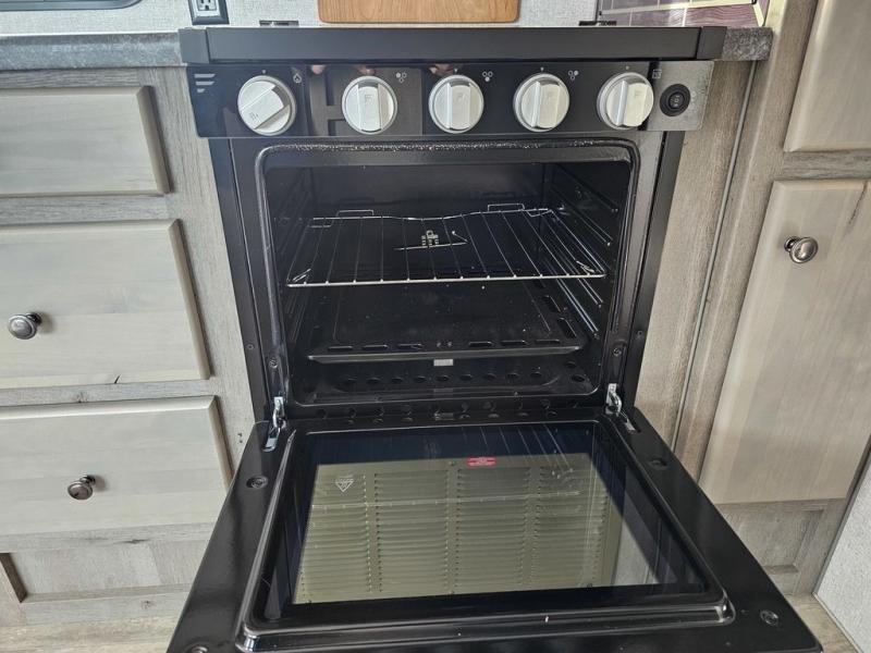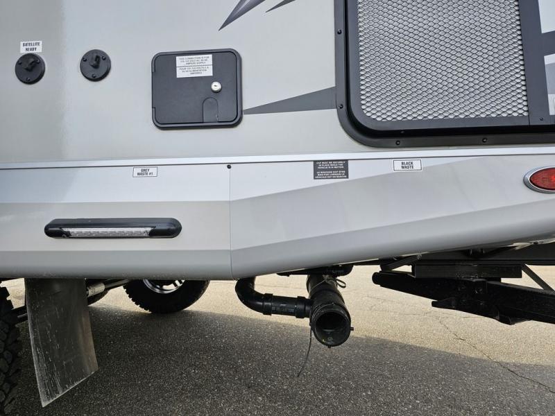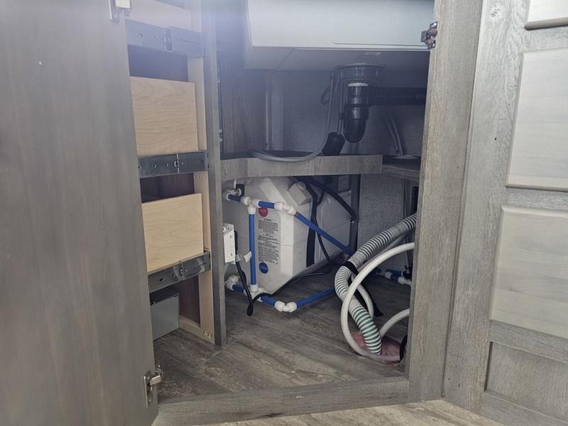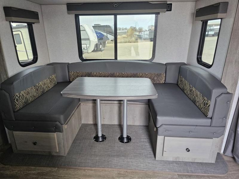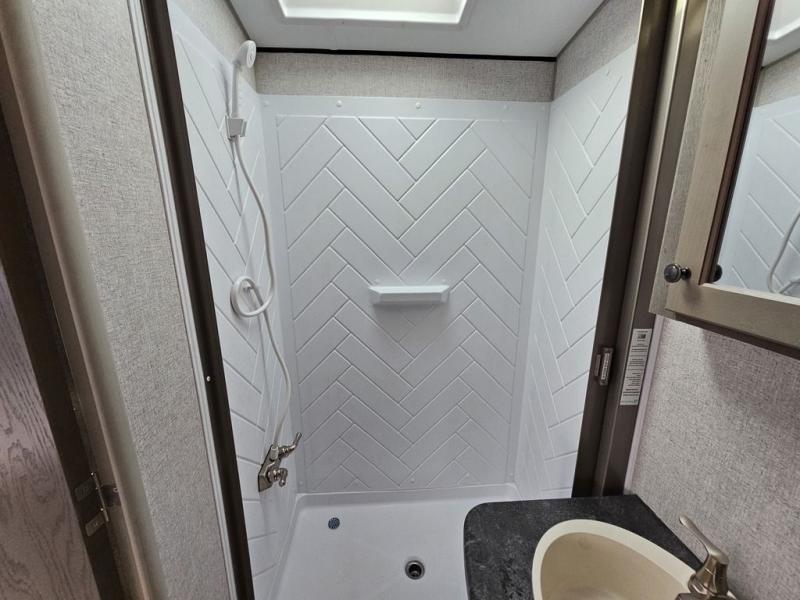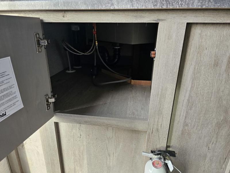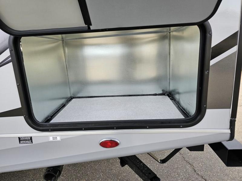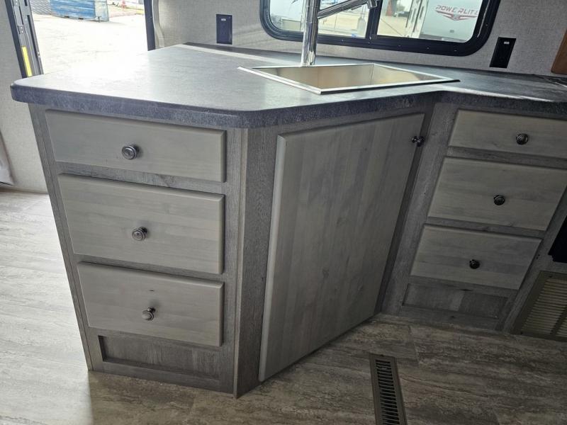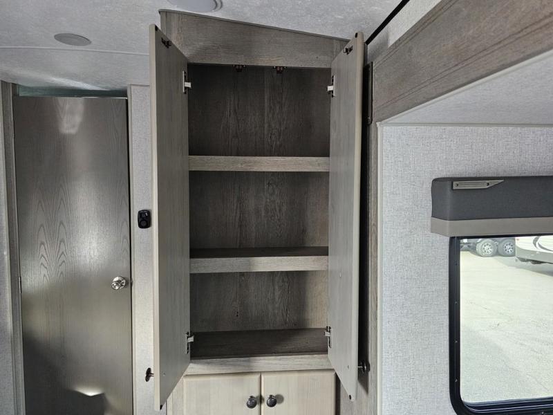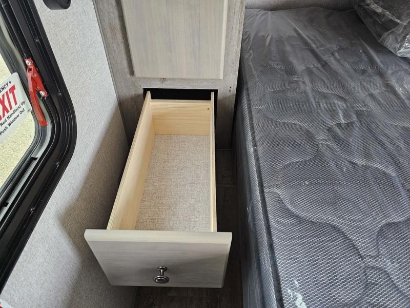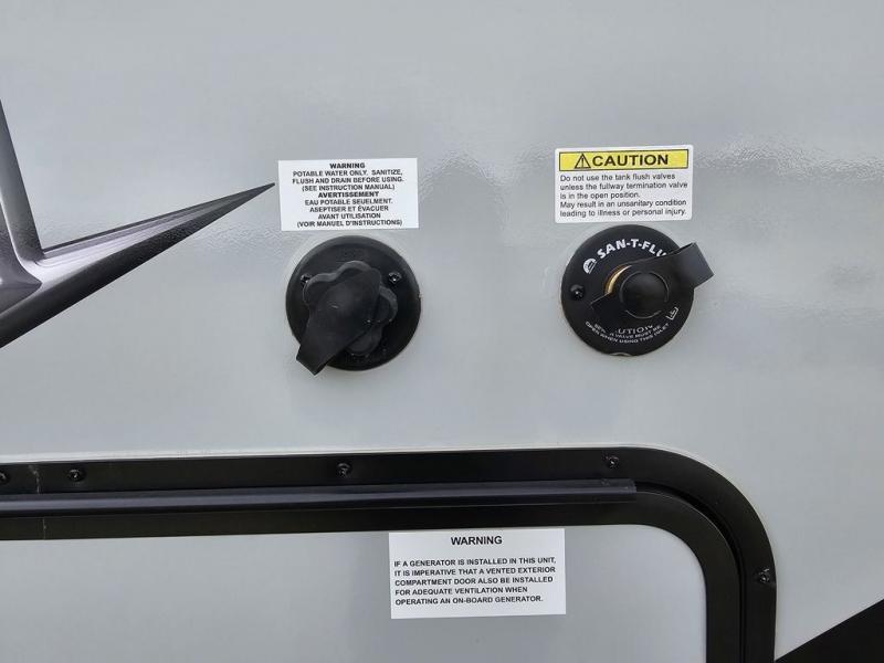 This is the perfect couple's trailer with space for an overnight guest or two on the U-shaped dinette slide. The kitchen also offers two pantries for dry goods and overhead storage for dishes and such as well as a 10 cu. ft. 12V refrigerator to store your cold items. Outside you will enjoy features like the 12V LED awning to protect you from the sun while you watch the kids play and the outdoor shower for them to rinse off before going inside.