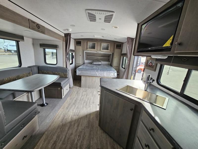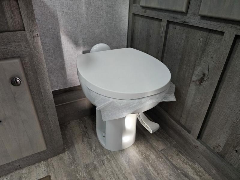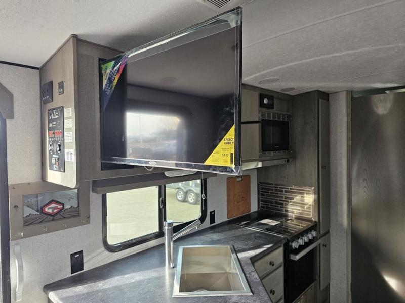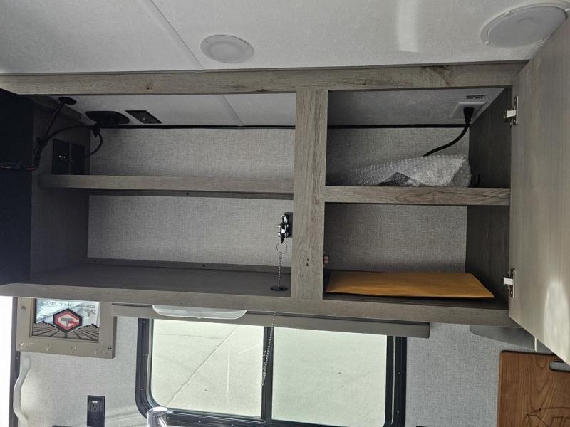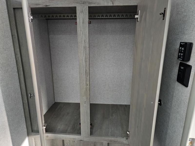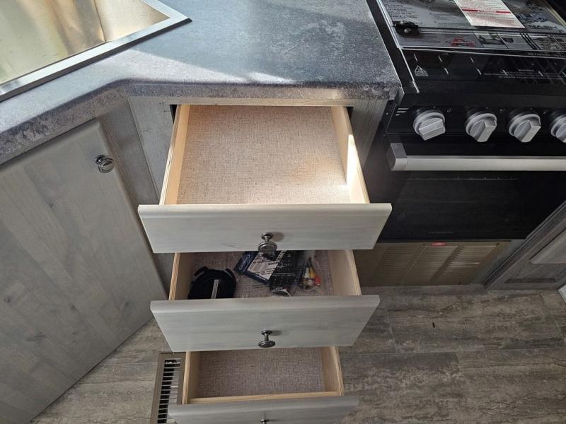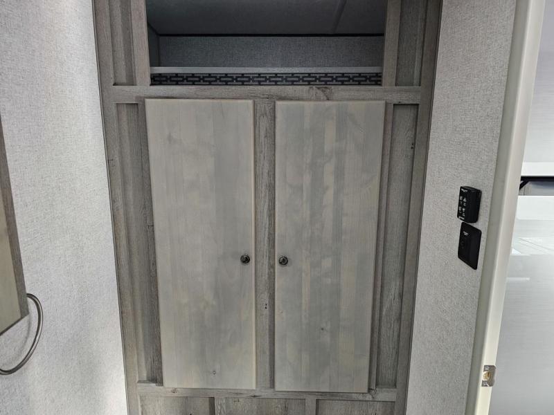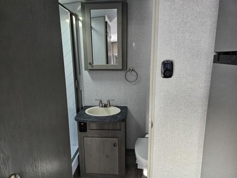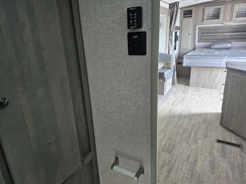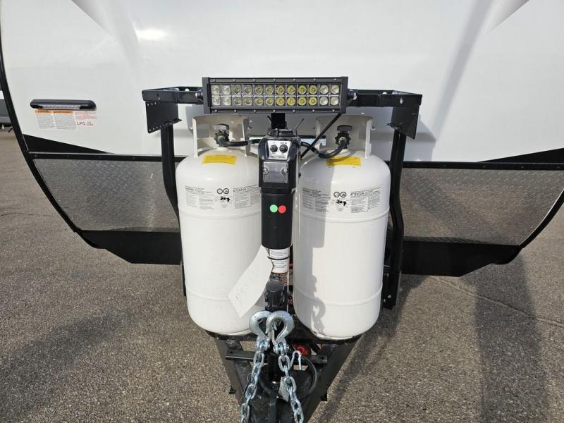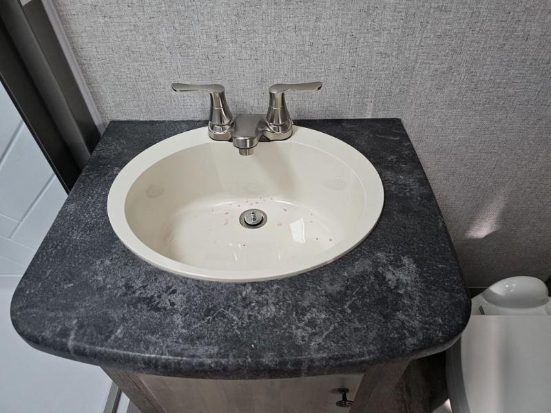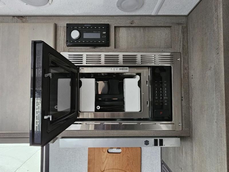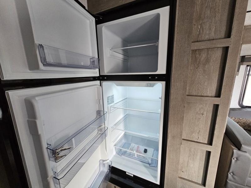 This is the perfect couple's trailer with space for an overnight guest or two on the U-shaped dinette slide. The kitchen also offers two pantries for dry goods and overhead storage for dishes and such as well as a 10 cu. ft. 12V refrigerator to store your cold items. Outside you will enjoy features like the 12V LED awning to protect you from the sun while you watch the kids play and the outdoor shower for them to rinse off before going inside.
