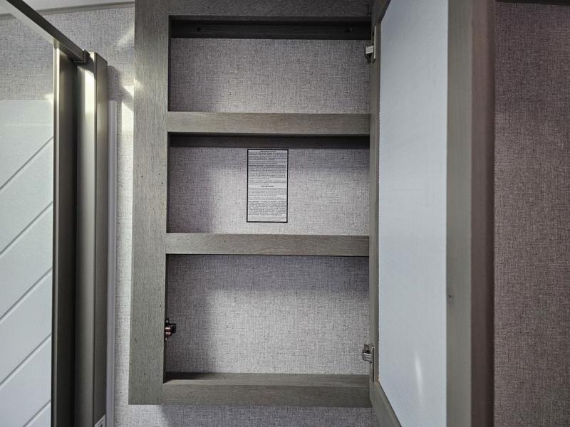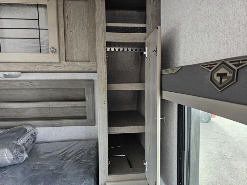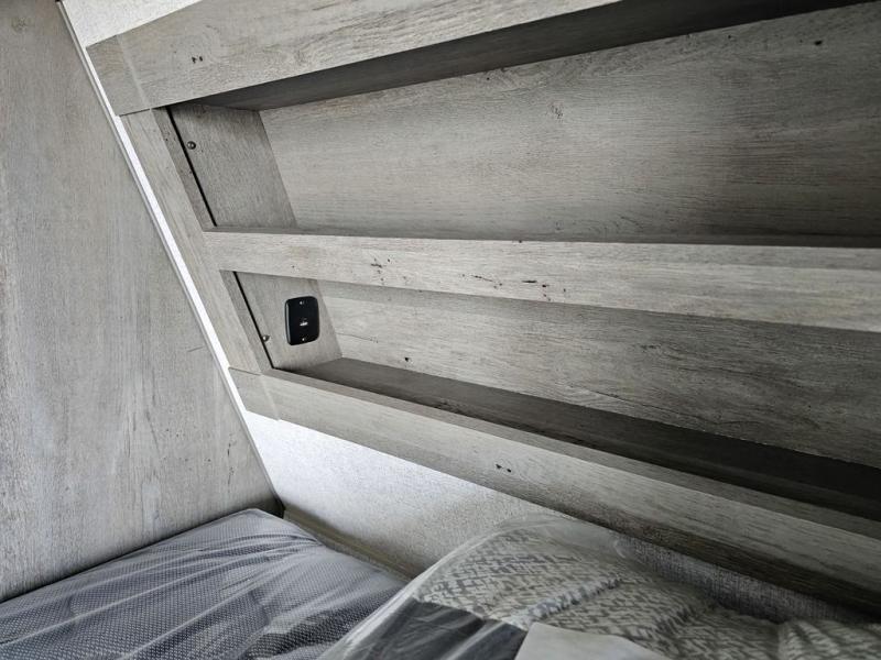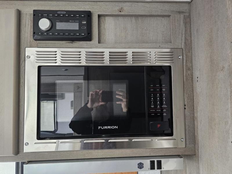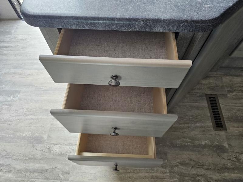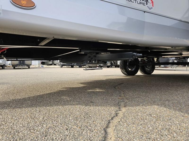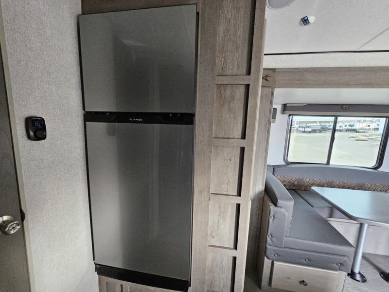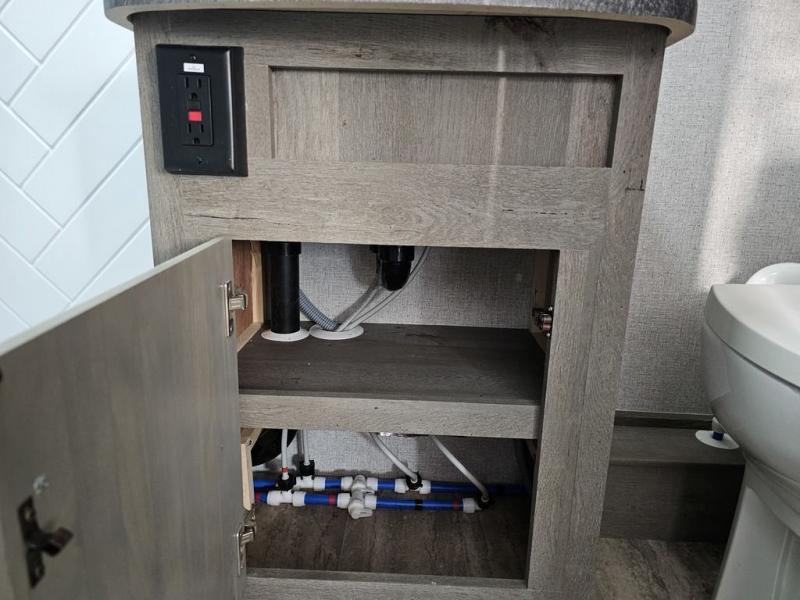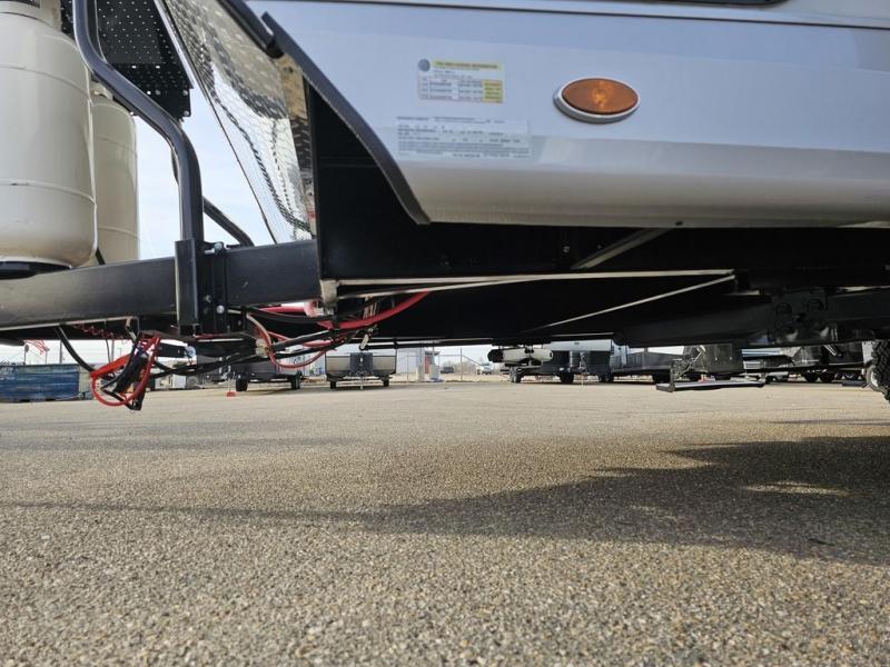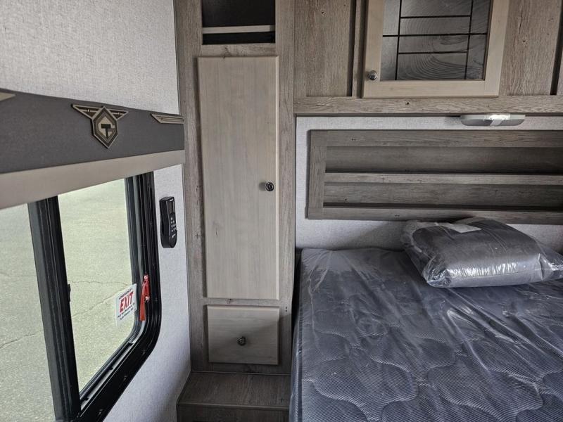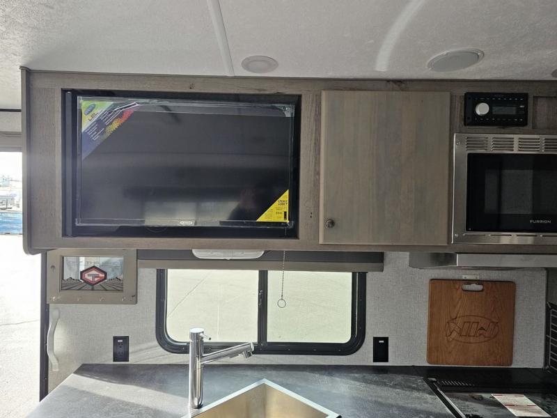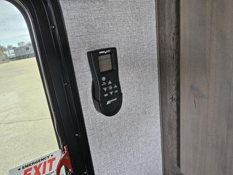 This is the perfect couple's trailer with space for an overnight guest or two on the U-shaped dinette slide. The kitchen also offers two pantries for dry goods and overhead storage for dishes and such as well as a 10 cu. ft. 12V refrigerator to store your cold items. Outside you will enjoy features like the 12V LED awning to protect you from the sun while you watch the kids play and the outdoor shower for them to rinse off before going inside.