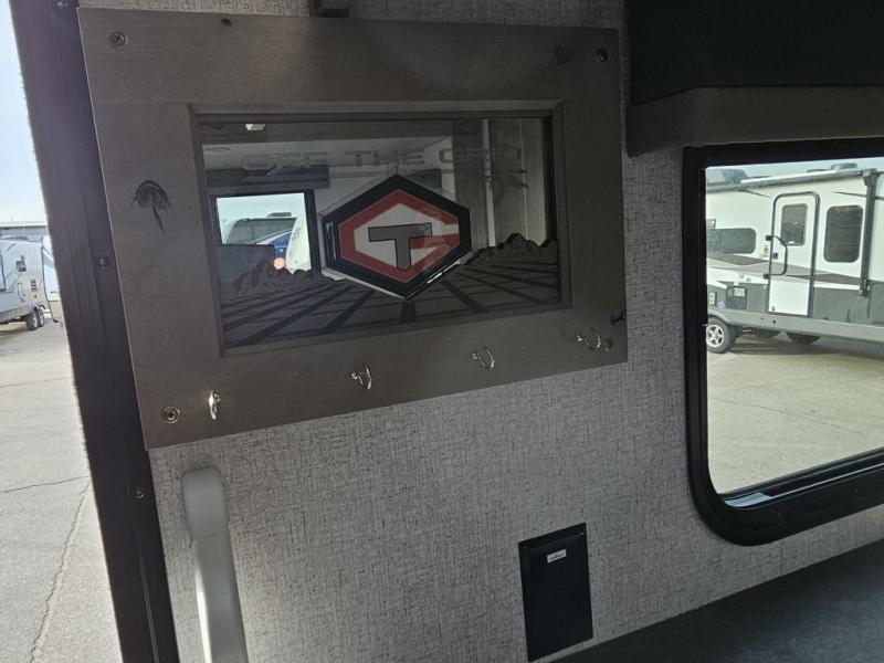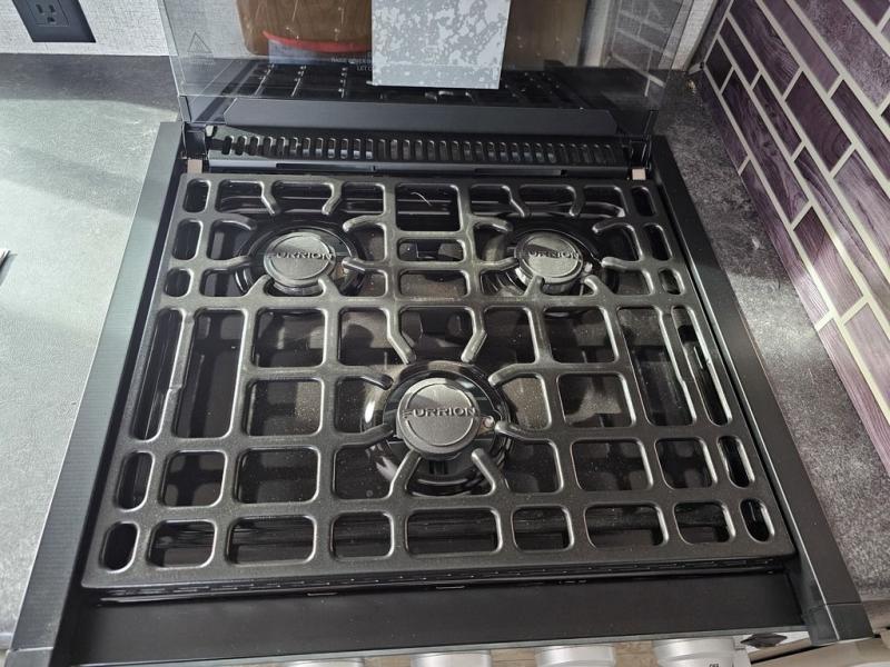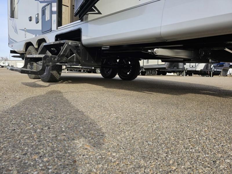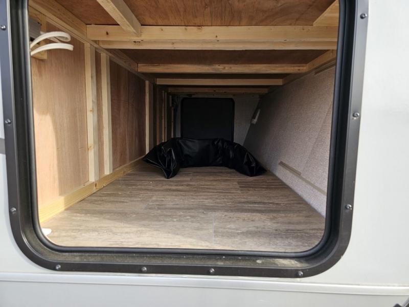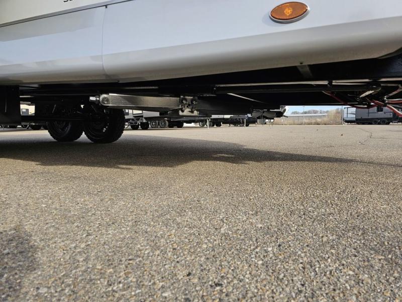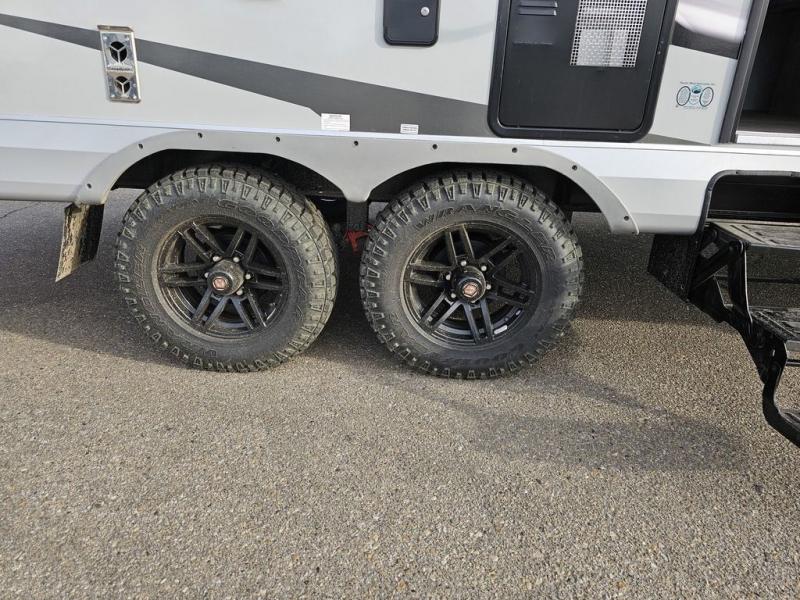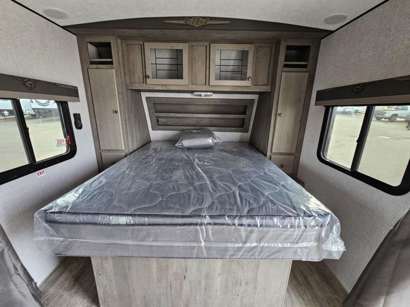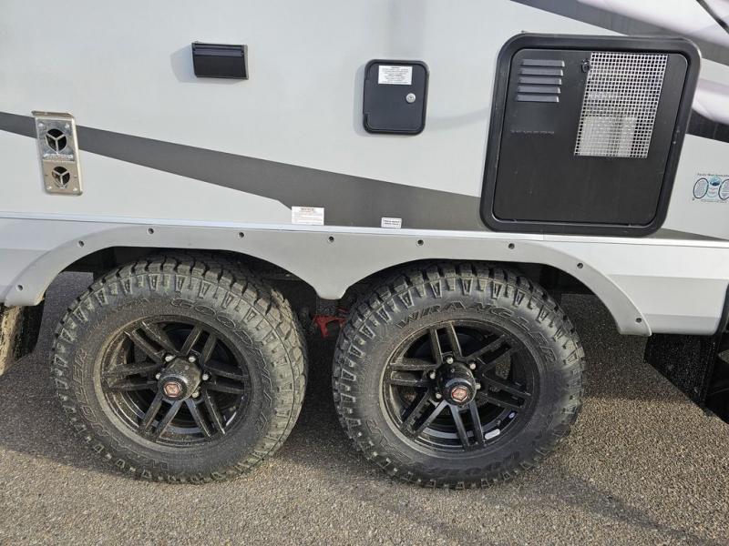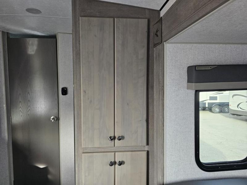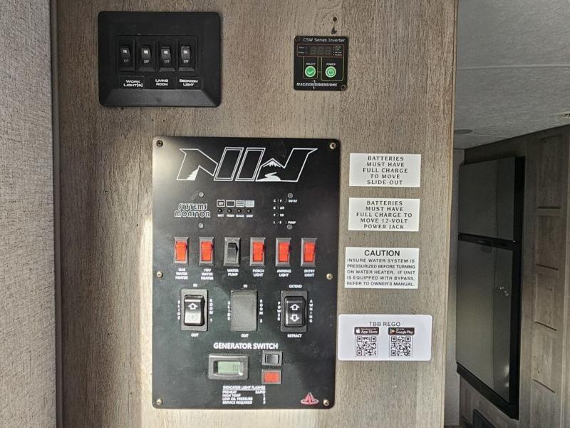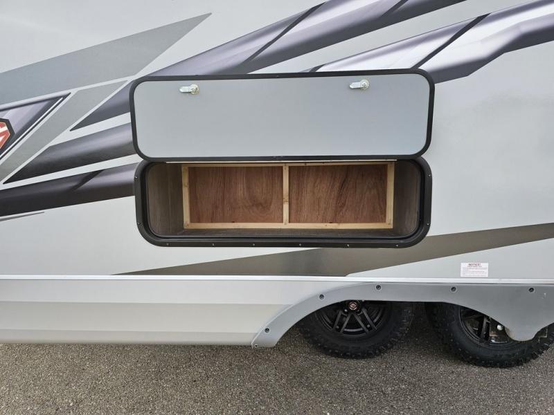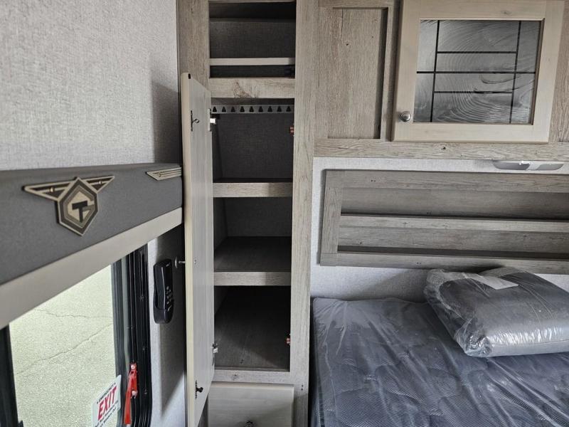 This is the perfect couple's trailer with space for an overnight guest or two on the U-shaped dinette slide. The kitchen also offers two pantries for dry goods and overhead storage for dishes and such as well as a 10 cu. ft. 12V refrigerator to store your cold items. Outside you will enjoy features like the 12V LED awning to protect you from the sun while you watch the kids play and the outdoor shower for them to rinse off before going inside.