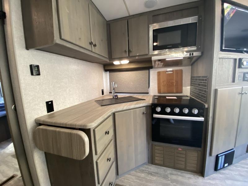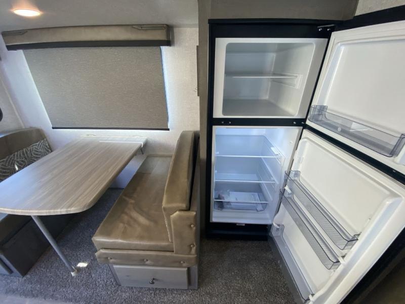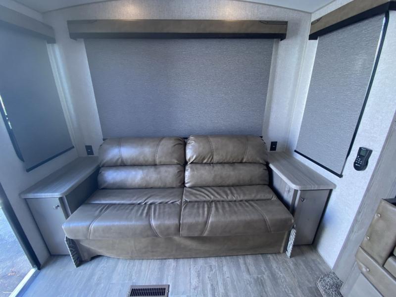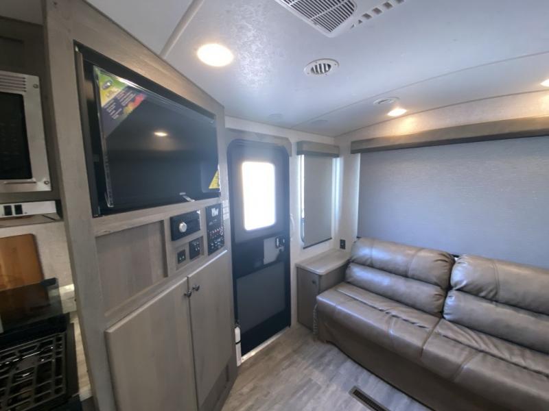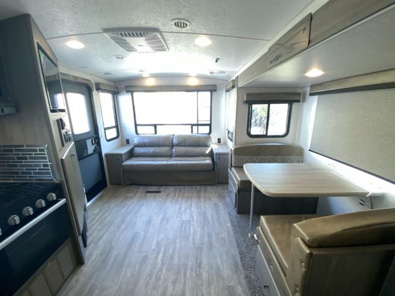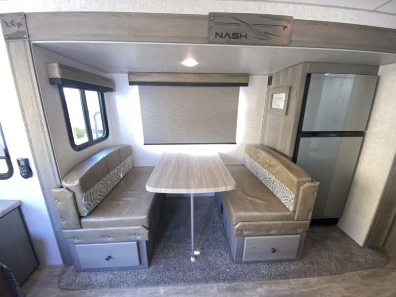 You will enjoy camping in any season with this Nash travel trailer that features a single slide for added interior space. A cathedral ceiling will make it feel even larger when spending time inside. The jackknife sofa adds extra sleeping for family members and/or friends, plus the booth dinette in the slide can easily convert to a 40" x 74" sleeping area for two children or an adult. Since there are dual entry doors, you can enter in through the front master bedroom with an RV queen bed, or the rear living area.