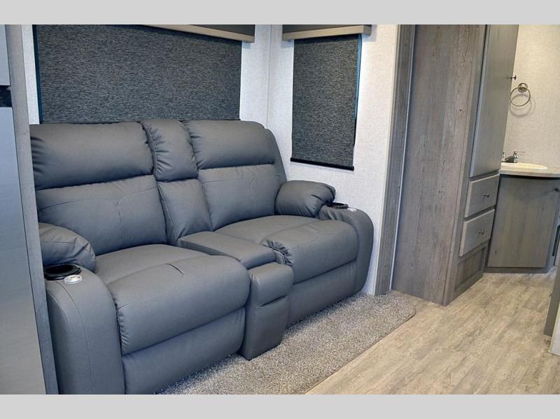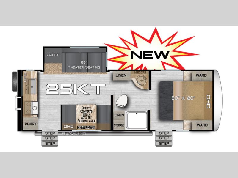 Camping trips in this travel trailer are sure to bring great memories! There are dual entry doors that allow you to enter in through the rear kitchen or the front master bedroom. Your crew can get comfy on the 68" theater seating, play a game at the booth dinette, or visit outdoors under the 15' 12V LED awning! The spacious walk-through bath includes two linen closets plus additional storage to keep bath necessities and clean towels close by, and you'll love having the front master bedroom all to yourselves!