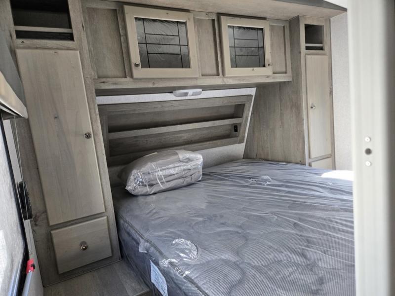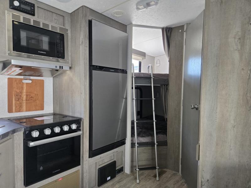 Camping at the state park just got easier in this spacious trailer that can sleep seven each night. The kids will claim the double-size bunks with a lower hinged bunk allowing storage underneath through the exterior Stor-Mor door. The booth dinette slide out is the perfect place for you to enjoy your meals at, as well as play a card game, and just outside the slide out there is an additional exterior storage area. When you're ready to wind down your night, you can head into the front bedroom where you will find an RV queen bed with wardrobes on either side and overhead cabinets above, plus there are USB charging ports on both sides of the bed.