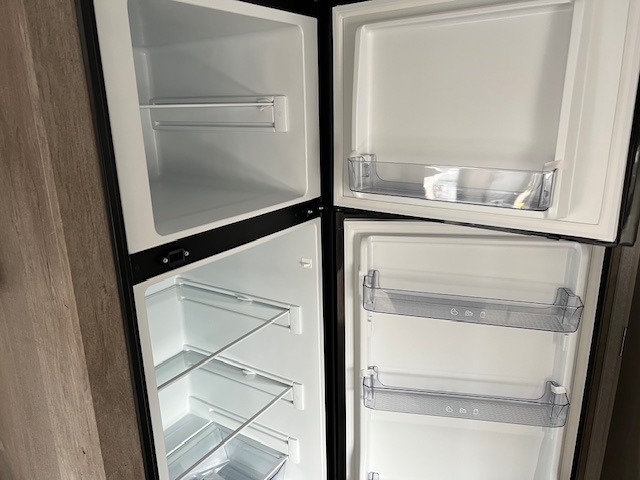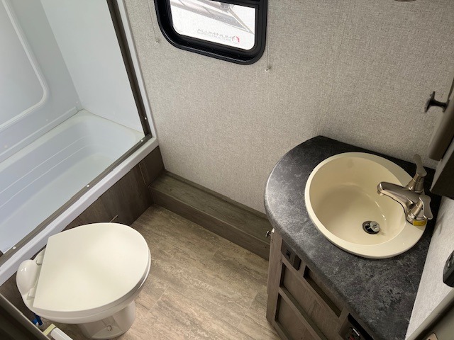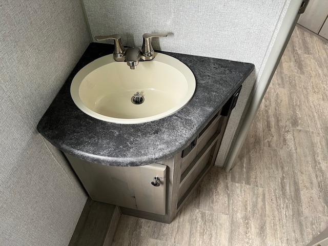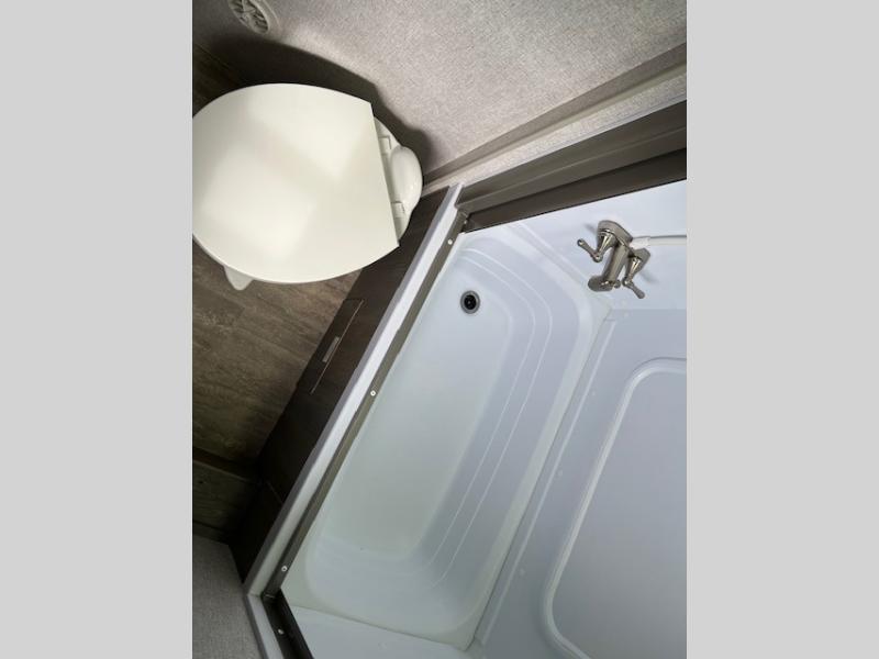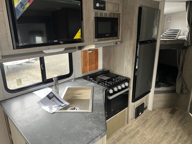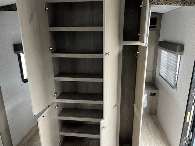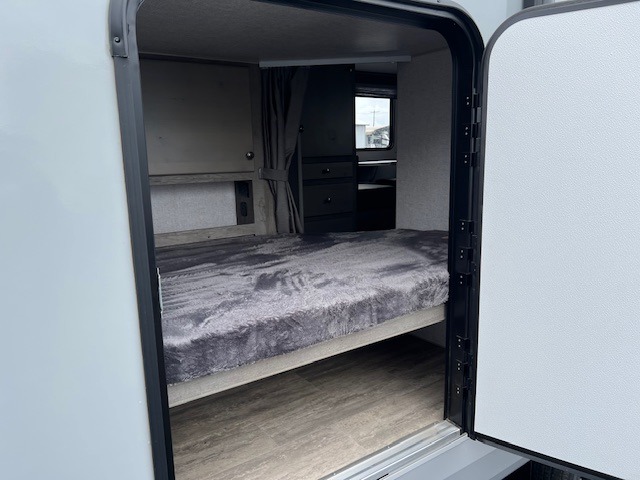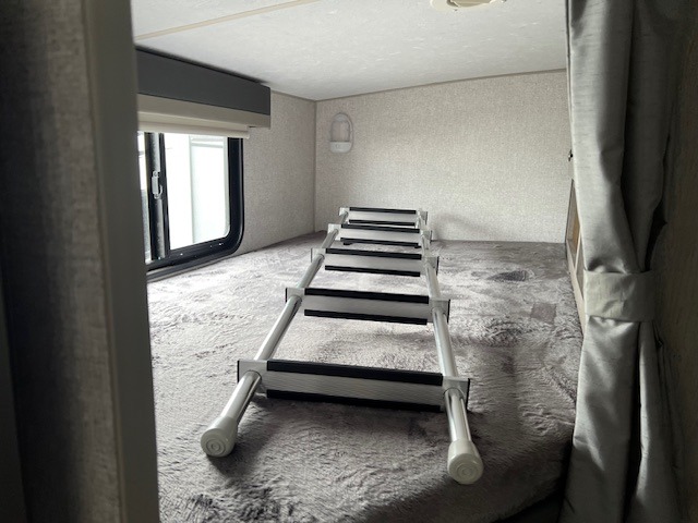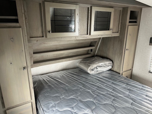 Camping at the state park just got easier in this spacious trailer that can sleep seven each night. The kids will claim the double-size bunks with a lower hinged bunk allowing storage underneath through the exterior Stor-Mor door. The booth dinette slide out is the perfect place for you to enjoy your meals at, as well as play a card game, and just outside the slide out there is an additional exterior storage area. When you're ready to wind down your night, you can head into the front bedroom where you will find an RV queen bed with wardrobes on either side and overhead cabinets above, plus there are USB charging ports on both sides of the bed.