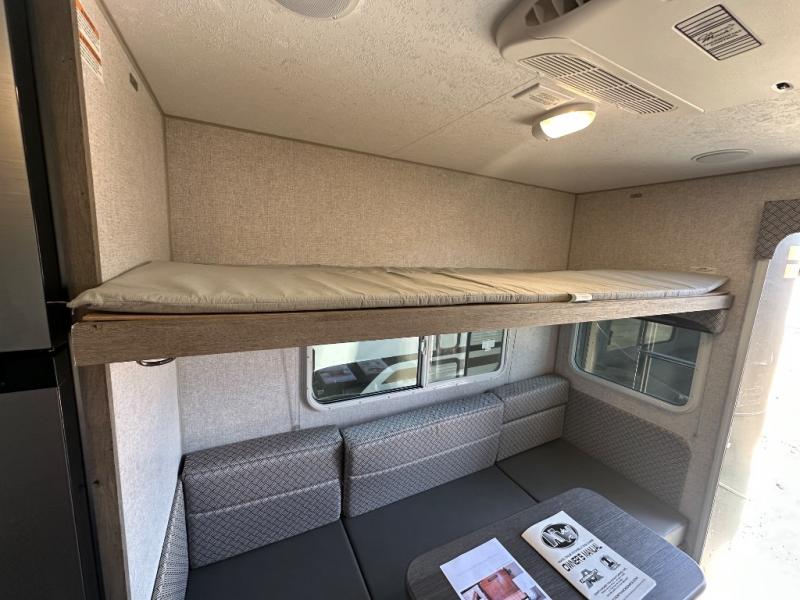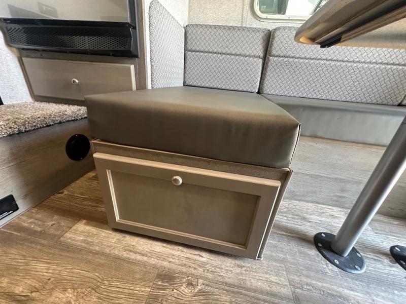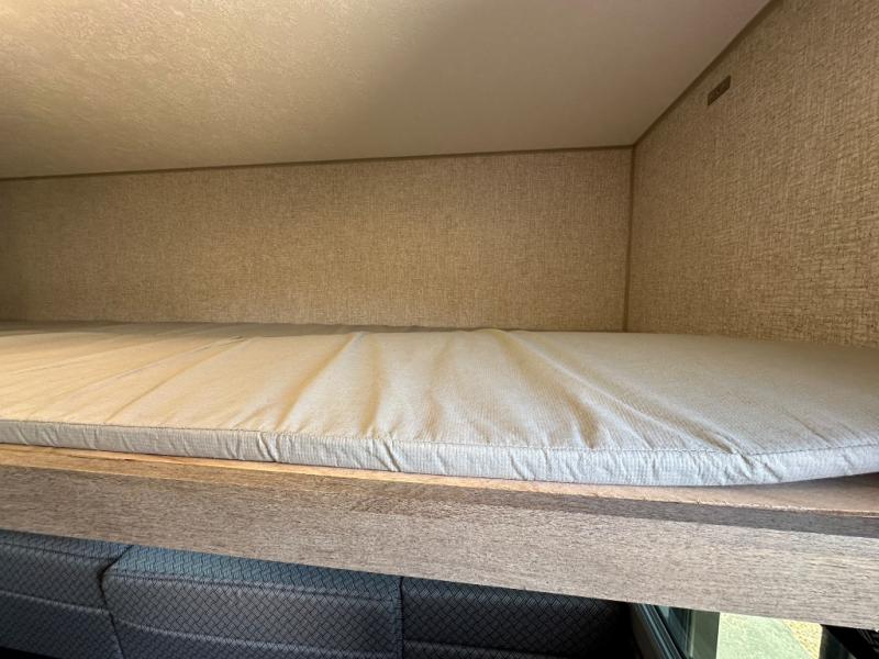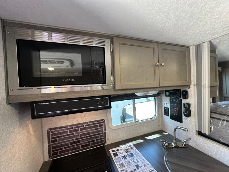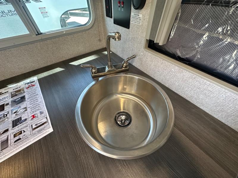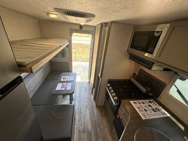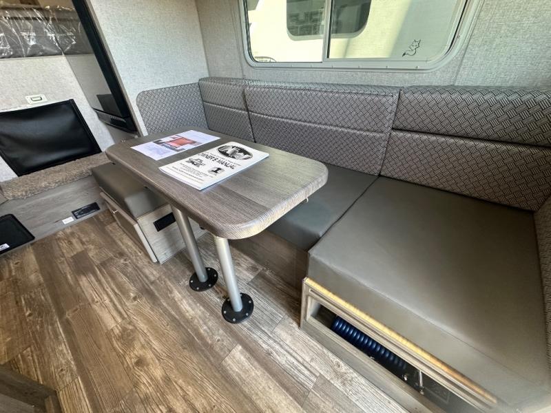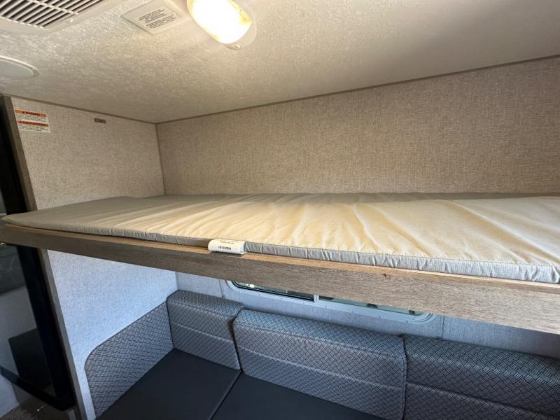 Head across the states in this comfortable truck camper for four. Once you find a campground to park for the night, start lunch on the three burner cooktop, or use the microwave for a quick meal. The U-shaped dinette will be the perfect place to dine at, or you can choose the optional roll-over sofa here. The dinette converts to a 38" x 77" sleeping area, plus there is an overhead bunk. You will enjoy the front 58" x 80" queen bed that includes three wardrobes and a nightstand for your things, and don't forget to add the optional 19" 12V LED TV for movies in bed.