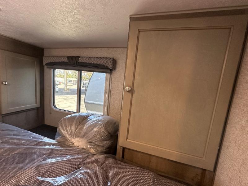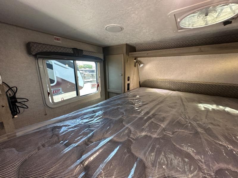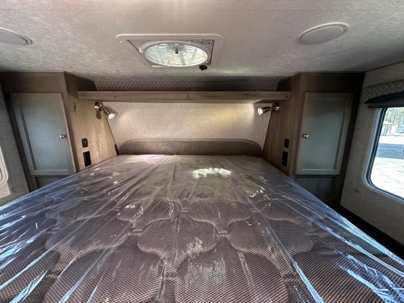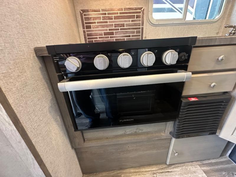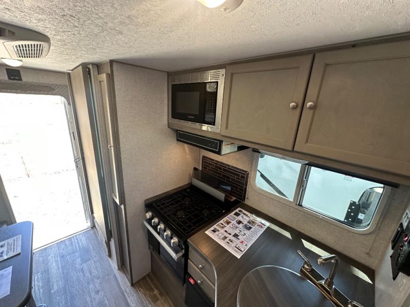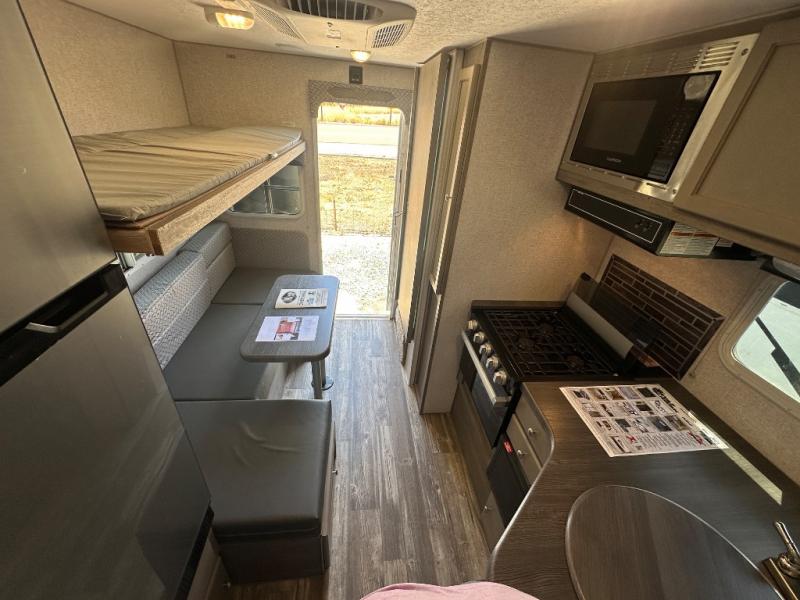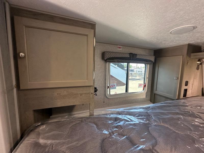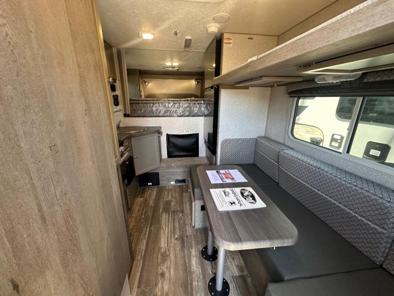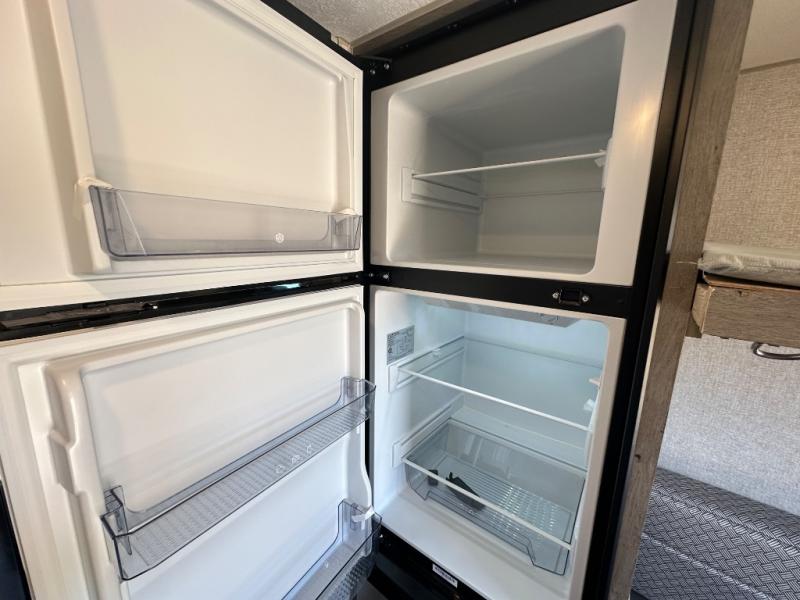 Head across the states in this comfortable truck camper for four. Once you find a campground to park for the night, start lunch on the three burner cooktop, or use the microwave for a quick meal. The U-shaped dinette will be the perfect place to dine at, or you can choose the optional roll-over sofa here. The dinette converts to a 38" x 77" sleeping area, plus there is an overhead bunk. You will enjoy the front 58" x 80" queen bed that includes three wardrobes and a nightstand for your things, and don't forget to add the optional 19" 12V LED TV for movies in bed.
