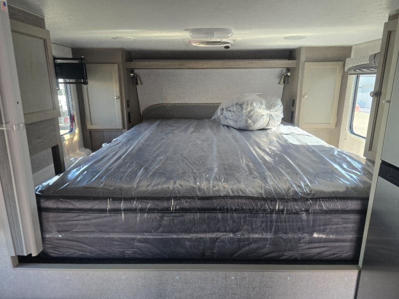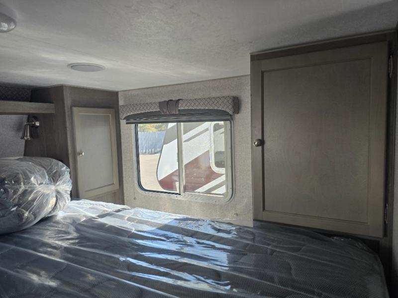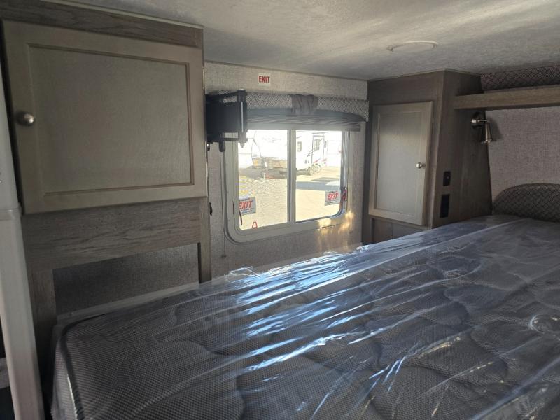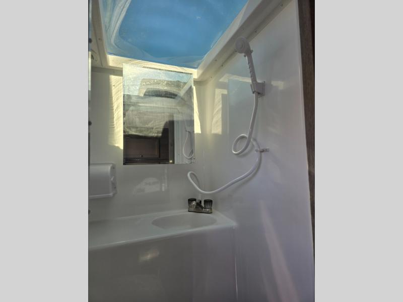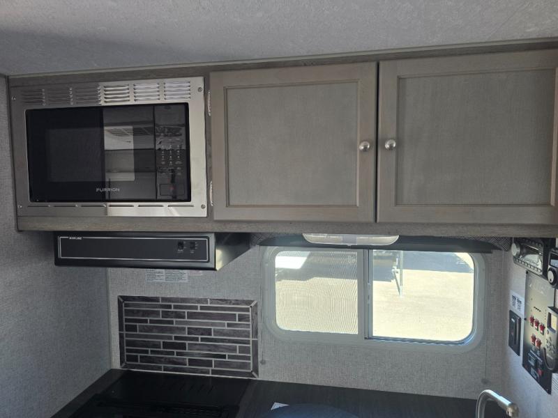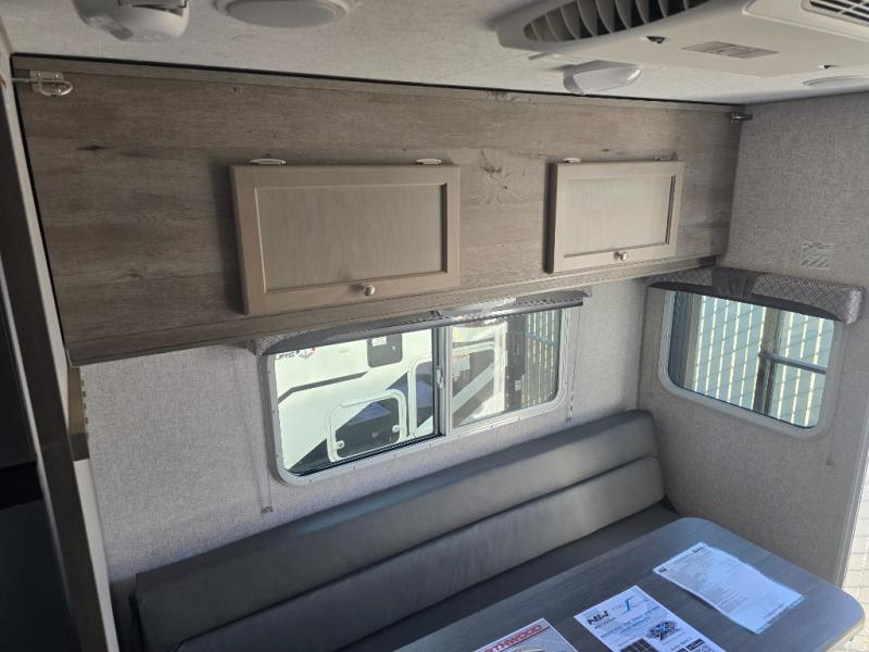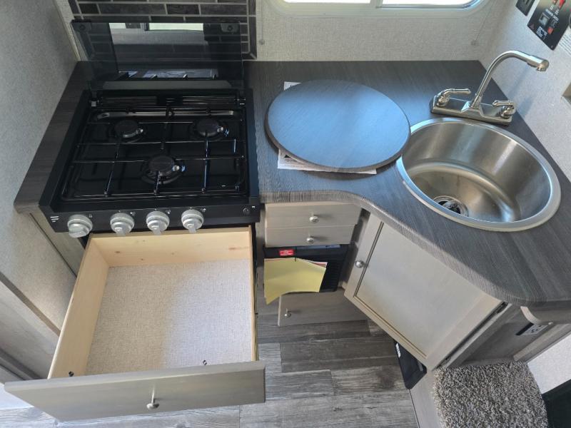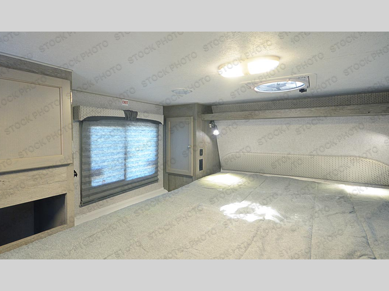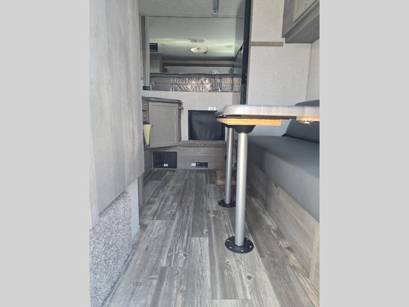 Head across the states in this comfortable truck camper for four. Once you find a campground to park for the night, start lunch on the three burner cooktop, or use the residential microwave with an air fryer for a quick meal. The U-shaped dinette will be the perfect place to dine at, or you can choose the optional roll-over sofa here. The dinette converts to a 38" x 77" sleeping area, plus there is an overhead bunk. You will enjoy the front 58" x 80" queen bed that includes three wardrobes and a nightstand for your things, and don't forget to add the optional 24" 12V LED TV for movies in bed.