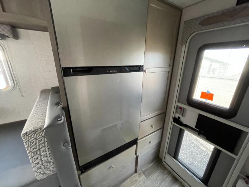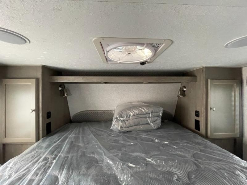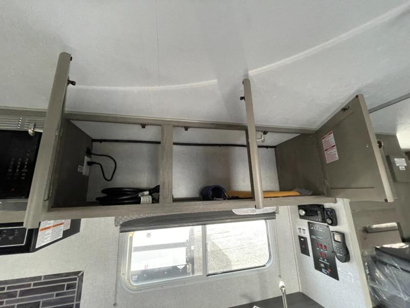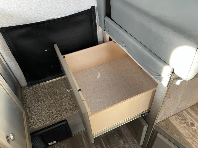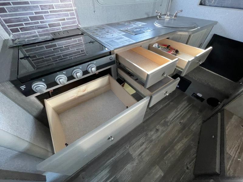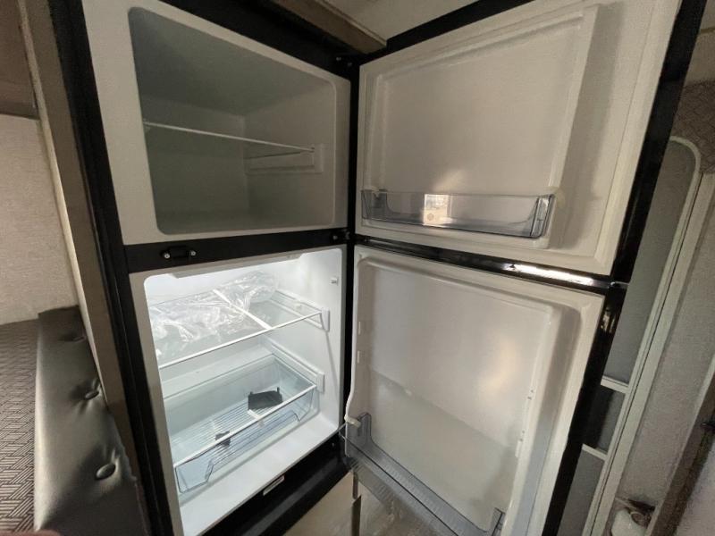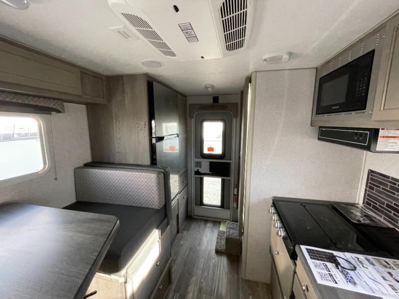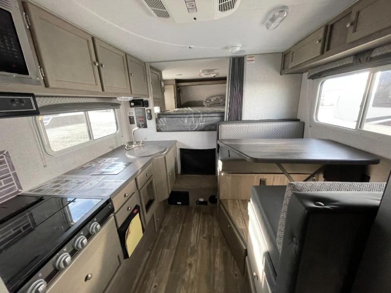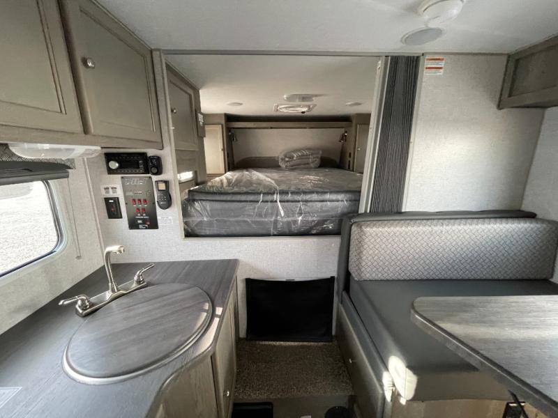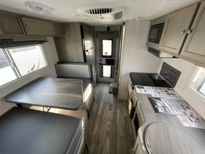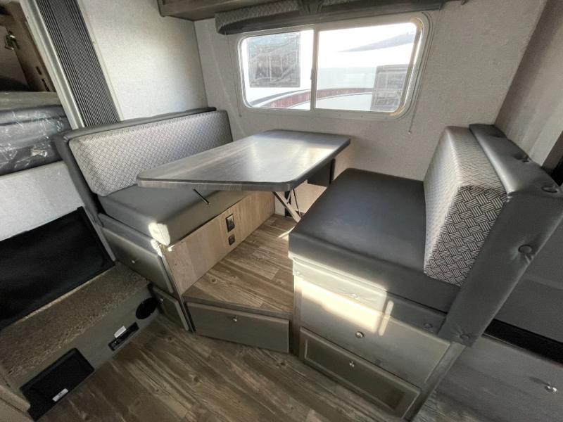 You'll have everything you need and more in this cozy truck camper for three to four. Once you arrive at the campground, you can put out the 7' 4" rear awning with LED lights, unload your bags, then head inside to make lunch on the three burner cooktop. There is also a residential-style microwave with an air fryer and an 8 cu. ft. 12V refrigerator for all your kitchen needs. A booth dinette provides a place to dine together and let a guest or two little ones sleep over. The front queen-size bed will be perfect for you, and there are three wardrobes around the bed to keep your things organized. And if you enjoy watching movies in bed, just choose the optional 24" 12V LED TV!