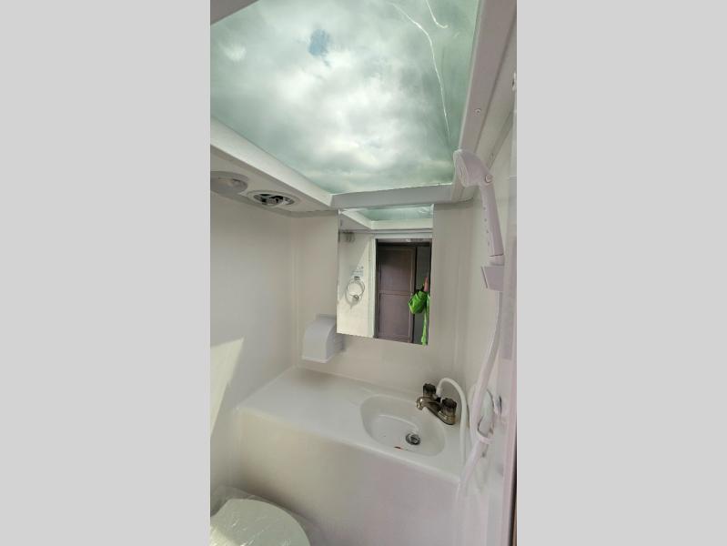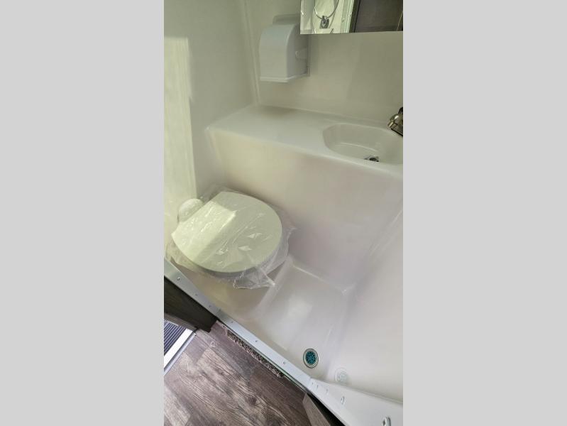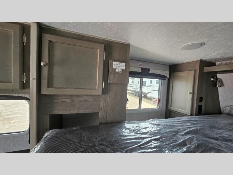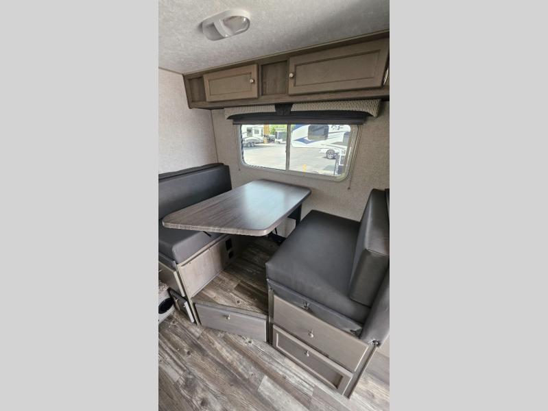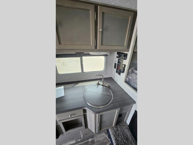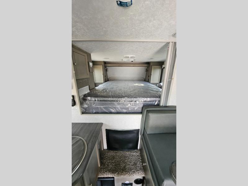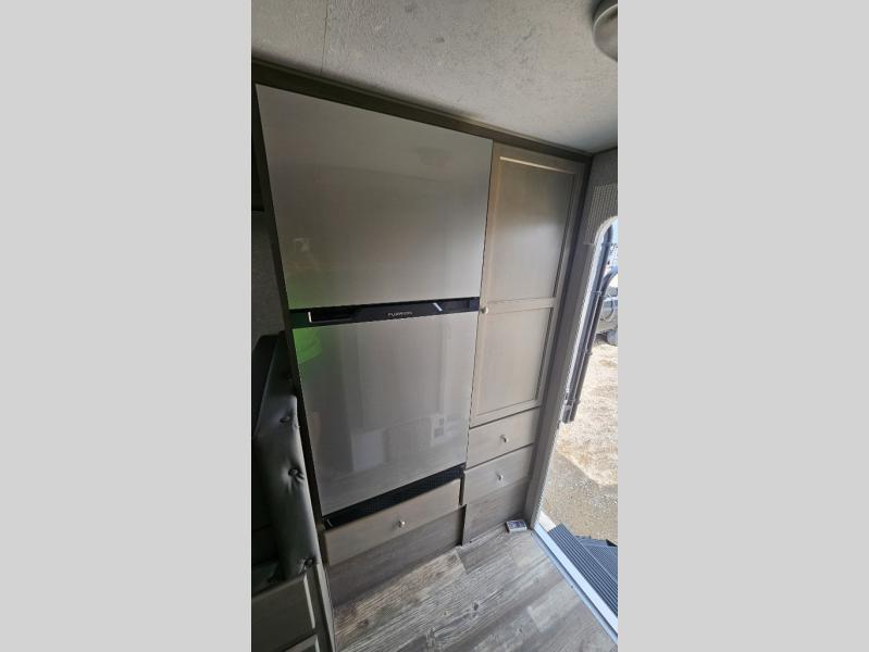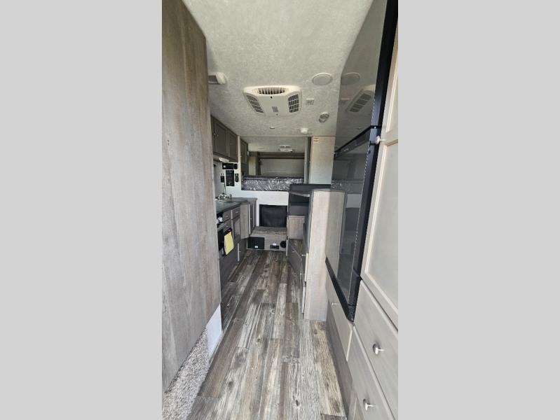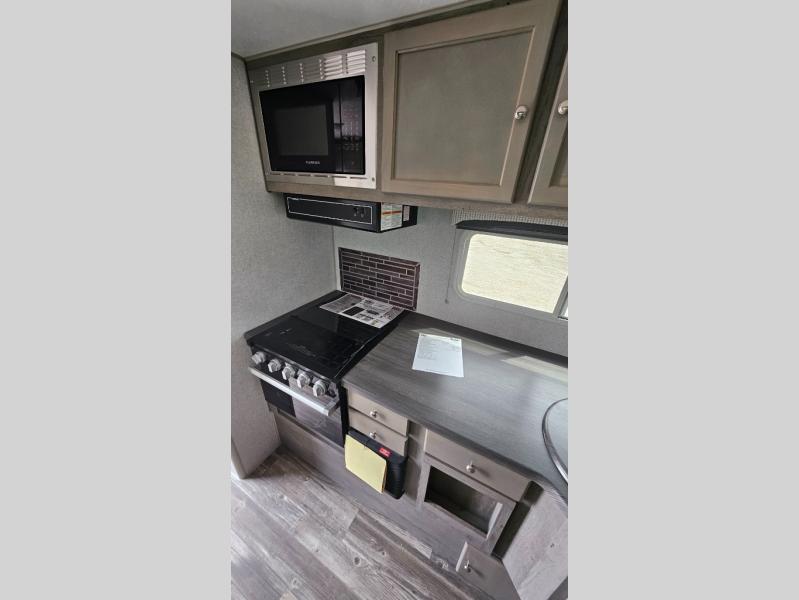 You'll have everything you need and more in this cozy truck camper for three to four. Once you arrive at the campground, you can put out the 7' 4" rear awning with LED lights, unload your bags, then head inside to make lunch on the three burner cooktop. There is also a residential-style microwave with an air fryer and an 8 cu. ft. 12V refrigerator for all your kitchen needs. A booth dinette provides a place to dine together and let a guest or two little ones sleep over. The front queen-size bed will be perfect for you, and there are three wardrobes around the bed to keep your things organized. And if you enjoy watching movies in bed, just choose the optional 24" 12V LED TV!