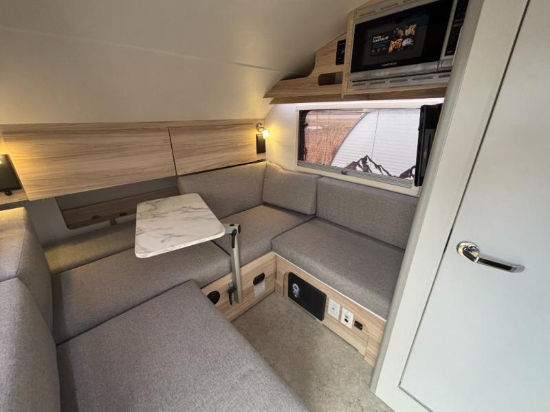 With any TAB 320 teardrop trailer by nüCamp RV, the interior offers premium soft-close cabinetry, a front window, plus a wet bath with a cassette toilet and a molded sink. They are also built with composite flooring and a molded underbelly shield for protection against rock and debris during your journeys. The iconic teardrop design offers an easy-to-tow unit with amenities found in much bigger trailers. Some other highlights include the Alde heating/hot water system, the central air conditioner, 180 watt solar panel, and the Nautilus water system with an external shower.