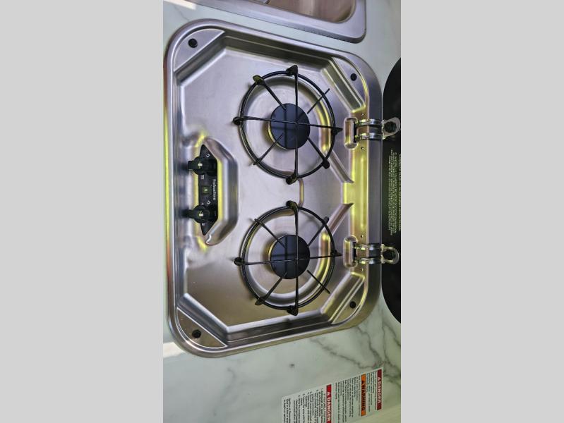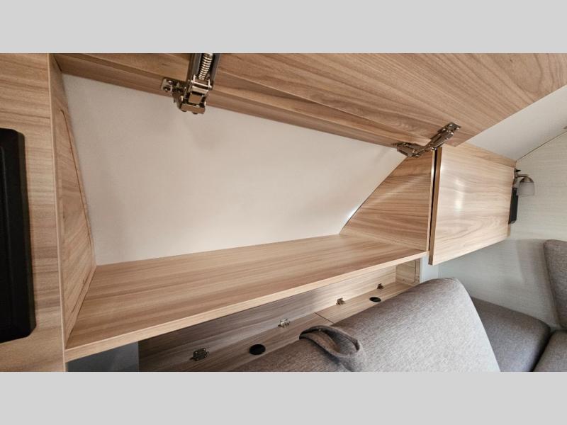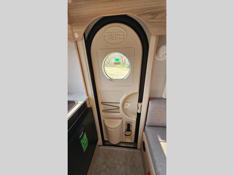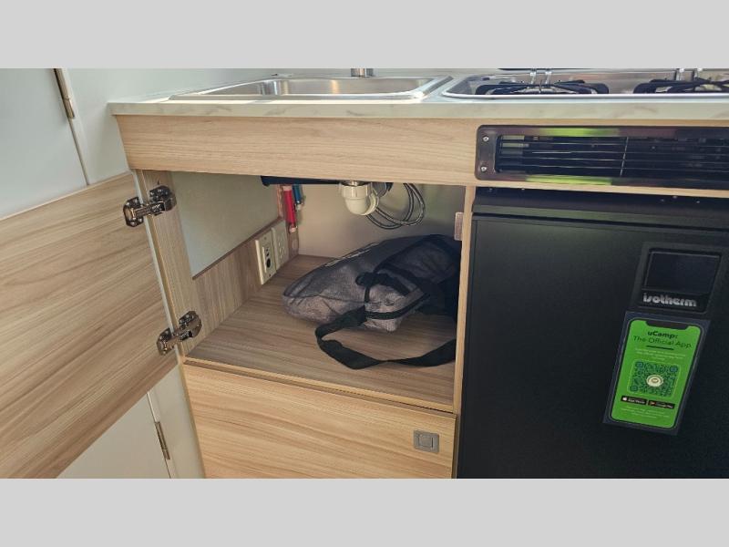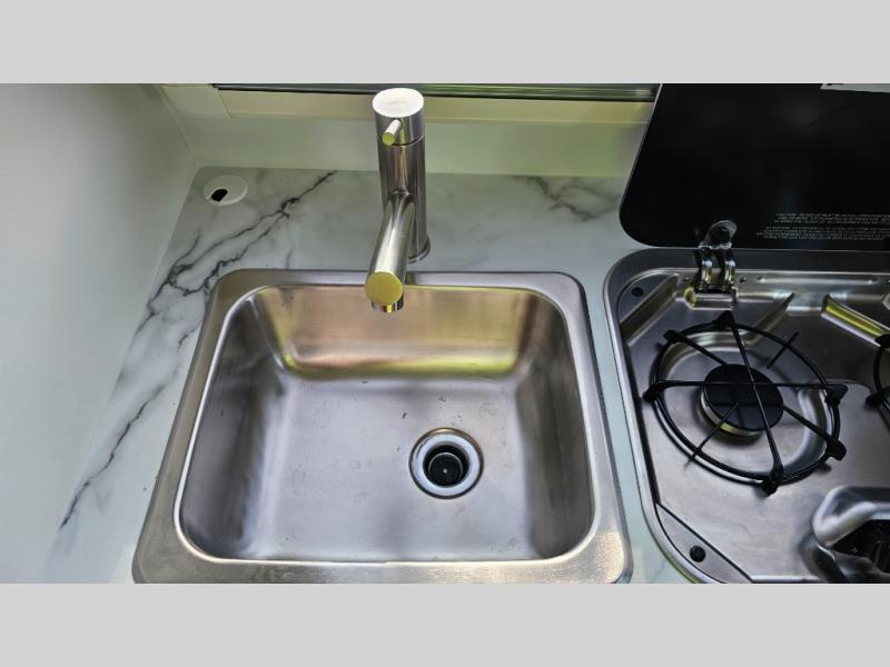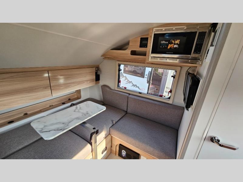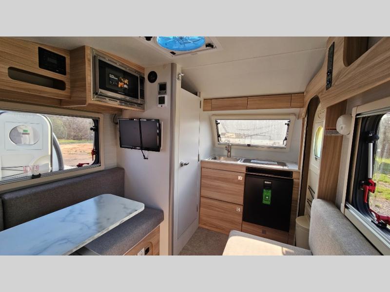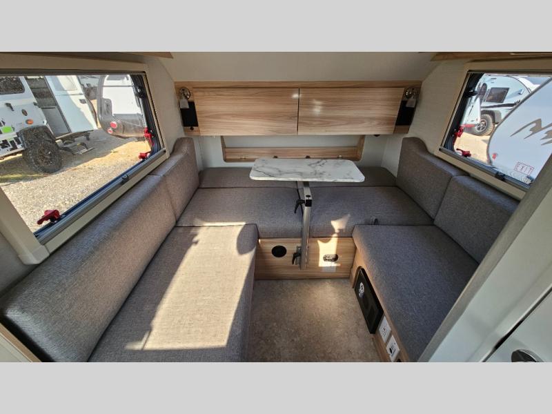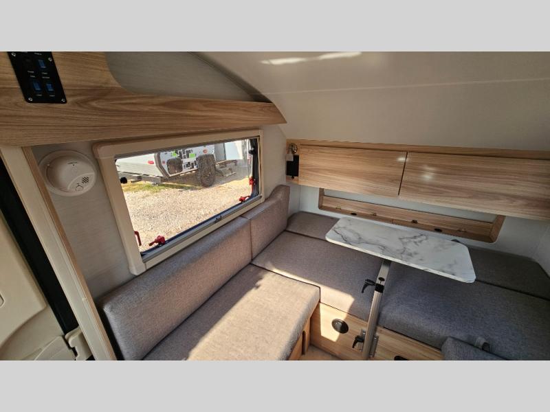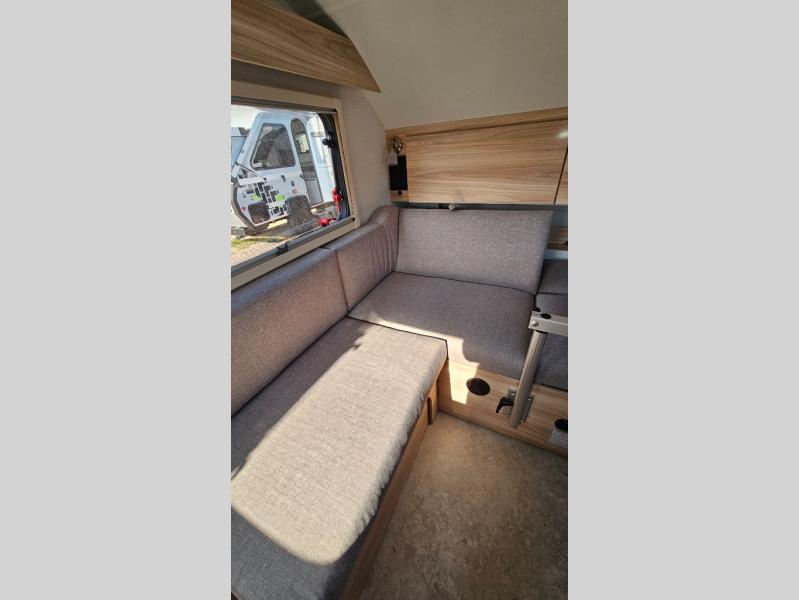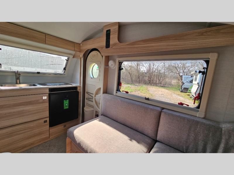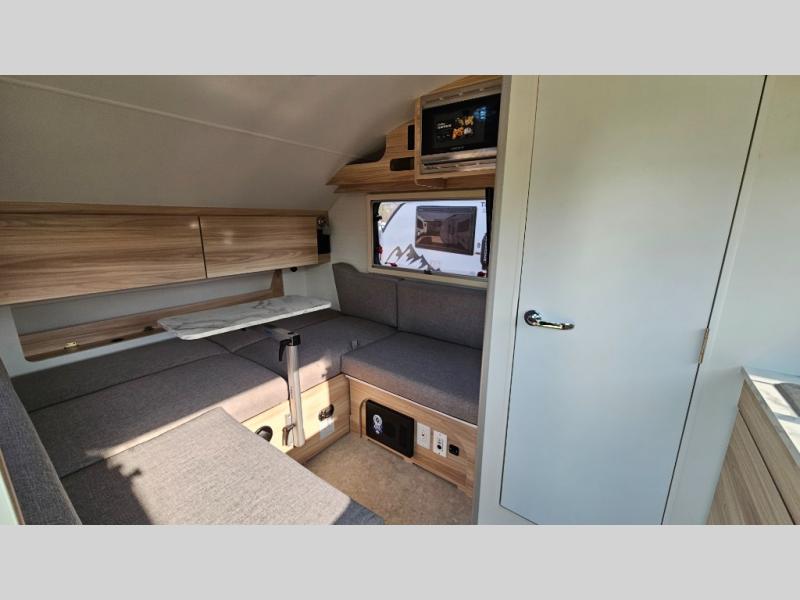 With any TAB 320 teardrop trailer by nüCamp RV, the interior offers premium soft-close cabinetry, a front window, plus a wet bath with a cassette toilet and a molded sink. They are also built with composite flooring and a molded underbelly shield for protection against rock and debris during your journeys. The iconic teardrop design offers an easy-to-tow unit with amenities found in much bigger trailers. Some other highlights include the Alde heating/hot water system, the central air conditioner, 180 watt solar panel, and the Nautilus water system with an external shower.