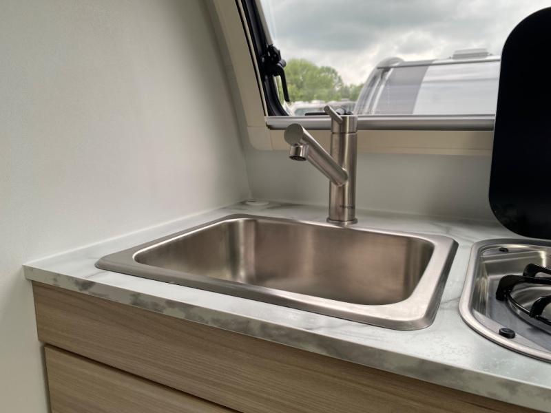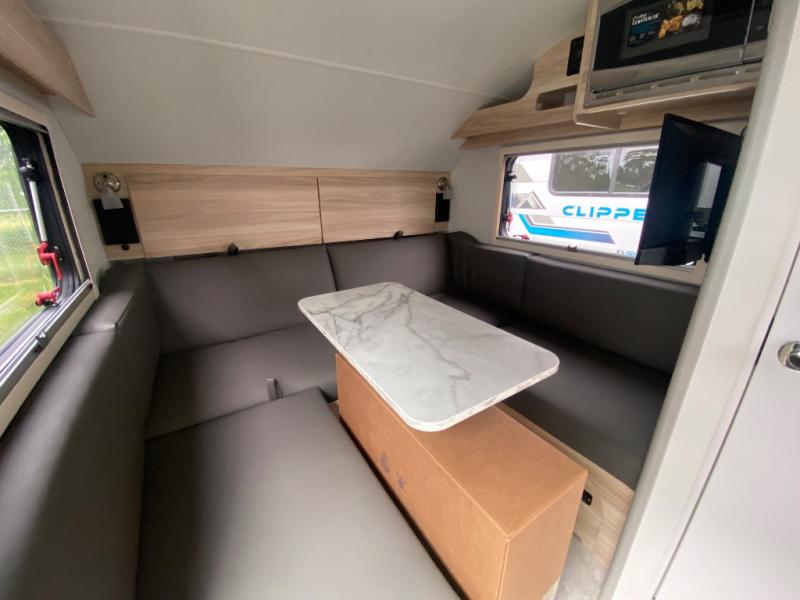 With any TAB 320 teardrop trailer by nüCamp RV, the interior offers premium soft-close cabinetry, a front window, plus a wet bath with a cassette toilet and a molded sink. They are also built with composite flooring and a molded underbelly shield for protection against rock and debris during your journeys. The iconic teardrop design offers an easy-to-tow unit with amenities found in much bigger trailers. Some other highlights include the Alde heating/hot water system, the central air conditioner, 180 watt solar panel, and the Nautilus water system with an external shower.