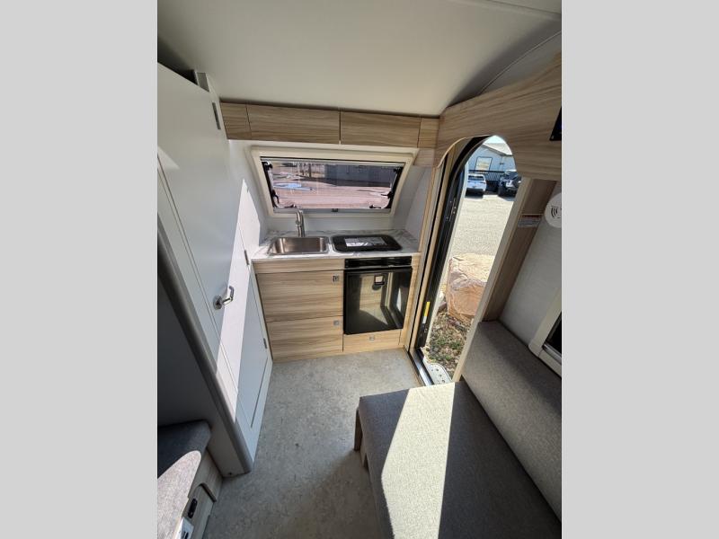 With any TAB 320 teardrop trailer by nüCamp RV, the interior offers premium soft-close cabinetry, a front window, plus a wet bath with a cassette toilet and a molded sink. They are also built with composite flooring and a molded underbelly shield for protection against rock and debris during your journeys. The iconic teardrop design offers an easy-to-tow unit with amenities found in much bigger trailers. Some other highlights include the Alde heating/hot water system, the central air conditioner, 180 watt solar panel, and the Nautilus water system with an external shower.