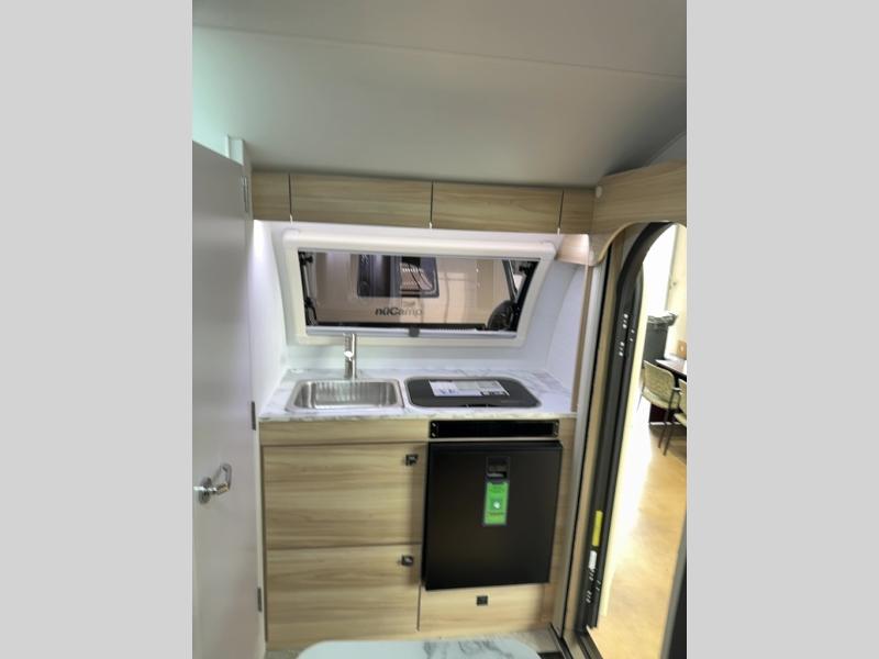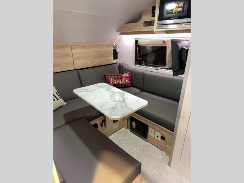 With any TAB 320 teardrop trailer by nüCamp RV, the interior offers premium soft-close cabinetry, a front window, plus a wet bath with a cassette toilet and a molded sink. They are also built with composite flooring and a molded underbelly shield for protection against rock and debris during your journeys. The iconic teardrop design offers an easy-to-tow unit with amenities found in much bigger trailers. Some other highlights include the Alde heating/hot water system, the central air conditioner, 180 watt solar panel, and the Nautilus water system with an external shower.