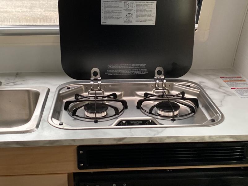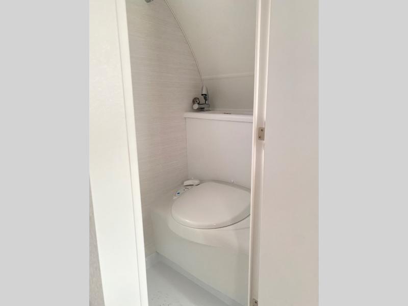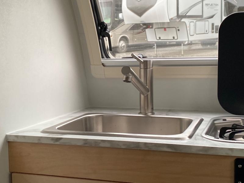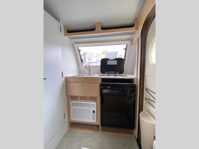 Hitch up and go at the drop of a hat with this cozy teardrop trailer! You will love how easy it will be to tow this unit, and you'll be surprised to find everything you need for hassle-free camping trips. An expandable split bed/dinette provides a place to relax, eat and sleep, and a two burner stove with a glass top will let you make meals inside when you don't want to cook over the campfire. You can choose to add an optional microwave for even more convenience, and the standard 12V compressor refrigerator will keep your cold items fresh. Easily freshen up each day in the wet bath that includes a cassette toilet with a molded sink.