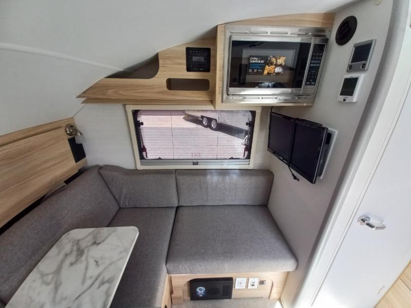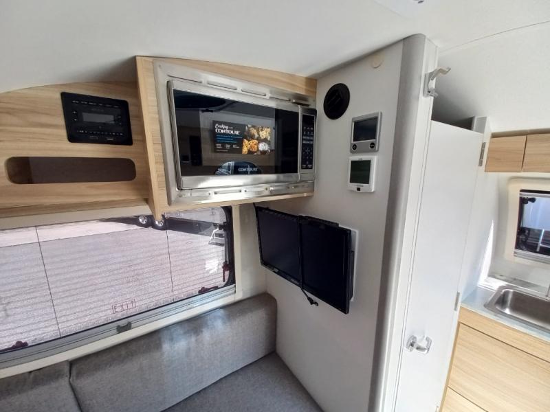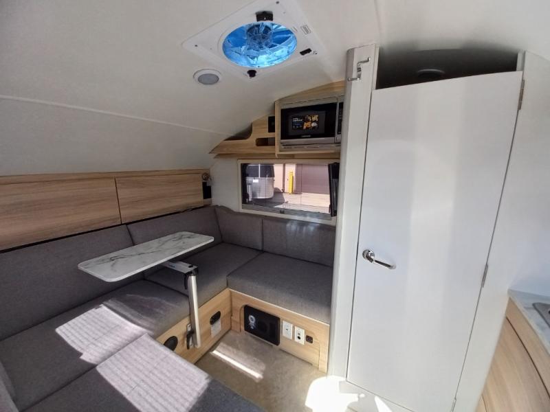 From the interior kitchen, the wet bath and the U-shaped dinette that offers two sleeping configurations, you will have everything you need. You can choose to setup a full bed or split beds, keep your electronics charged with the dual 110/USB ports, make warm meals using the two burner glass-top stove, and store cold items in the 2.3 cu. ft. 12V refrigerator. And the wet bath or the external shower will keep you clean and refreshed while camping. The included boondock package includes aggressive off-road tires, pitched axle, aluminum utility platform, Boondock entry door handle, cargo pouches, custom running boards & fenders, roof rack, and Boondock Graphic.