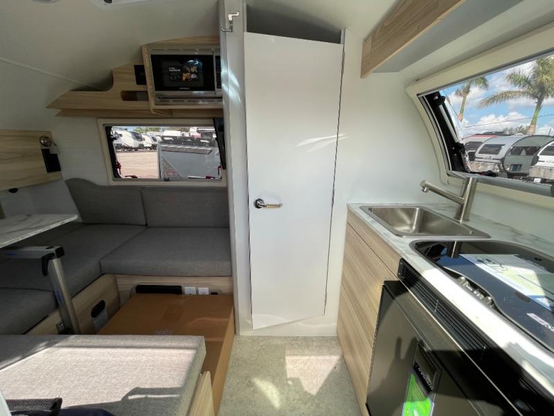 With any TAB 320 teardrop trailer by nüCamp RV, the interior offers premium soft-close cabinetry, a front window, plus a wet bath with a cassette toilet and a molded sink. They are also built with composite flooring and a molded underbelly shield for protection against rock and debris during your journeys. The iconic teardrop design offers an easy-to-tow unit with amenities found in much bigger trailers. Some other highlights include the Alde heating/hot water system, the central air conditioner, 180 watt solar panel, and the Nautilus water system with an external shower.
