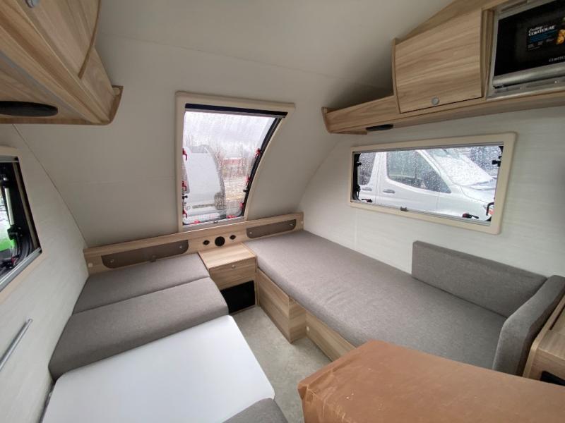 If you enjoy lightweight camping, this teardrop trailer is for you! Everything you need for trips to the lake will be right there with you, including a convenient wet bath with a cassette toilet. The twin bed set up gives you cozy sleeping space, and they can convert to a dinette on one side with extra seating on the other side! There are stargazer windows to give you great views of your surroundings, and the open floorplan will have you feeling right at home. A glass top sink and two burner cooktop combo will let you cook meals each day, and the 5.0 cu. ft. 12V compressor refrigerator will be perfect for perishables. If the optional Black Canyon upgrade is chosen, the tongue weight will be 386 lbs. and the gross dry weight will be 2,729 lbs. See dealer for more details!