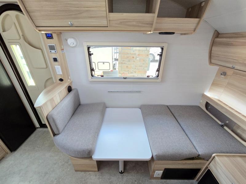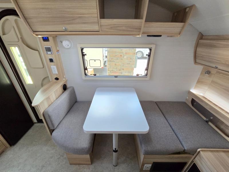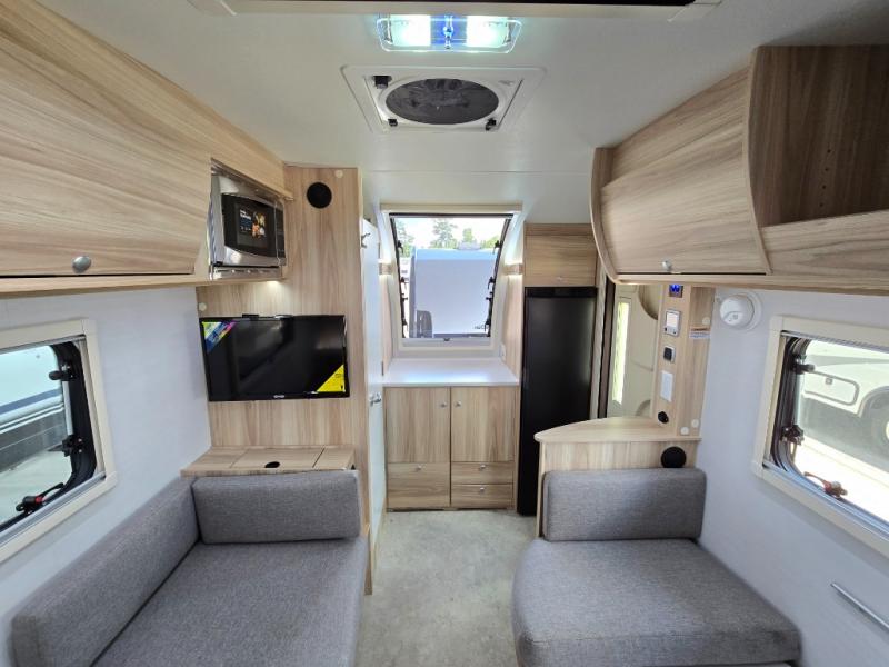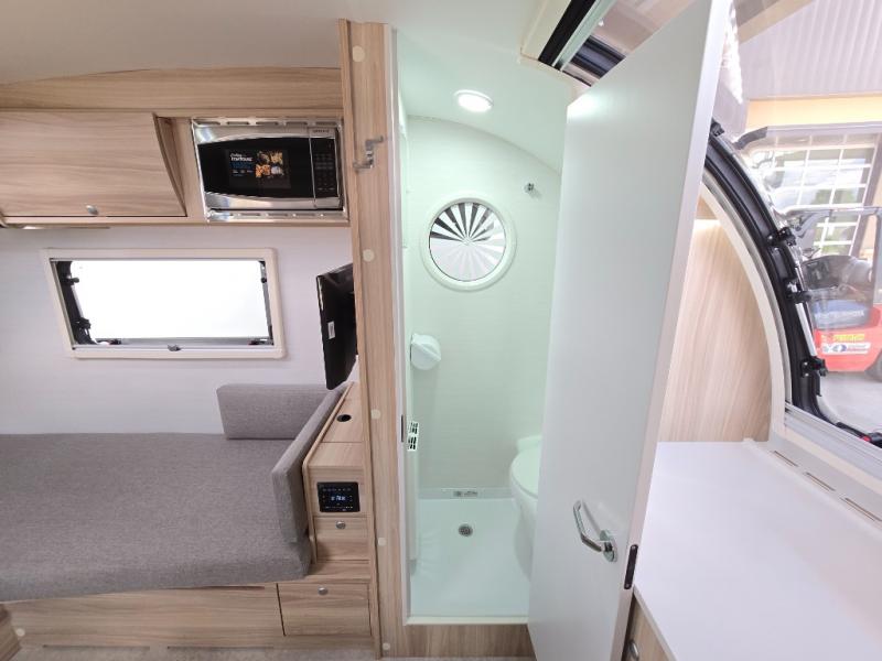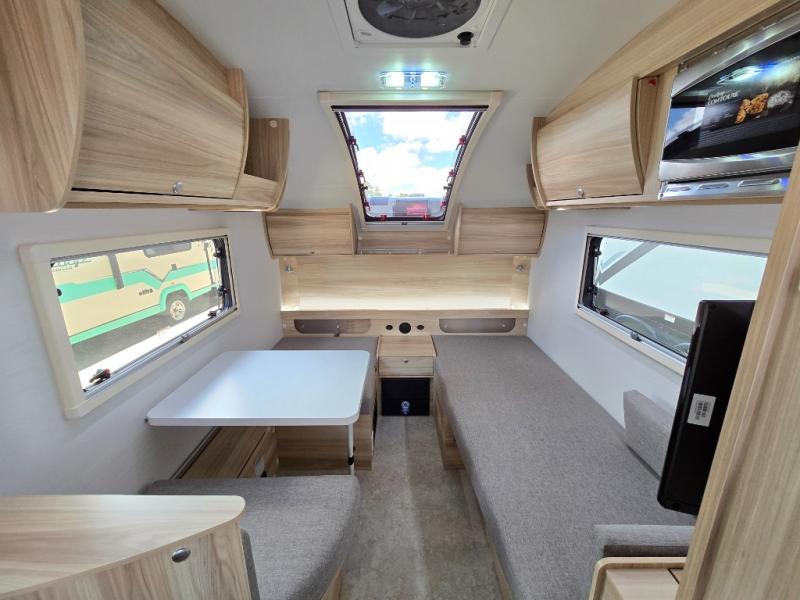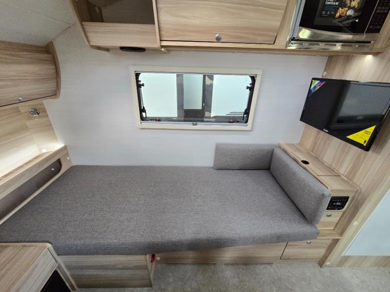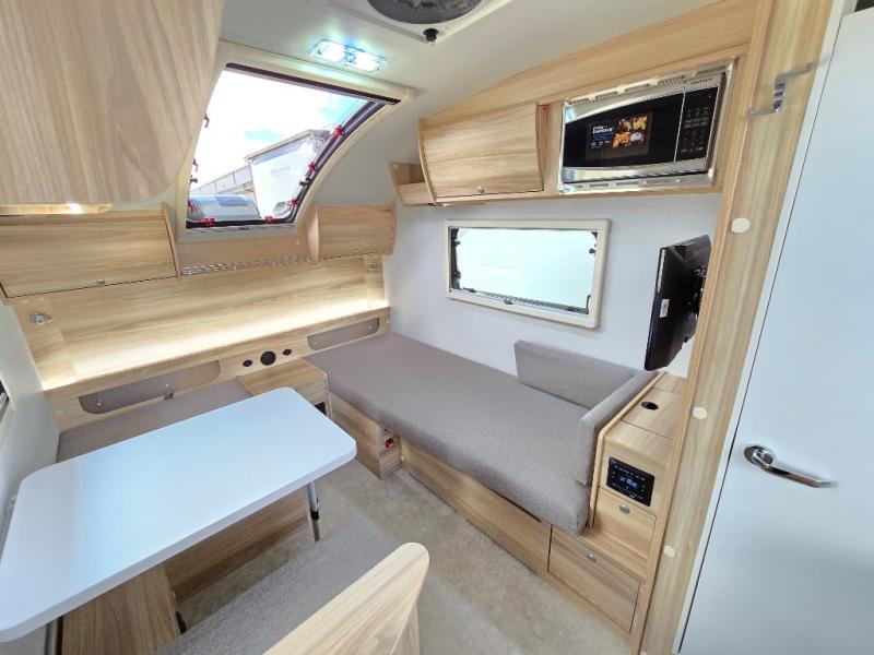 You're going to love camping in this teardrop clamshell trailer! Once you arrive at the campground, you can make lunch on the exterior rear hatch kitchen. There is a two burner glass-top stove and a 45L 12-volt cooler here to quickly make lunch and grab a cold drink. The interior 5 cu. ft. 12-volt compressor refrigerator will provide more food storage, and an optional microwave can be added inside for the option to heat up quick meals indoors. You're sure to get a great night's rest on the twin-size bed, and the booth dinette can convert to a second twin-size bed so you can sleep two comfortably. The optional Black Canyon Upgrade can be added that includes a solar upgrade to dual 190W panels, holding tank heaters and underglow lights. And if you're in the market for a more traditional touring style, the optional Classic Touring Edition may be perfect for you; the Black Canyon Upgrade is not available with this package.