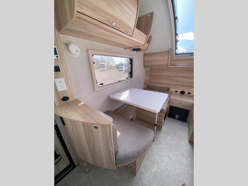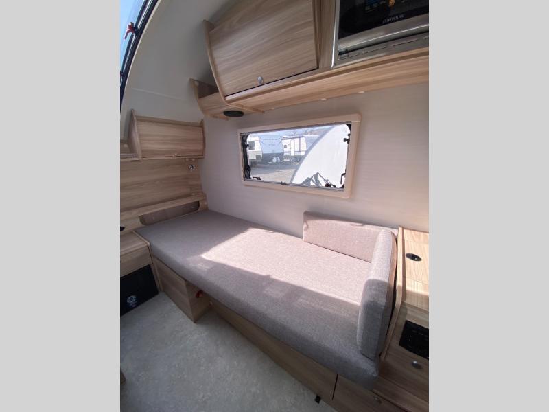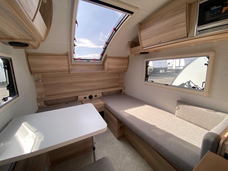 If you enjoy lightweight camping, this teardrop trailer is for you! Everything you need for trips to the lake will be right there with you, including a convenient wet bath with a cassette toilet. The twin bed set up gives you cozy sleeping space, and they can convert to a dinette on one side with extra seating on the other side! There are stargazer windows to give you great views of your surroundings, and the open floorplan will have you feeling right at home. A glass top sink and two burner cooktop combo will let you cook meals each day, and the 5.0 cu. ft. 12V compressor refrigerator will be perfect for perishables. If the optional Black Canyon upgrade is chosen, the tongue weight will be 386 lbs. and the gross dry weight will be 2,729 lbs. See dealer for more details!