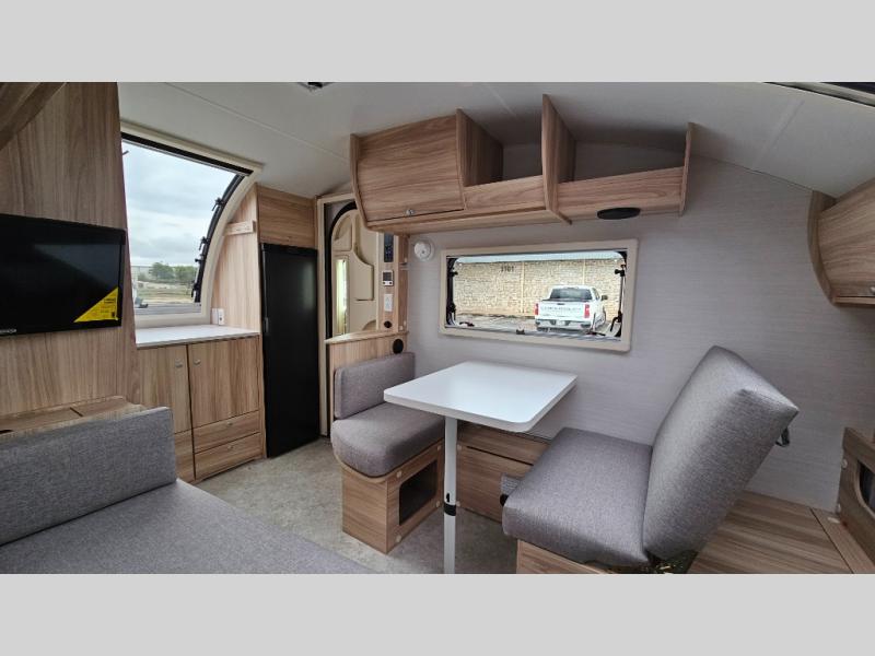 You're going to love camping in this teardrop clamshell trailer! Once you arrive at the campground, you can make lunch on the exterior rear hatch kitchen. There is a two burner glass-top stove and a 45L 12-volt cooler here to quickly make lunch and grab a cold drink. The interior 5 cu. ft. 12-volt compressor refrigerator will provide more food storage, and an optional microwave can be added inside for the option to heat up quick meals indoors. You're sure to get a great night's rest on the twin-size bed, and the booth dinette can convert to a second twin-size bed so you can sleep two comfortably. The optional Black Canyon Upgrade can be added that includes a solar upgrade to dual 190W panels, holding tank heaters and underglow lights. And if you're in the market for a more traditional touring style, the optional Classic Touring Edition may be perfect for you; the Black Canyon Upgrade is not available with this package.