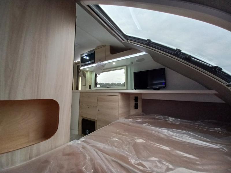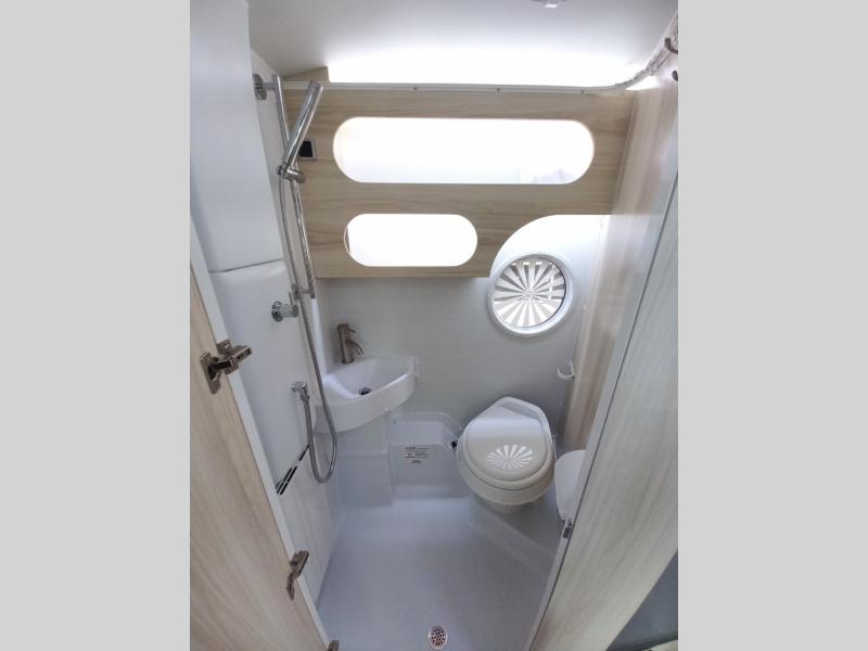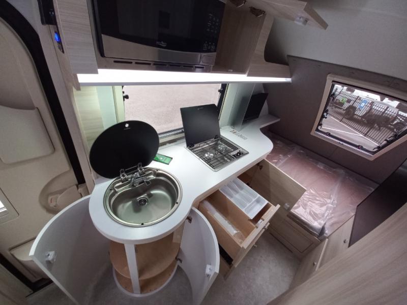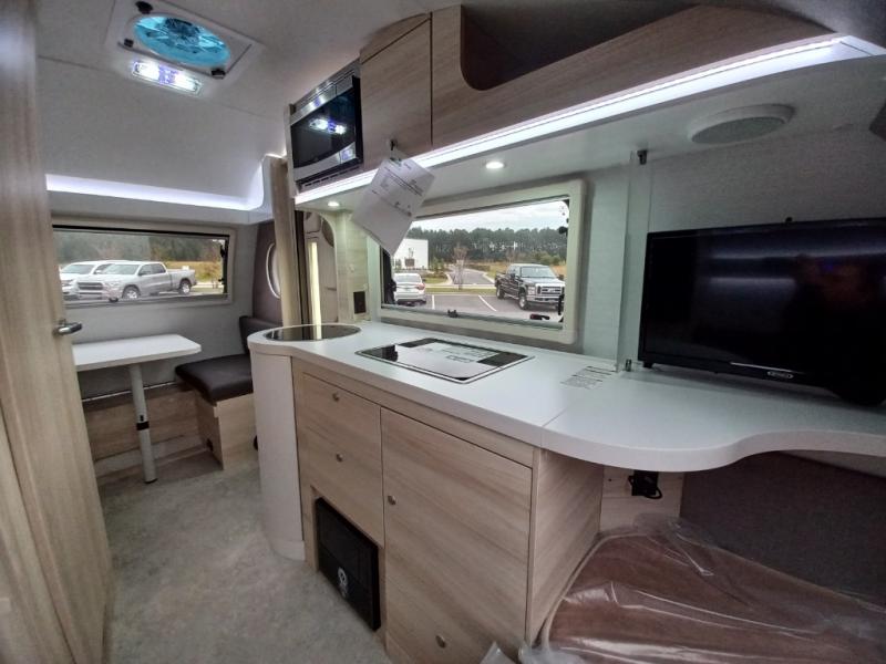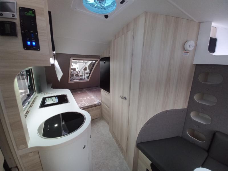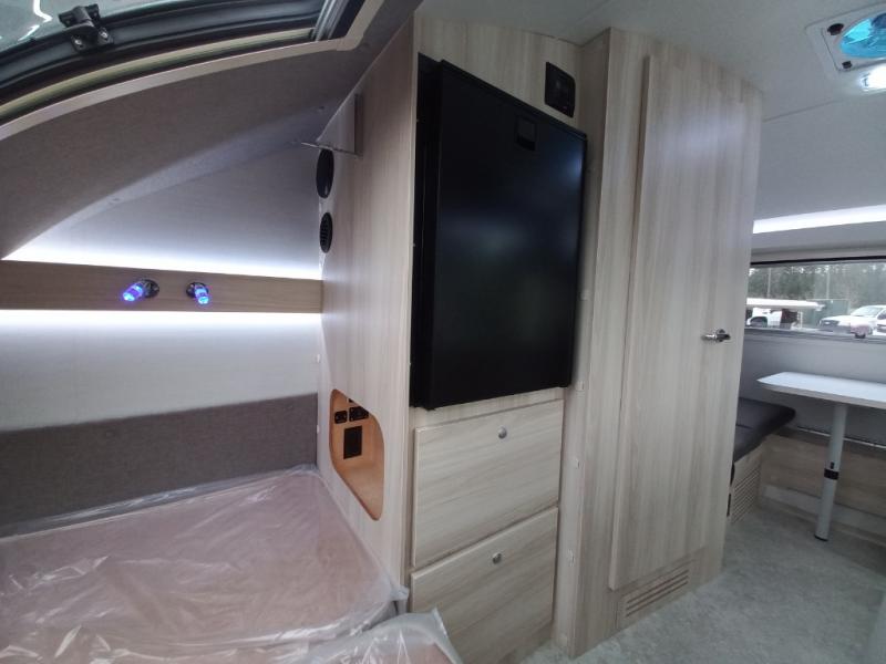 This teardrop trailer offers sleeping space for three with two sleeping areas; one up front and one in the rear. The dinette allows you to eat and relax during the day, and at night this space becomes sleeping space for one. The queen-size sleeping area is located on the opposite side with the wet bath in between for convenience for all. The galley kitchen will give the cook a place to make warm meals and store leftovers in the 4.6 cu. ft. fridge. Everyone can watch the 24" TV through the Bluetooth media center before bedtime, or in the morning as you all plan your next activity. And the Alde central heat and Alde FLOW instant hot water system as well as central air conditioning will keep you comfortable where ever you setup. If you enjoy more off-road type camping, consider the optional