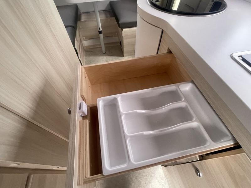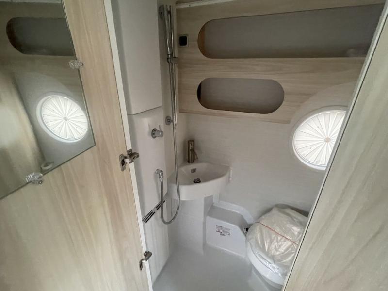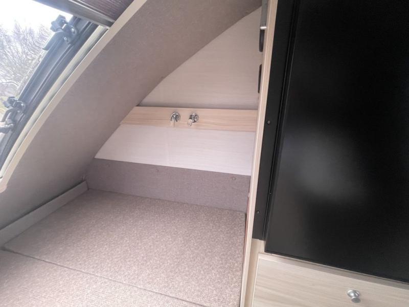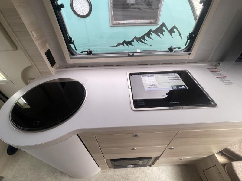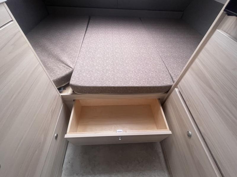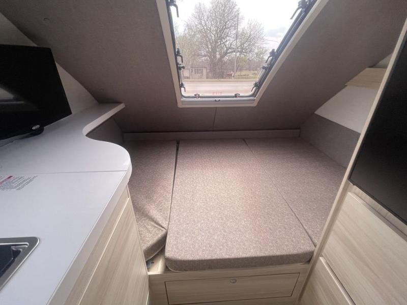 This teardrop trailer offers sleeping space for three with two sleeping areas; one up front and one in the rear. The dinette allows you to eat and relax during the day, and at night this space becomes sleeping space for one. And if you're needing even more sleeping space, you can choose the optional bunk floorplan! The queen-size sleeping area is located on the opposite side with the wet bath in between for convenience for all. The galley kitchen will give the cook a place to make warm meals and store leftovers in the 4.6 cu. ft. 12V compressor refrigerator. Everyone can watch the 24" TV through the Bluetooth media center before bedtime, or in the morning as you all plan your next activity. And the Alde central heating/hot water system, as well as central air conditioning will keep you comfortable where ever you set up. The Black Canyon optional package will have a dry tongue weight of 380 lbs., and a total gross dry weight of 2,946 lbs. The optional Classic package will have a tongue weight will be 355 lbs. and the total gross weight will be 2,915 lbs.