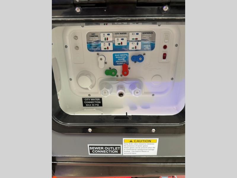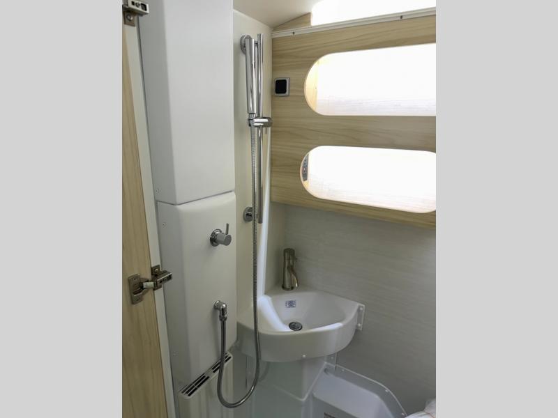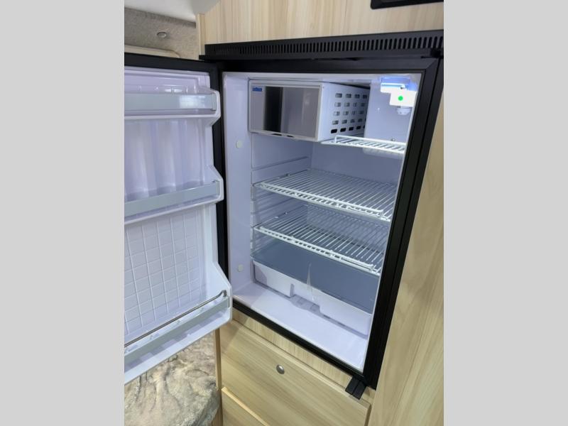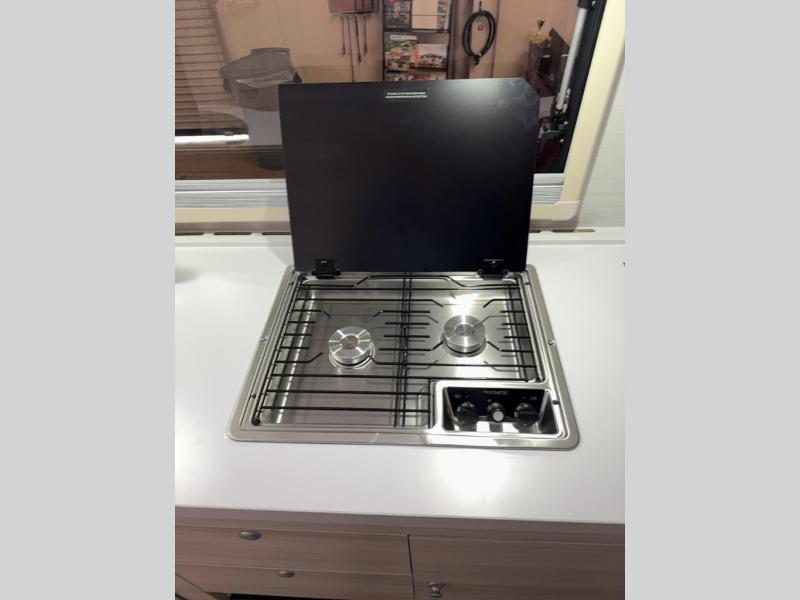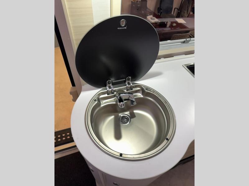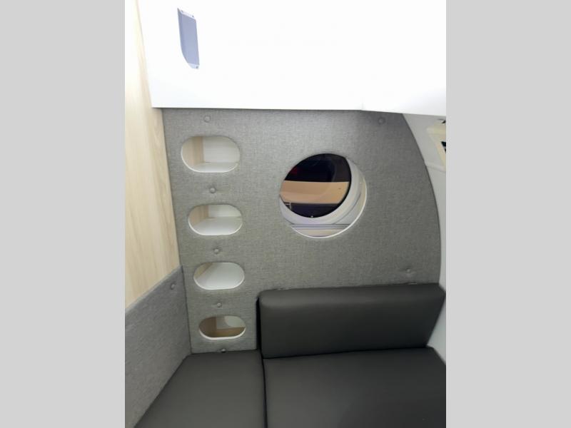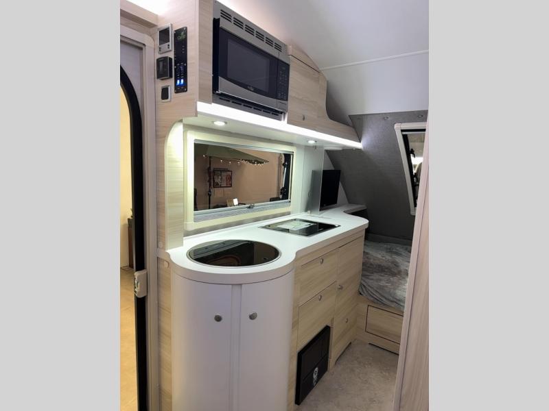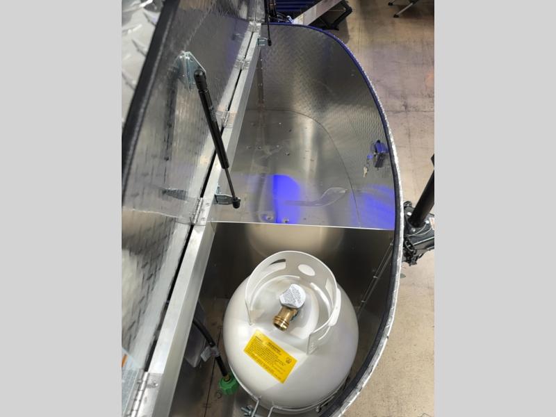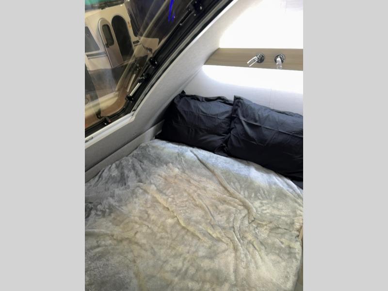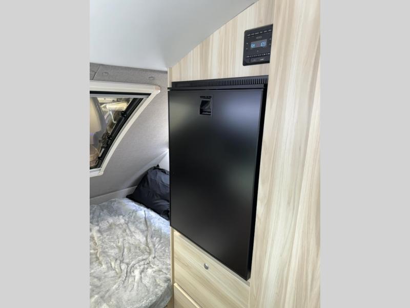 This teardrop trailer offers sleeping space for three with two sleeping areas; one up front and one in the rear. The dinette allows you to eat and relax during the day, and at night this space becomes sleeping space for one. And if you're needing even more sleeping space, you can choose the optional hidden bunk floorplan! The queen-size sleeping area is located on the opposite side with the wet bath in between for convenience for all. The galley kitchen will give the cook a place to make warm meals and store leftovers in the 4.6 cu. ft. 12V compressor refrigerator. Everyone can watch the 24" TV through the Bluetooth media center before bedtime, or in the morning as you all plan your next activity. And the Alde central heating/hot water system, as well as central air conditioning will keep you comfortable where ever you set up. The Black Canyon optional package will have a dry tongue weight of 380 lbs., and a total gross dry weight of 2,946 lbs. The optional Classic package will have a tongue weight will be 355 lbs. and the total gross weight will be 2,915 lbs.