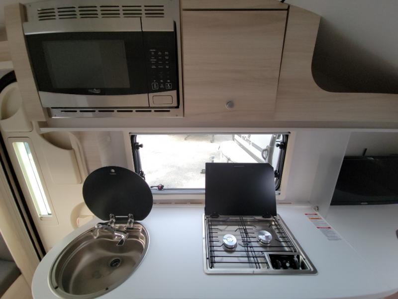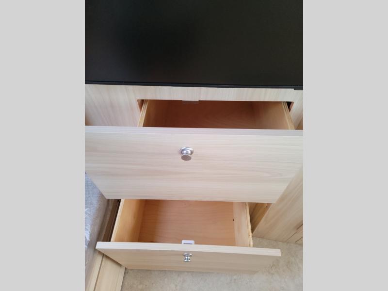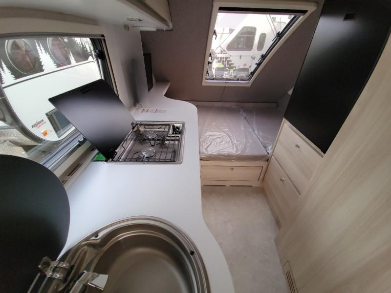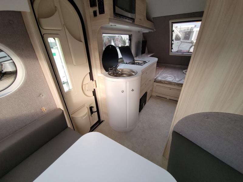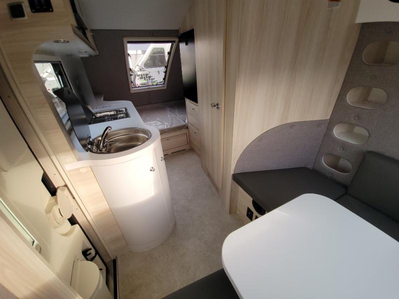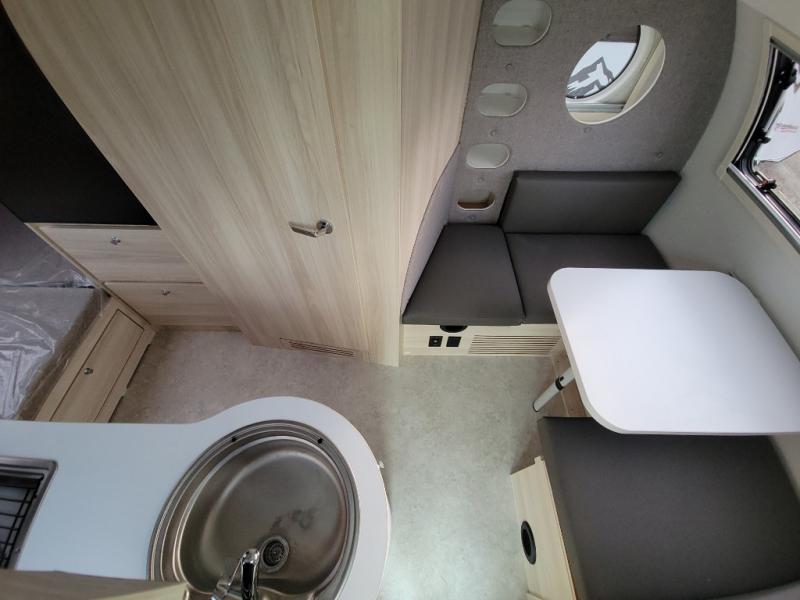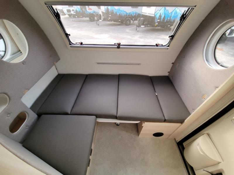 This teardrop trailer offers sleeping space for three with two sleeping areas; one up front and one in the rear. The dinette allows you to eat and relax during the day, and at night this space becomes sleeping space for one. And if you're needing even more sleeping space, you can choose the optional bunk floorplan! The queen-size sleeping area is located on the opposite side with the wet bath in between for convenience for all. The galley kitchen will give the cook a place to make warm meals and store leftovers in the 4.6 cu. ft. 12V compressor refrigerator. Everyone can watch the 24" TV through the Bluetooth media center before bedtime, or in the morning as you all plan your next activity. And the Alde central heating/hot water system, as well as central air conditioning will keep you comfortable where ever you set up. The Black Canyon optional package will have a dry tongue weight of 380 lbs., and a total gross dry weight of 2,946 lbs. The optional Classic package will have a tongue weight will be 355 lbs. and the total gross weight will be 2,915 lbs.