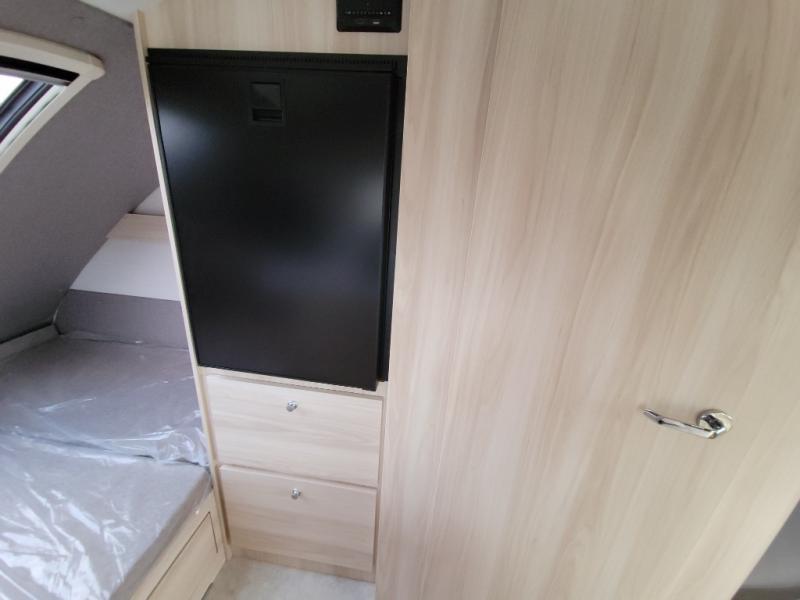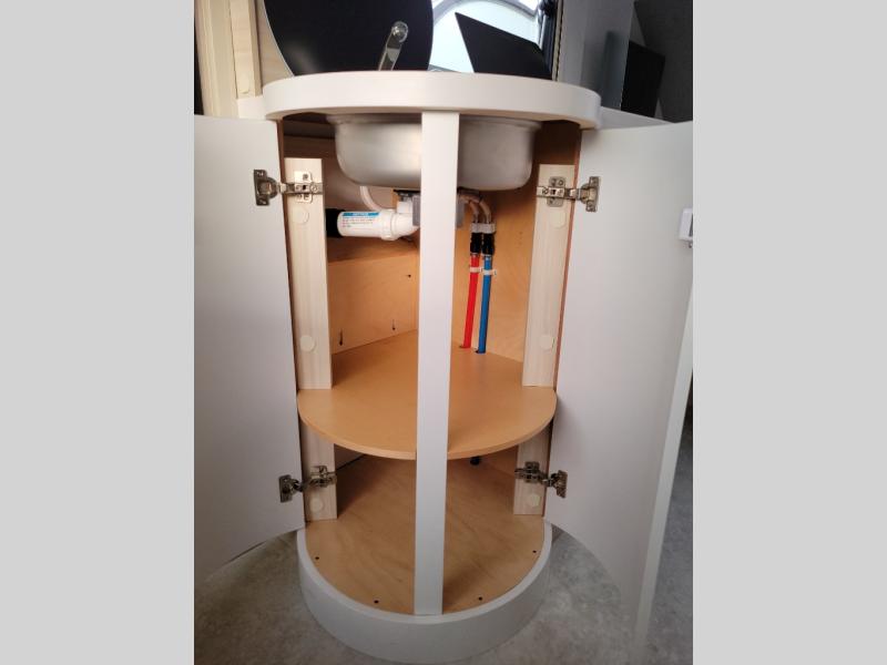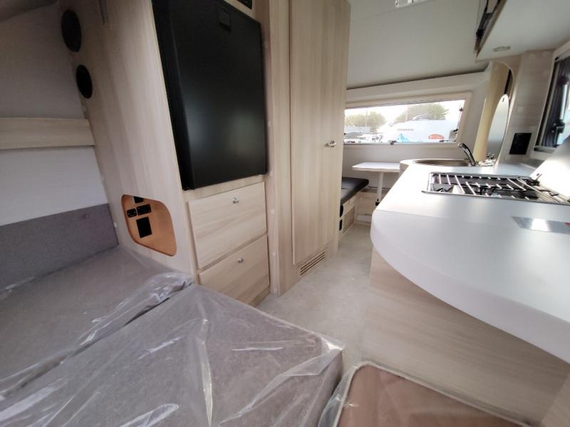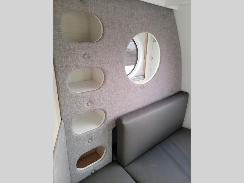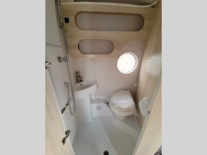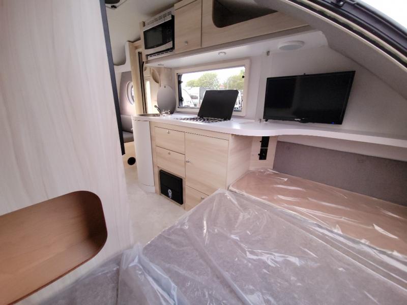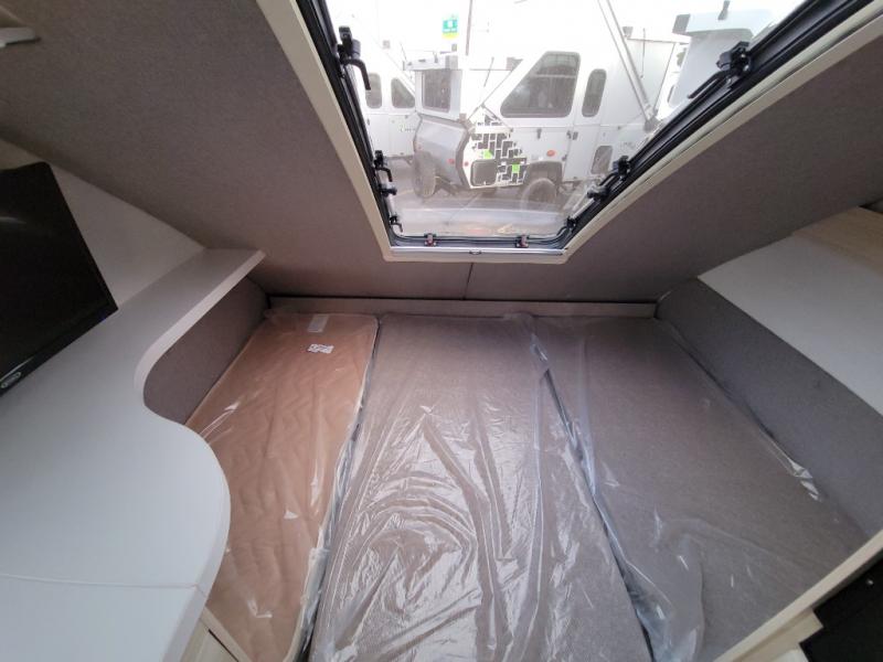 This teardrop trailer offers sleeping space for three with two sleeping areas; one up front and one in the rear. The dinette allows you to eat and relax during the day, and at night this space becomes sleeping space for one. And if you're needing even more sleeping space, you can choose the optional bunk floorplan! The queen-size sleeping area is located on the opposite side with the wet bath in between for convenience for all. The galley kitchen will give the cook a place to make warm meals and store leftovers in the 4.6 cu. ft. 12V compressor refrigerator. Everyone can watch the 24" TV through the Bluetooth media center before bedtime, or in the morning as you all plan your next activity. And the Alde central heating/hot water system, as well as central air conditioning will keep you comfortable where ever you set up. The Black Canyon optional package will have a dry tongue weight of 380 lbs., and a total gross dry weight of 2,946 lbs. The optional Classic package will have a tongue weight will be 355 lbs. and the total gross weight will be 2,915 lbs.
