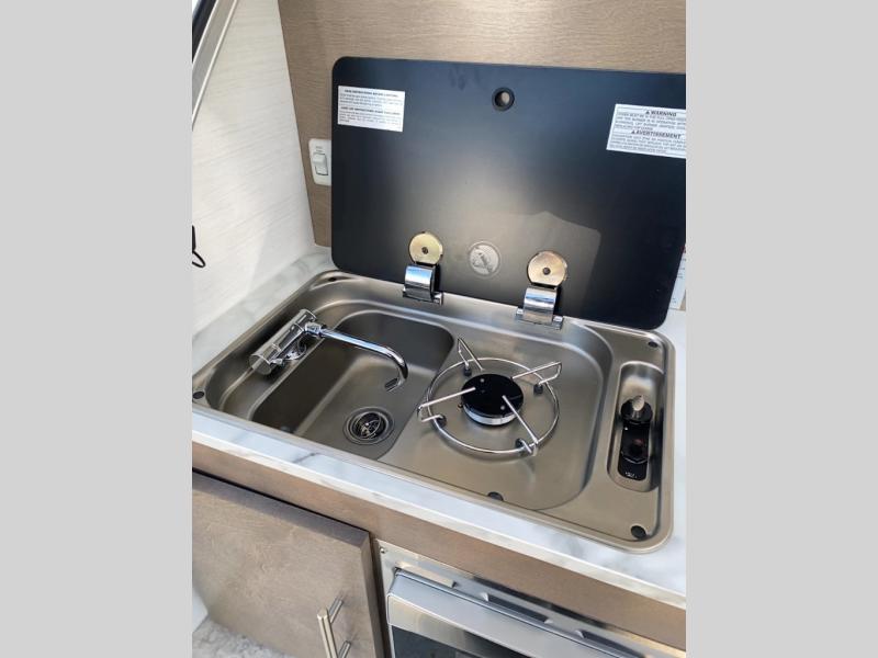 With any nuCamp RV TAG teardrop trailer, you can bring some of the comforts of home with you as you easily tow this lightweight trailer to the campgrounds. The outdoor kitchen includes a stainless steel sink and two-burner stove so you won't have to cook over a campfire each day. Inside, you'll find a composite floor, deluxe Amish cabinetry, sleeping accommodations, and a power roof fan to keep you comfortable. You will also appreciate the Convenience Package that comes with a 180-watt solar panel, a portable Bluetooth speaker, a 100 Ah 12-volt Lithium battery, and more!