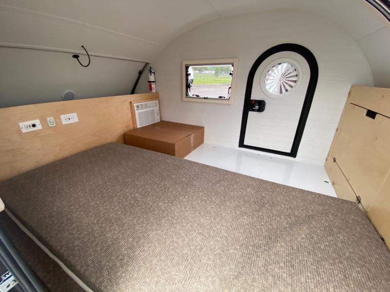 At the end of a long week, it will be easier than ever to hitch up this single axle teardrop trailer and head out! There are dual entry doors with porthole windows so you can see outdoors, plus there is a front stargazer window with a shade. The 3-speed fan and air conditioner will keep you comfortable all summer long, and there are 12-volt/110 USB outlets to keep your phone or camera charged. Once you've opened the rear hatch door, you can whip up some eggs on your electric griddle you brought along, and there is space under the countertop for your cooler or other essentials.