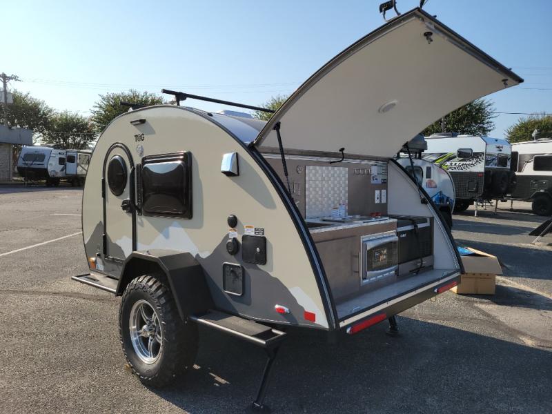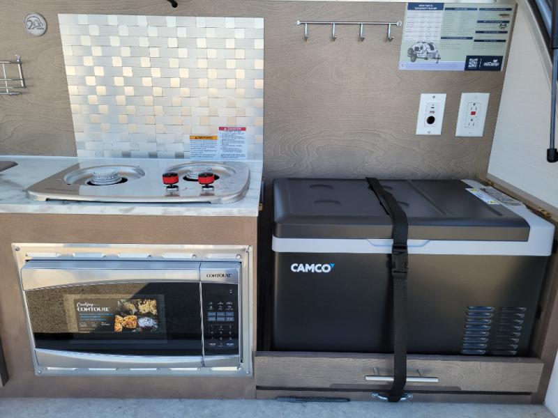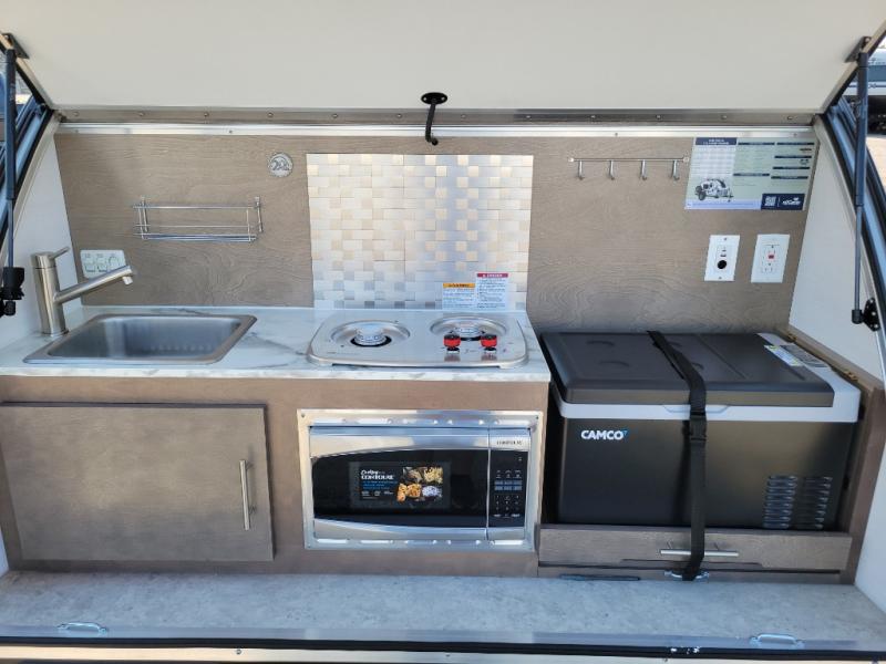 With any nuCamp RV TAG teardrop trailer, you can bring some of the comforts of home with you as you easily tow this lightweight trailer to the campgrounds. The outdoor kitchen includes a stainless steel sink and two-burner stove so you won't have to cook over a campfire each day. Inside, you'll find a composite floor, deluxe Amish cabinetry, sleeping accommodations, and a power roof fan to keep you comfortable. You will also appreciate the Convenience Package that comes with a 180-watt solar panel, a portable Bluetooth speaker, a 100 Ah 12-volt Lithium battery, and more!