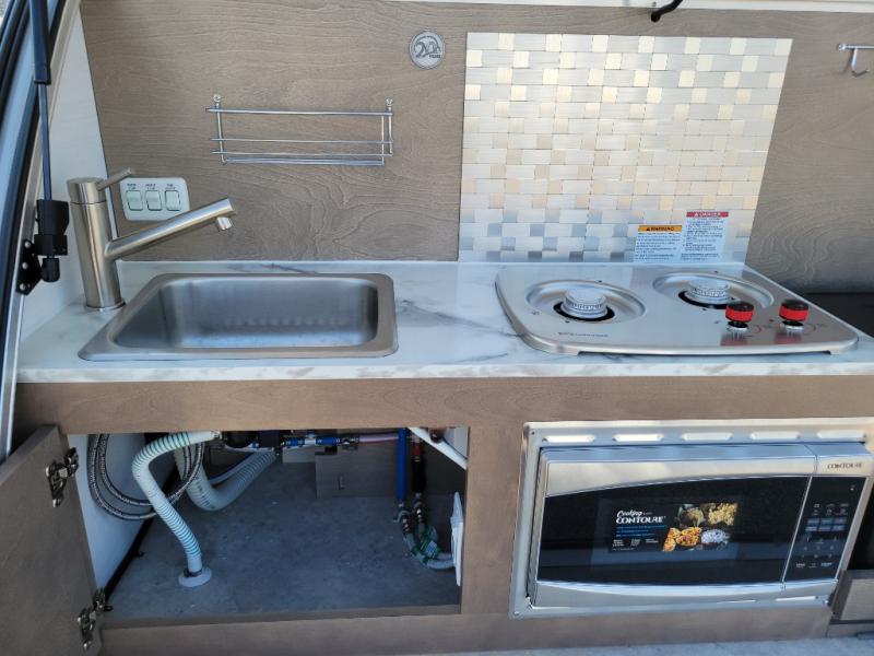 When you are looking to upgrade from a tent, this TAG XL might be your solution to outdoor fun with inside sleeping arrangements for two and an outdoor kitchen! This 20th Anniversary limited edition features exclusive sidewall color and anniversary graphics, premium anniversary interior details, and the Boondock Black Canyon upgrade included! This upgrade features an additional 120-watt solar panel, a holding tank heater, underglow lights, and more! You can enter from either side of this camper to enjoy your own queen-size bed as you look at the stars each night through the large front stargazer window. The interior also offers an air conditioner, under-bed storage, and cargo pouches for your belongings.