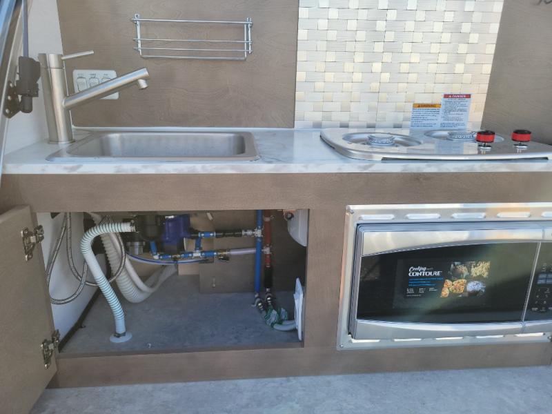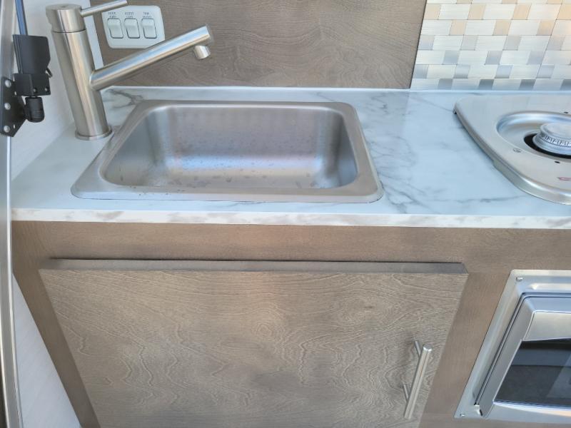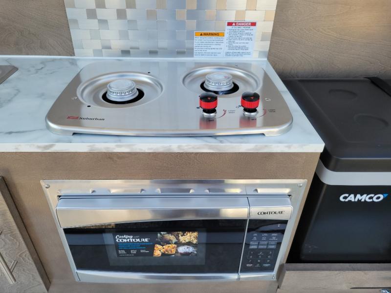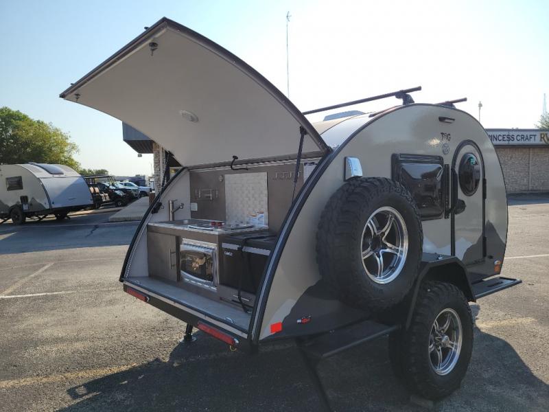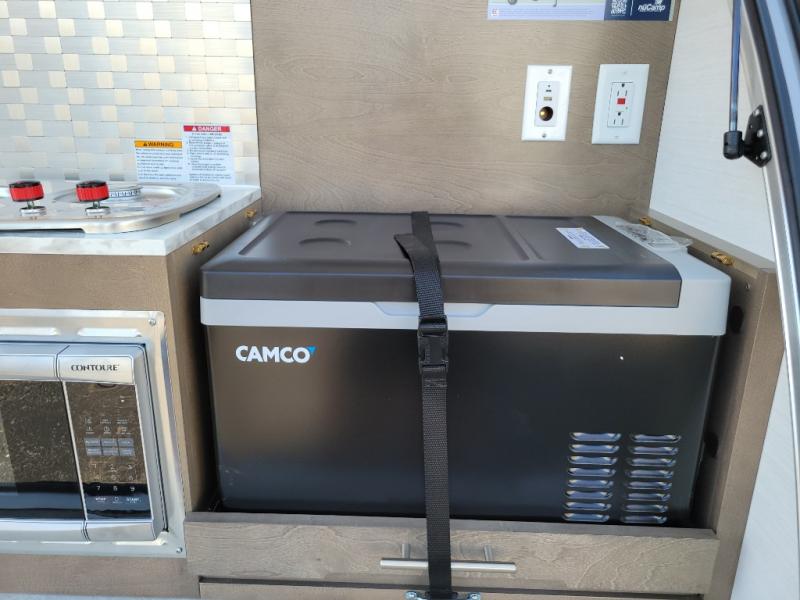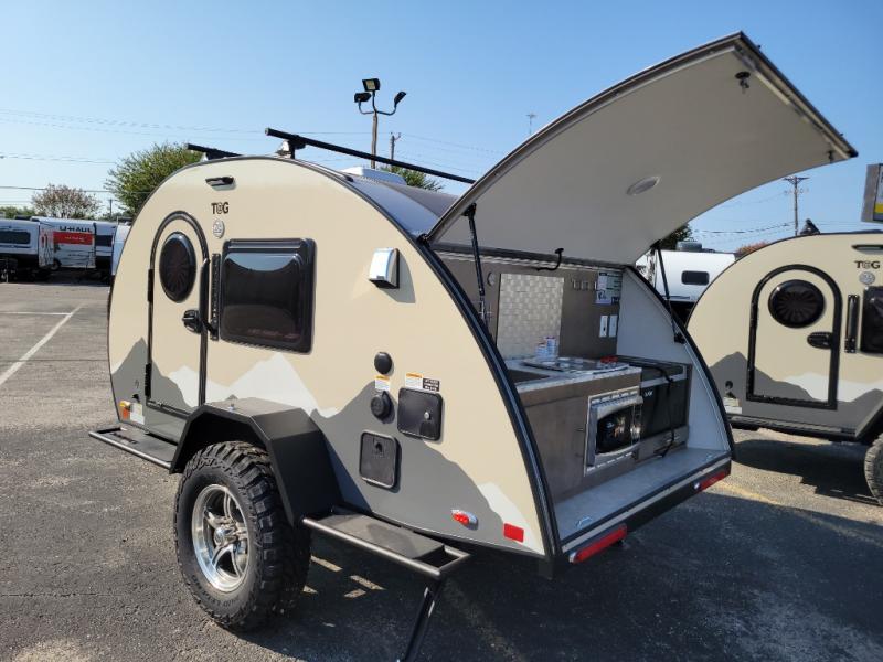 With any nuCamp RV TAG teardrop trailer, you can bring some of the comforts of home with you as you easily tow this lightweight trailer to the campgrounds. The outdoor kitchen includes a stainless steel sink and two-burner stove so you won't have to cook over a campfire each day. Inside, you'll find a composite floor, deluxe Amish cabinetry, sleeping accommodations, and a power roof fan to keep you comfortable. You will also appreciate the Convenience Package that comes with a 180-watt solar panel, a portable Bluetooth speaker, a 100 Ah 12-volt Lithium battery, and more!