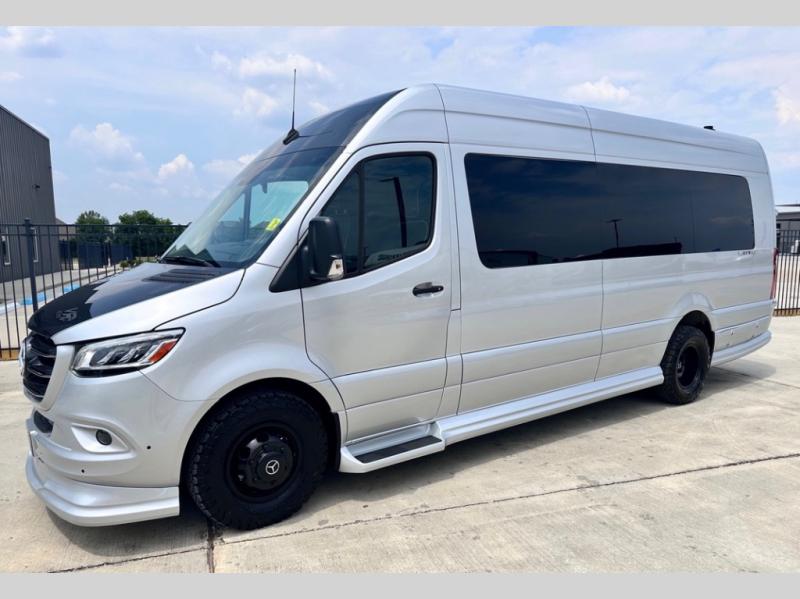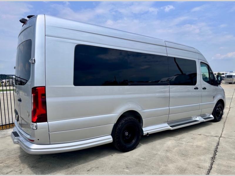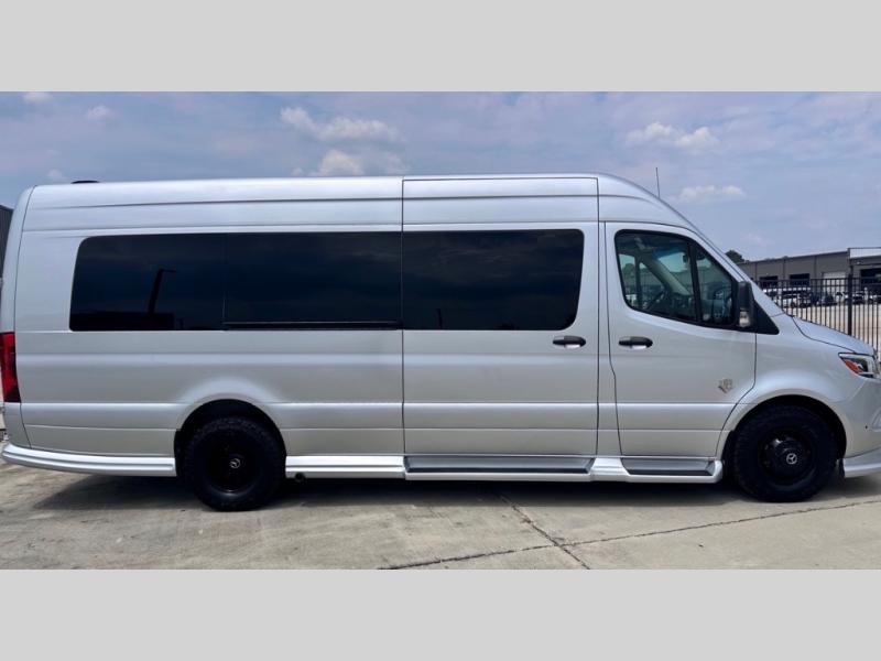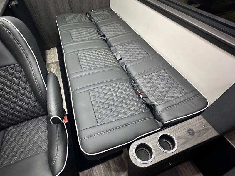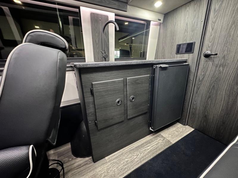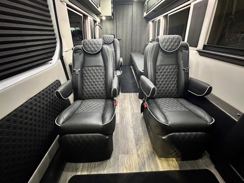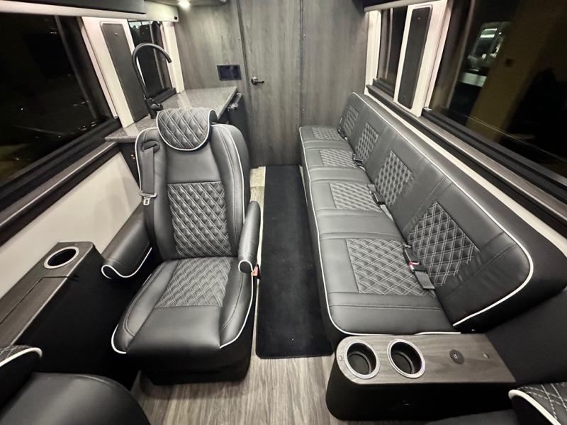 Are looking for a van to take on day trips? This coach will seat nine perfectly with five captain's chairs and a sofa/foldout bed, which will double as sleeping space for one to two if you need to take it overnight. The kitchenette across from the sofa includes a sink to freshen up with, and there is a 3.75 cu. ft. 12V refrigerator for cold drinks. A rear toilet includes a privacy door and there is luggage storage for added convenience. This model also includes a 32 gallon black/grey combination tank, and an optional partition wall can be added for chauffeur driven customer requirements!
