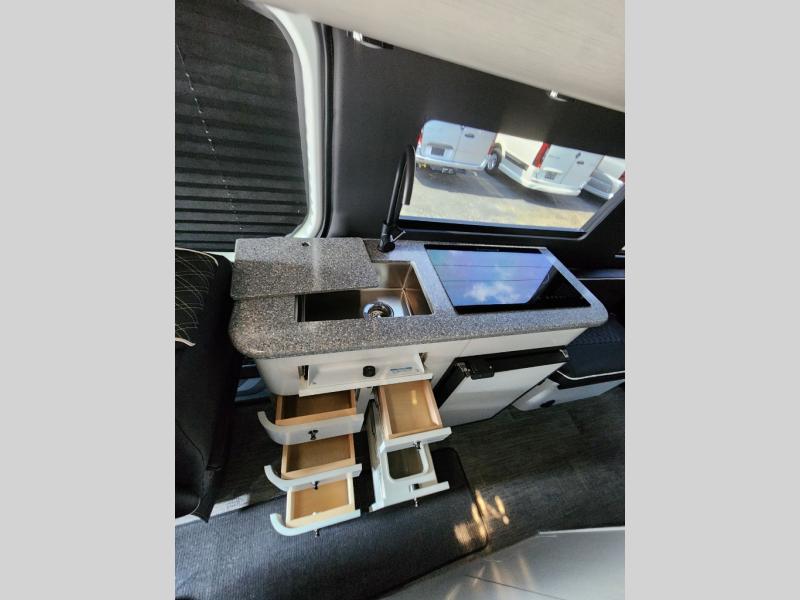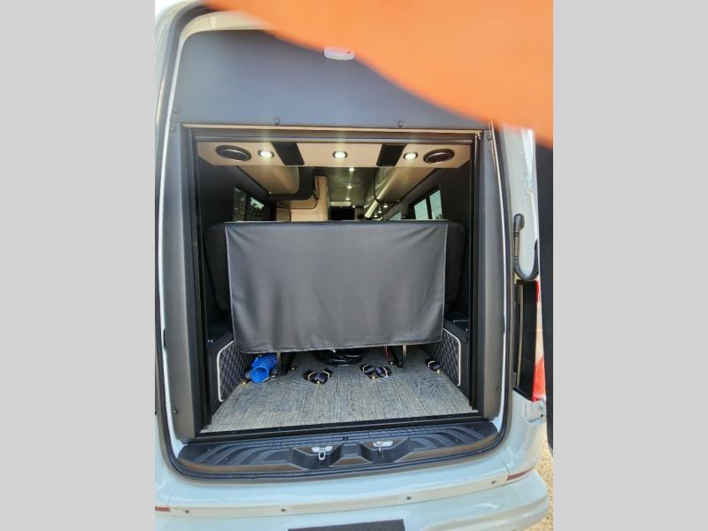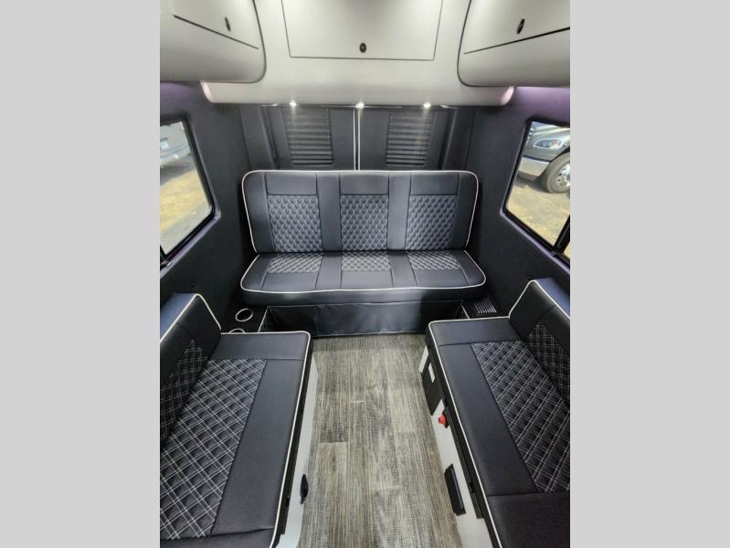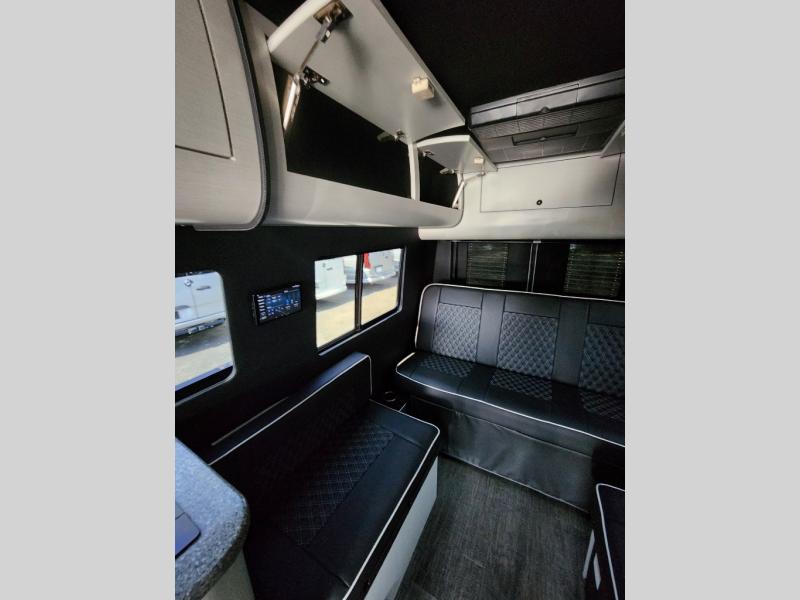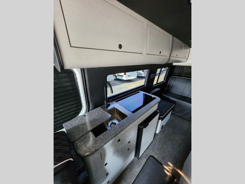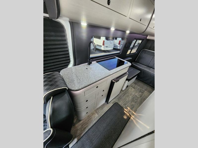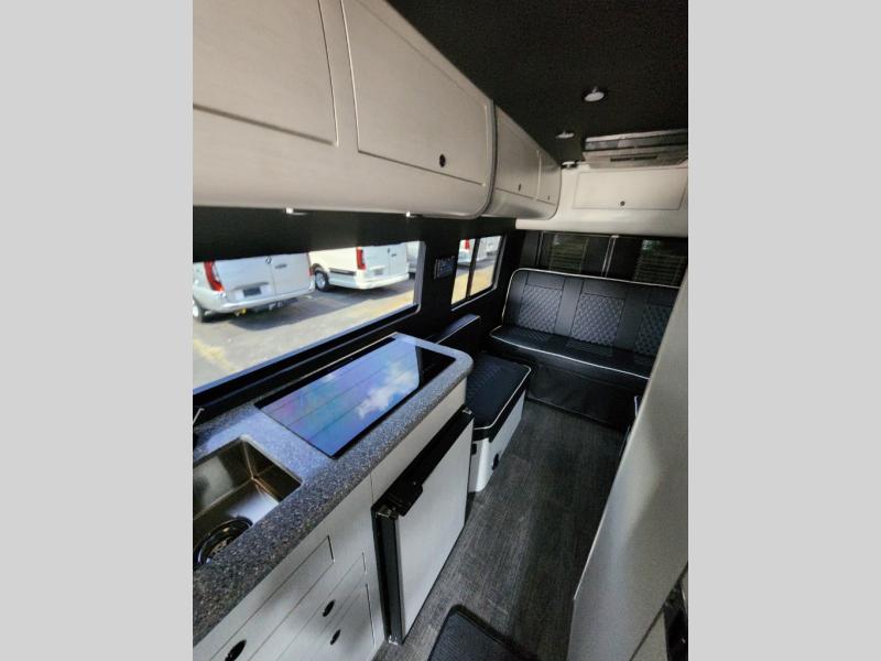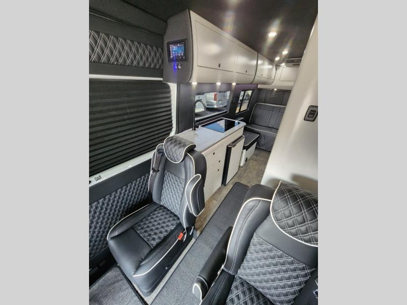 With any V-RV Class B diesel motorhome by OGV Luxury Coach, you will enjoy a smooth drive and innovative features to make van life easier than you think. They are constructed with the industry's best insulation package, including hush matts on all surfaces except the windows. The Anywhere Package comes with a 1080 Ah lithium battery, 3,000 watt inverter, 340 watts of auxiliary solar power, and a dual alternator with a Wakespeed Charge controller for endless power. You will also appreciate the Mercedes-Benz suspension bundle (RV1) with Sumo Springs, added safety features, and a rear view camera system for hassle-free parking. Automotive grade fabrics come standard inside, along with side and rear screen doors, custom woodwork with satin finish, multiple 110V dual outlets, and a rear JL audio entertainment system to ensure you'll never go bored. Each model is also available with AWD, which will be perfect if you plan to travel tougher terrain; see dealer for more details!