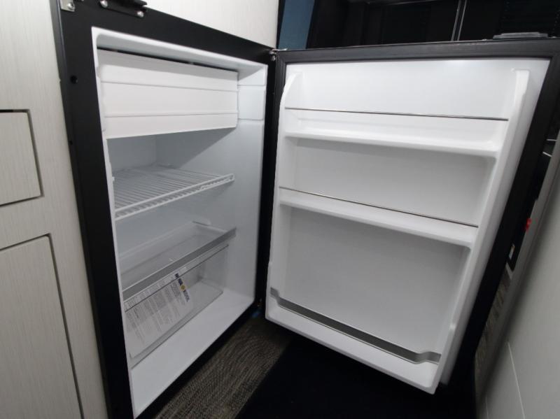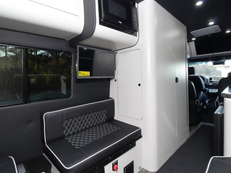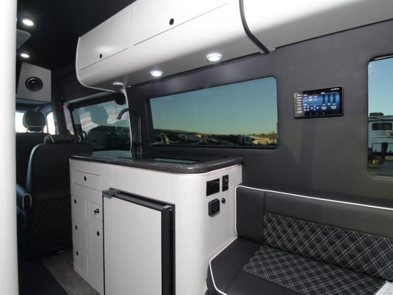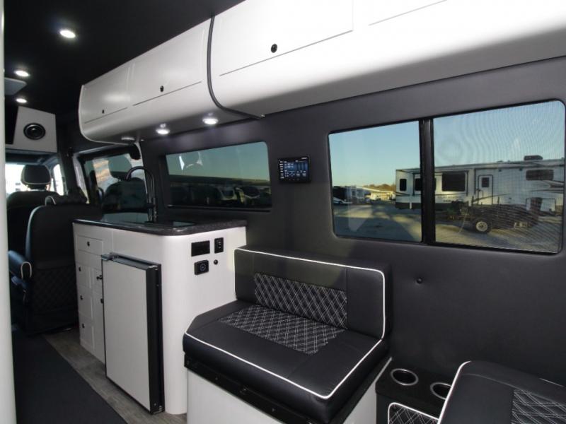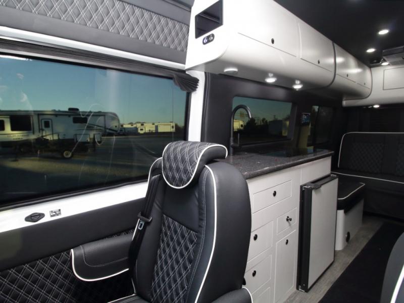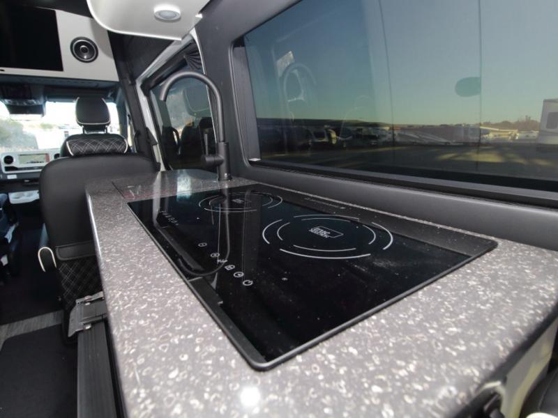 The wet bath ensures you stay refreshed wherever the journey takes you, and the double induction cooktop and stainless steel microwave make cooking a breeze. Store your meals in the 3.75 cu. ft. 12V refrigerator/freezer, and enjoy the added flexibility of a lagun table, ideal for dining or playing cards. With two jump seats, four cab seats, and the rear lounge, this motorhome offers space and comfort for every adventure.