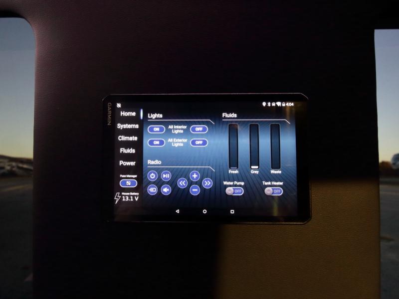 - Power Anywhere: 1080 Ah lithium battery, 3,000-watt inverter, 340 watts of auxiliary solar power, and dual alternators with Wakespeed Charge Controller.