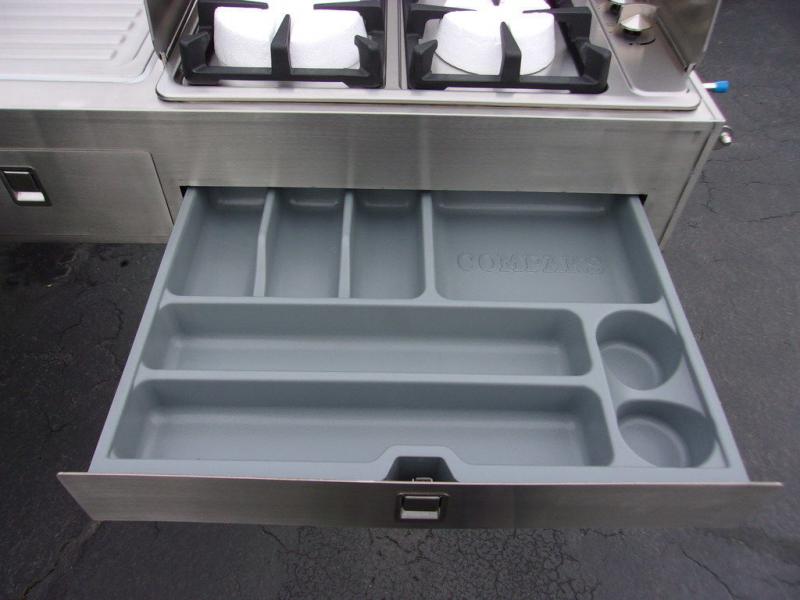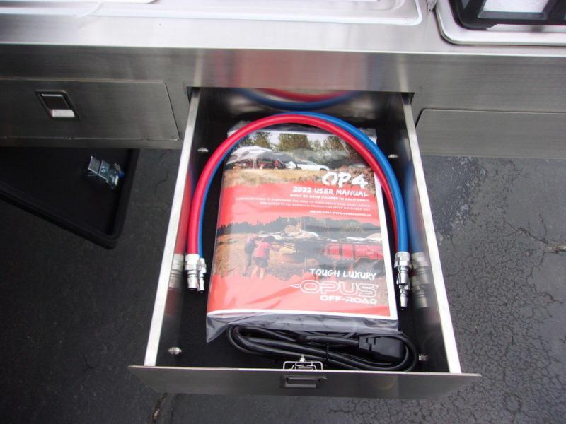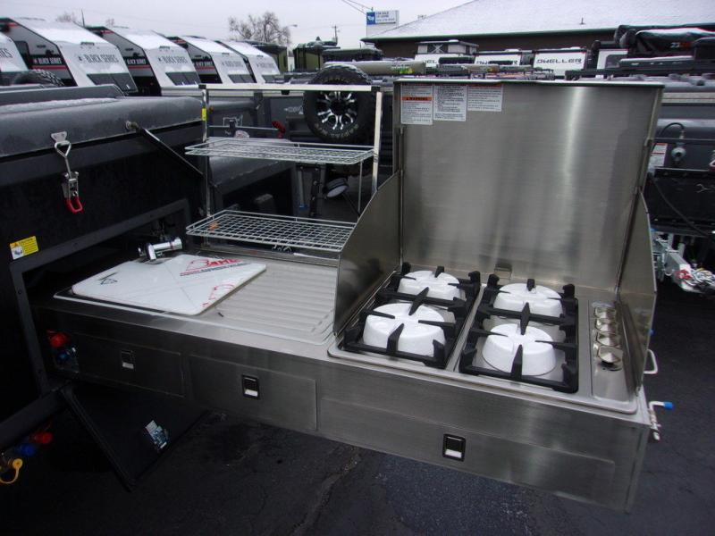 From the rapid deployment of the AIR inflation technology, the tent on this OPUS folding pop-up camper is easily ready in ninety seconds, and all you have to do is open and secure the two double-size tent beds and turn on the switch. You will experience more storage than you thought could be found in a pop-up and on-board water. The cook can whip up a warm meal on the four-burner cooktop within the outside stainless steel kitchen which includes a stainless steel chopping board and pantry at arm's reach, and then you can dine at the U-shaped leatherette lounge that can easily be converted into extra sleeping space for two. There are several windows to open up your space to enjoy the weather, and there are several options to customize your OPUS just like you want.