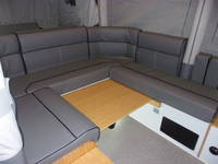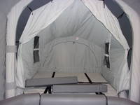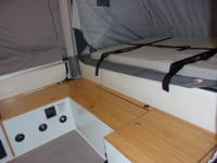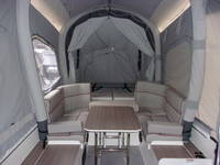 From the rapid deployment of the AIR inflation technology, the tent on this OPUS folding pop-up camper is easily ready in ninety seconds, and all you have to do is open and secure the two double-size tent beds and turn on the switch. You will experience more storage than you thought could be found in a pop-up and on-board water. The cook can whip up a warm meal on the four-burner cooktop within the outside stainless steel kitchen which includes a stainless steel chopping board and pantry at arm's reach, and then you can dine at the U-shaped leatherette lounge that can easily be converted into extra sleeping space for two. There are several windows to open up your space to enjoy the weather, and there are several options to customize your OPUS just like you want.